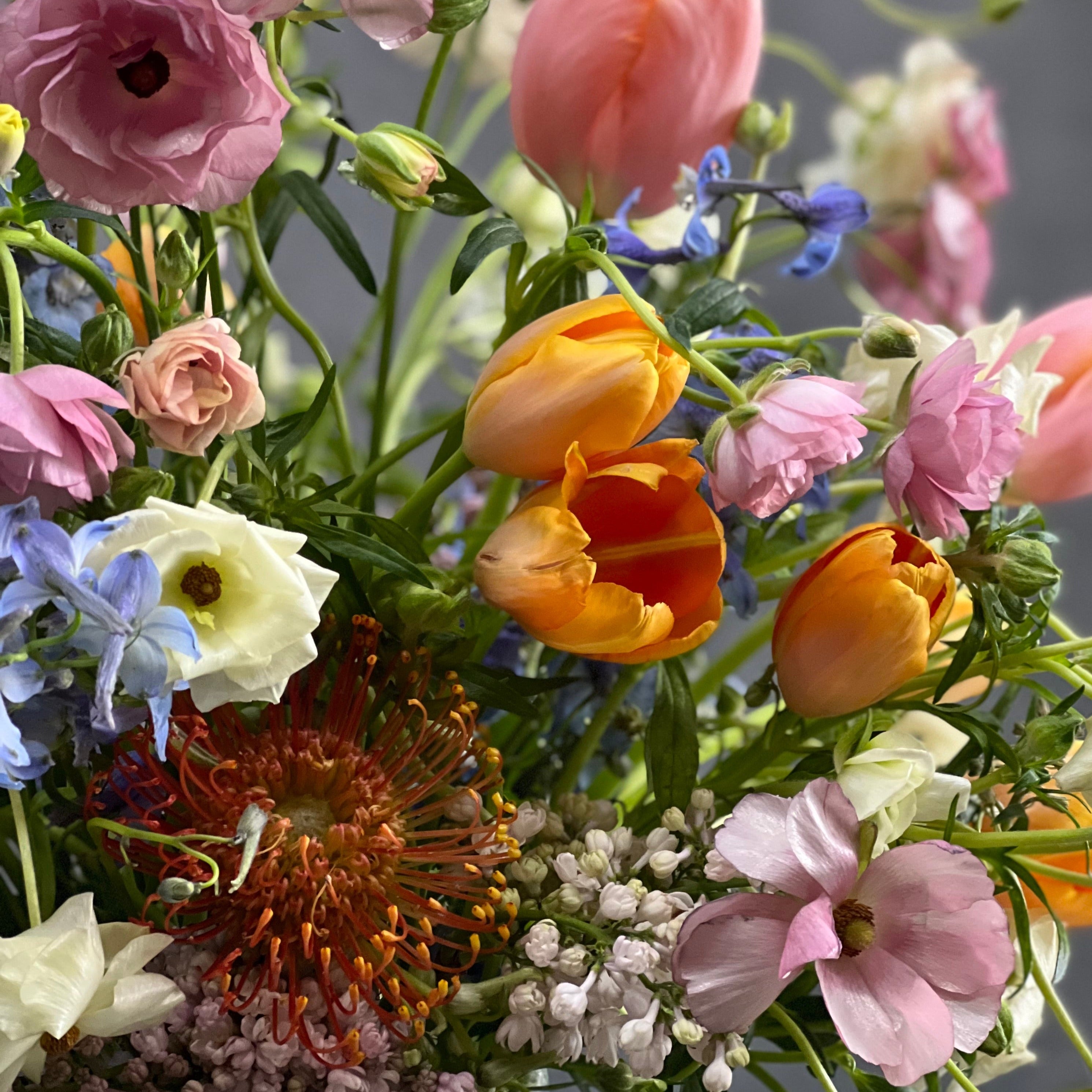 My Beverly Hills Florists presents an unforgettable eye-catching floral arrangement that includes same day delivery. This piece includes imported French tulips and other seasonal flowers that burst with color !