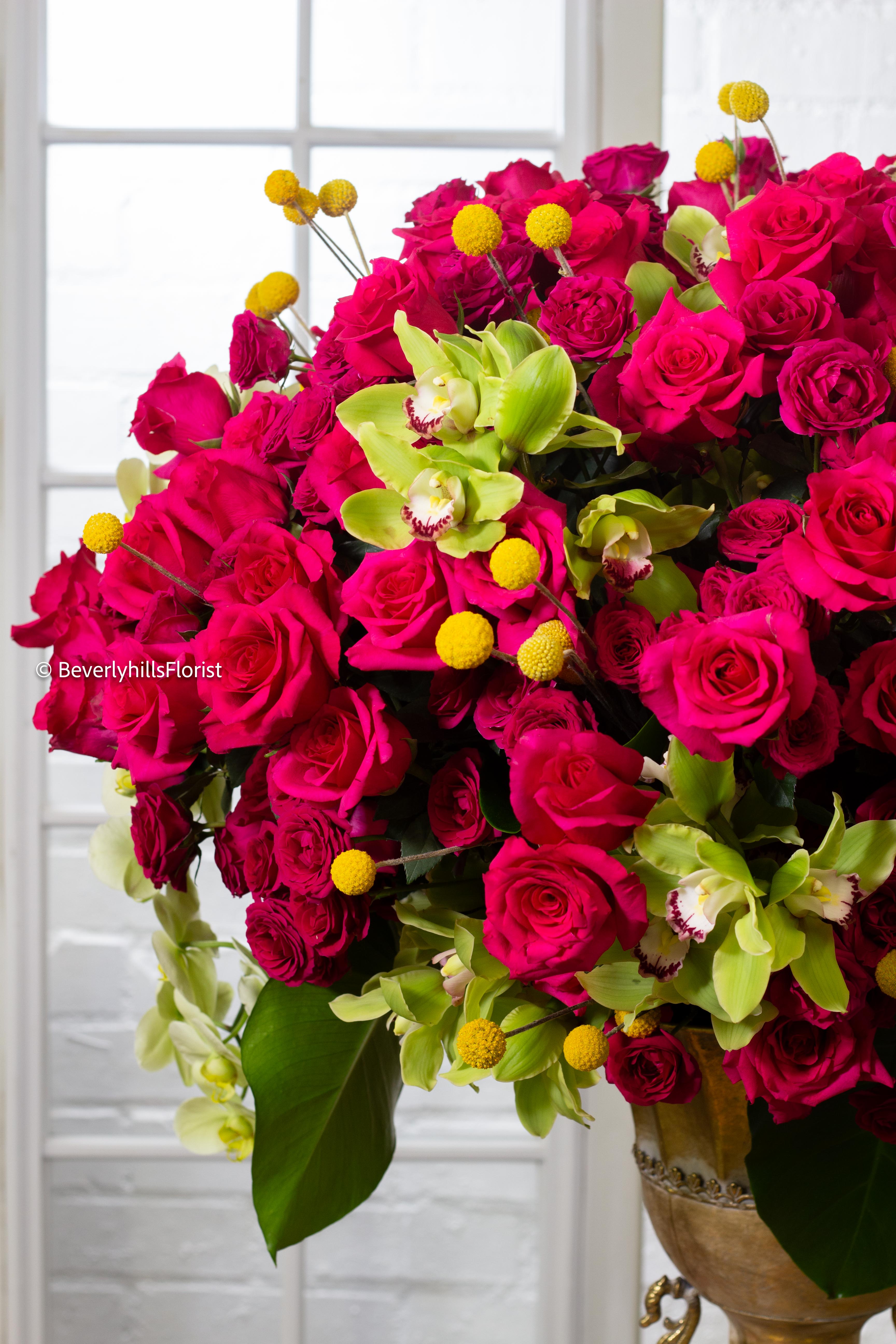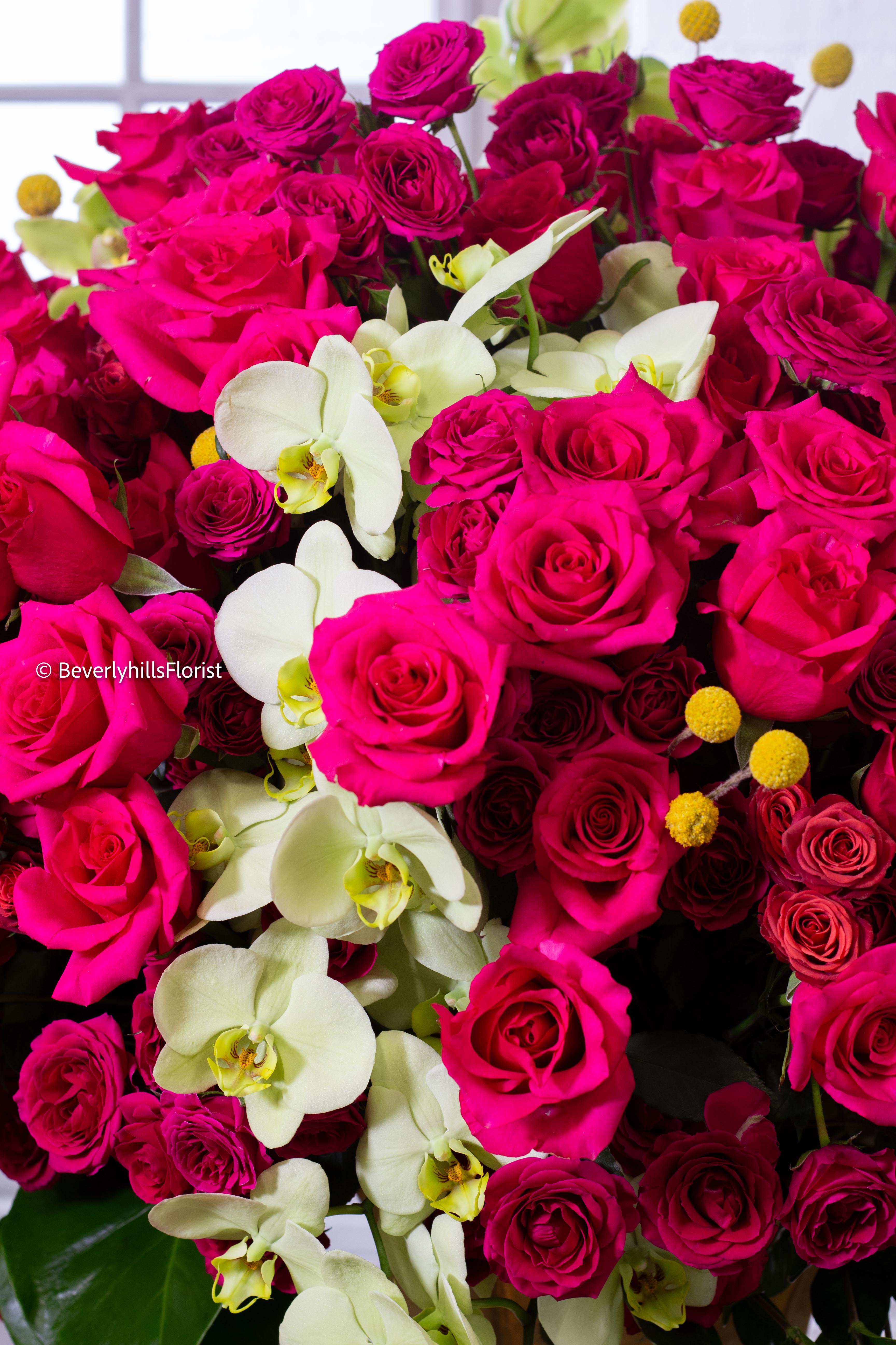 The Amore Roses arrangement exudes elegance with over 500 red and pink Ecuadorian long-stem roses, spray roses, and delicate orchids. Housed in a golden pedestal container, this 40-inch round masterpiece is the ultimate expression of love and devotion. Perfect for grand occasions or romantic gestures, this designer’s choice creation is available for same-day delivery by Beverly Hills Florist.