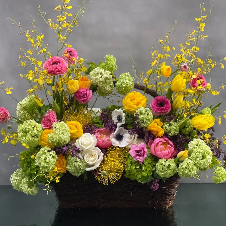 Beverly Hills Florist presents to you this beautiful basket of happiness for same day delivery. This piece will certainly bring a smile to anyone! The basket is filled colorful spring flowers ….. Snowball and green hydrangeas, pink, yellow ranunculus, yellow tulips, lilacs, coral peonies, roses, and seasonal florals.