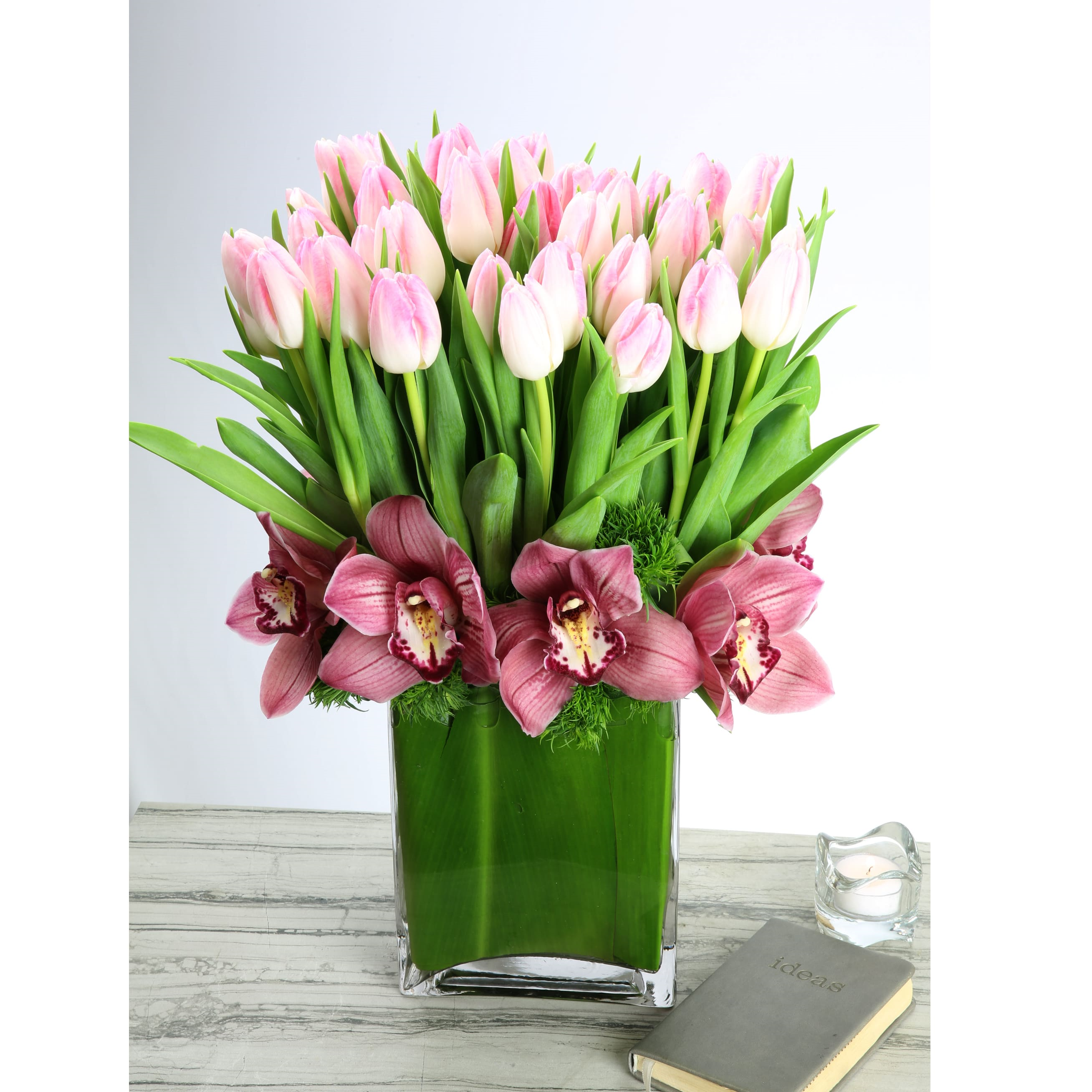 Share the ultimate serenity of 50 pristine light pink Dutch Tulips standing tall in this leaf-lined glass vase, while stunning white Orchids dance at the base. This beautiful design will accent any décor with its elegance and classically timeless beauty.