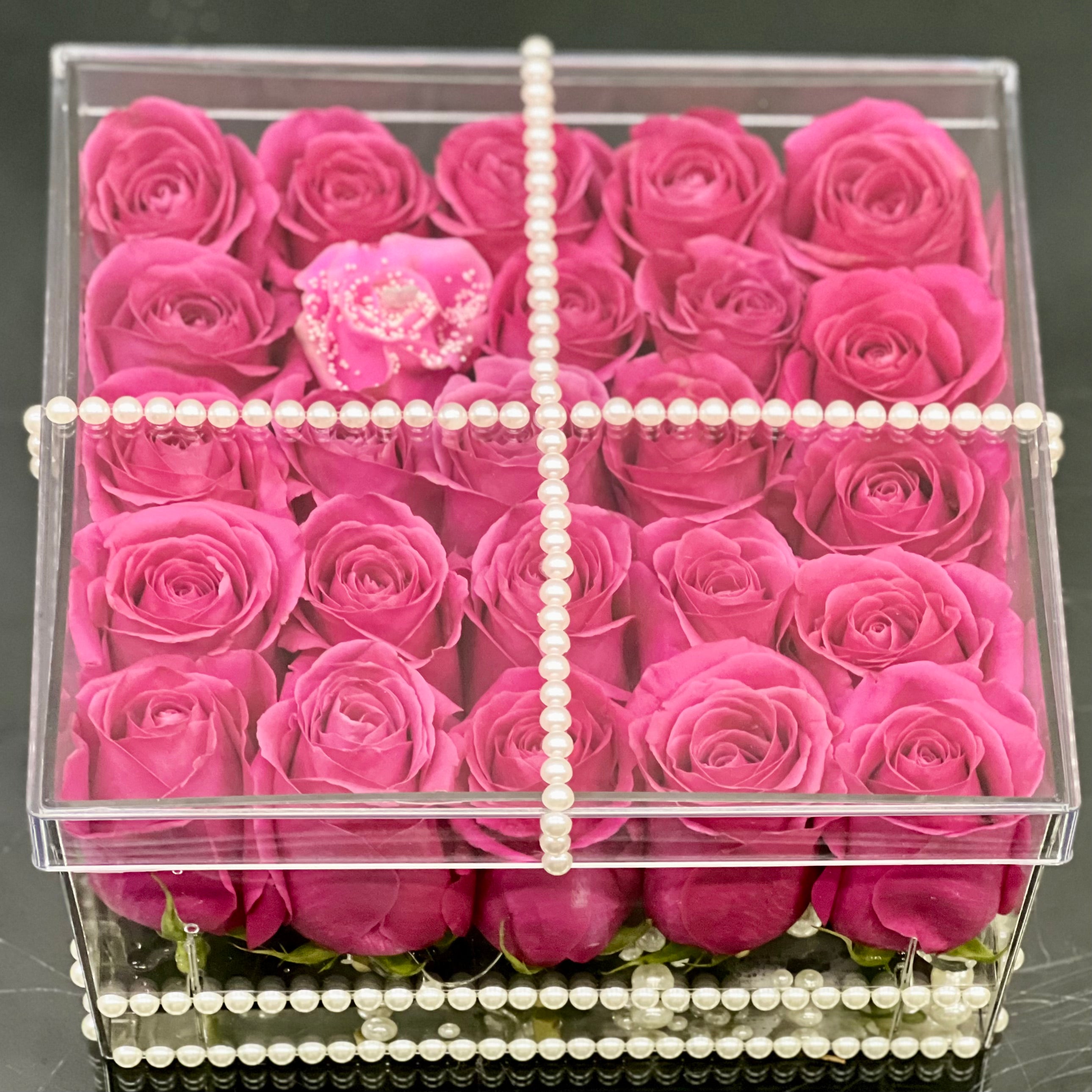Beverly Hills Florist presents you with this stunning box of roses available for same day delivery. Make a statement 25 exquisite pink roses faux pearl decorated acrylic box. Send this stunning rose arrangement to your loved ones, a wife, a husband, a parent, or a friend for occasions like birthdays, Valentines, anniversary.