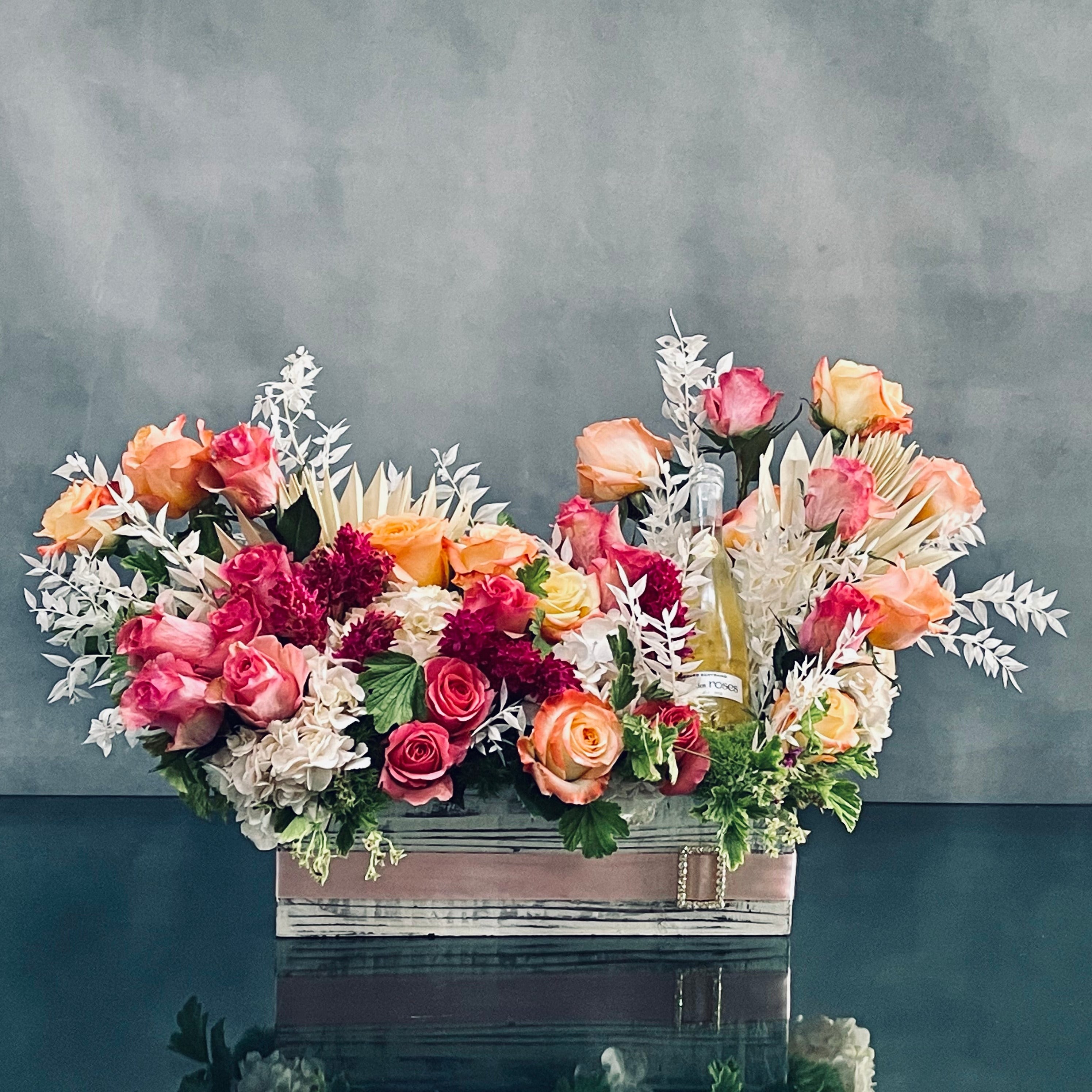 A beautiful presentation from our team at Beverly Hills Florist. A lovely creation of a box of floral which includes, peach, pink and hot pink roses, dark pink hyacinths and a half bottle of Cote de Roses chardonnay. This gift is the ideal way to let someone know how much they mean to you.