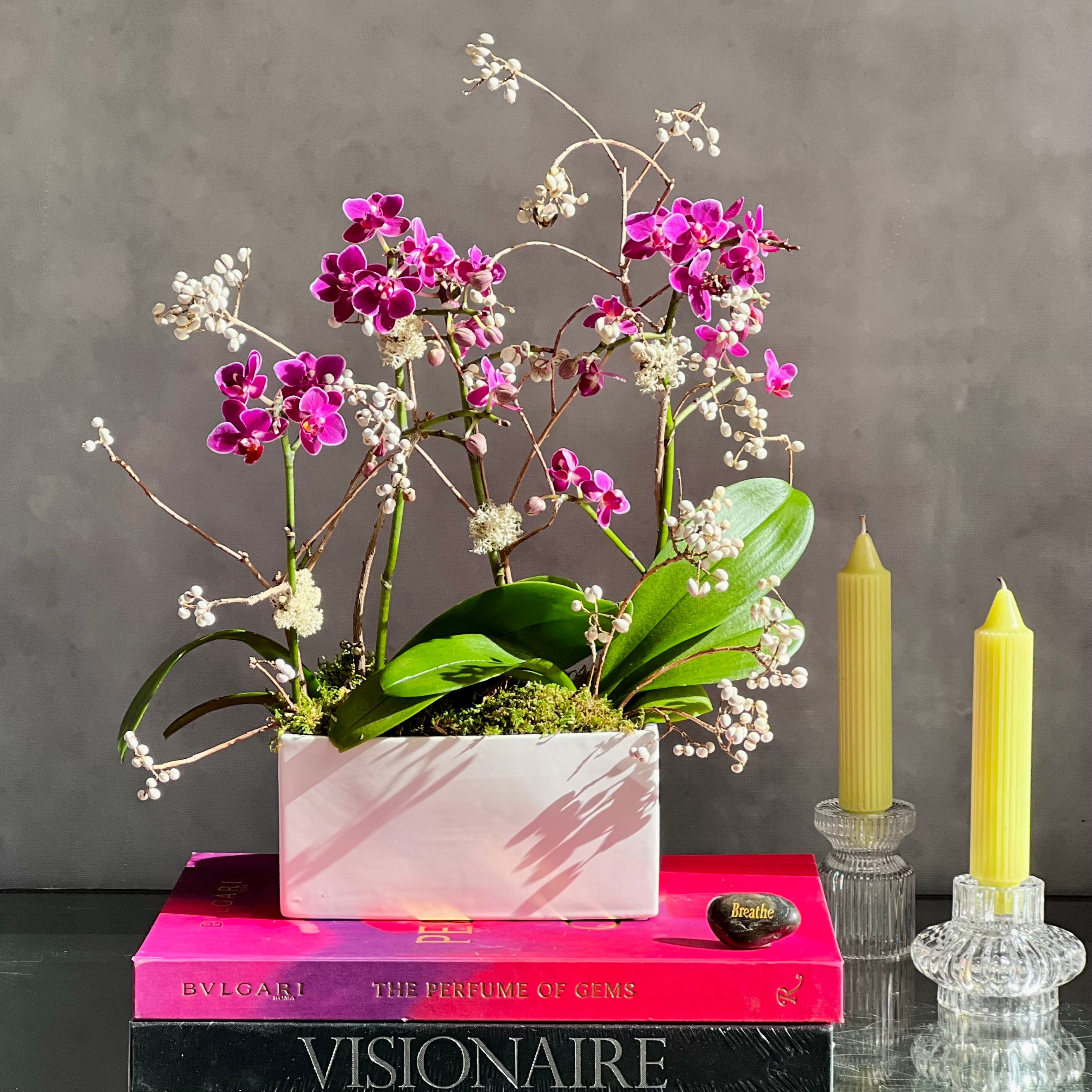 Our “breeze” is perfectly made with 3 purple Orchid spikes. Making it a beautiful piece for any occasion or event. A modern and artistic twist to Orchids.
