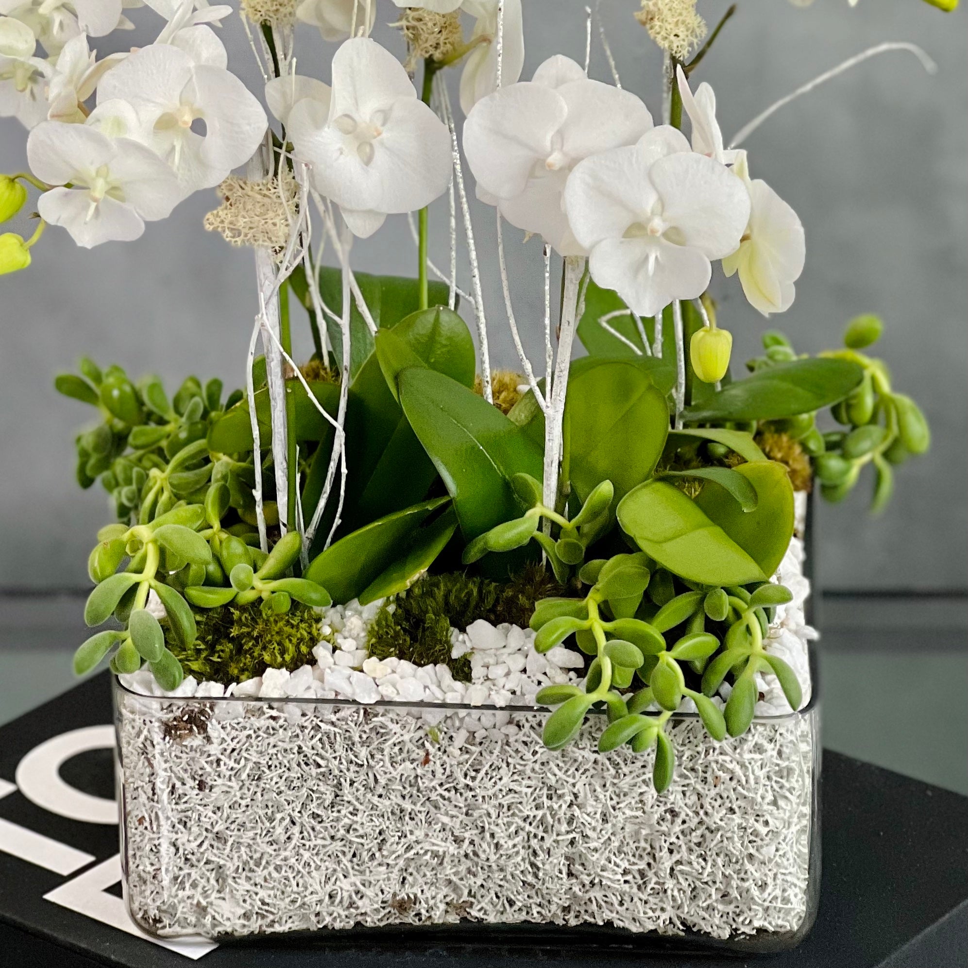 5 White Orchids in a Modern Low profile Square glass container decorated with white moss and White Marble.