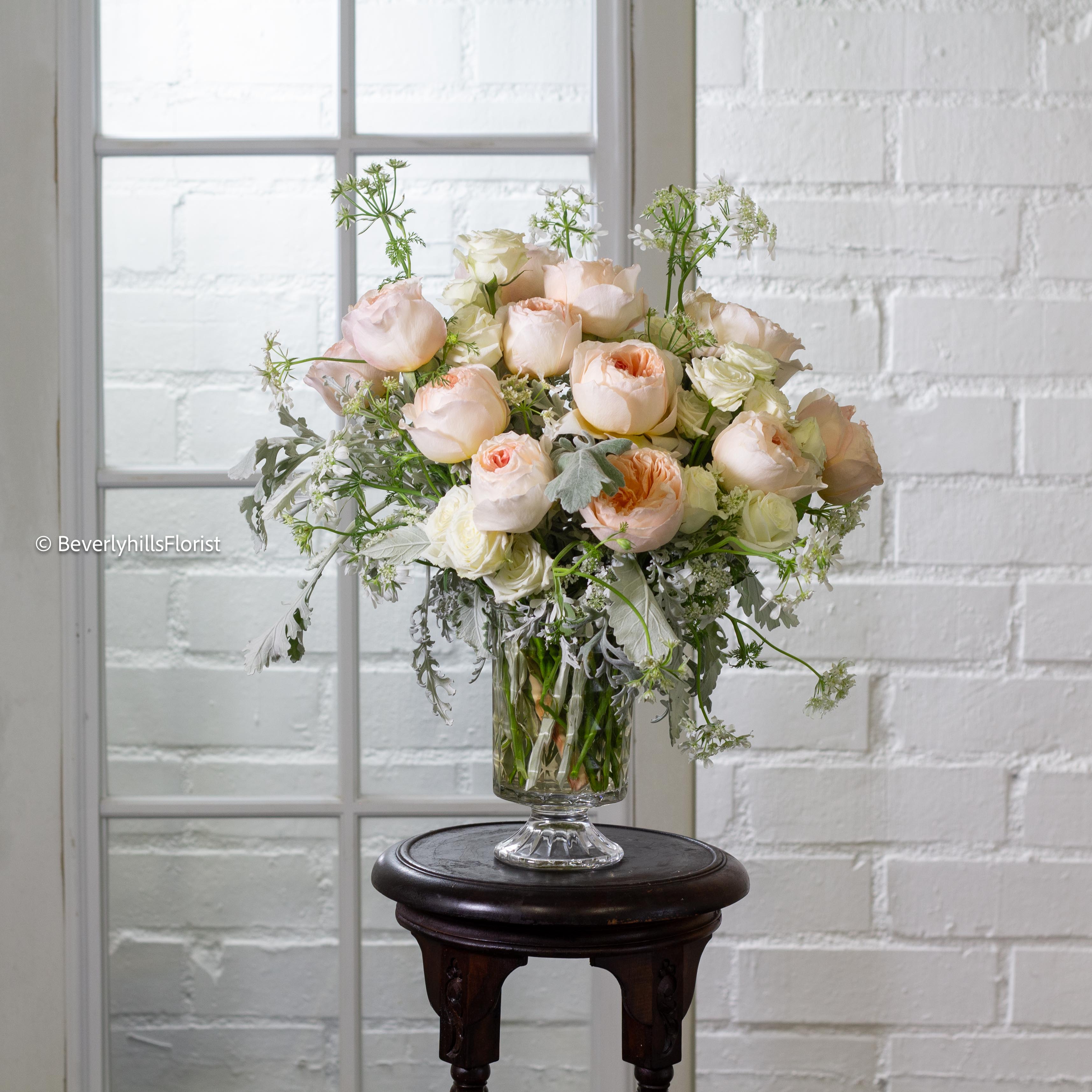 Nestled in a short glass vase, creamy romantic garden roses take center stage, their soft petals exuding an aura of timeless allure. Seasonal greens provide a verdant backdrop, accentuating the natural beauty of the blooms. This enchanting arrangement embodies the essence of romance, perfect for adding a touch of elegance to any space.