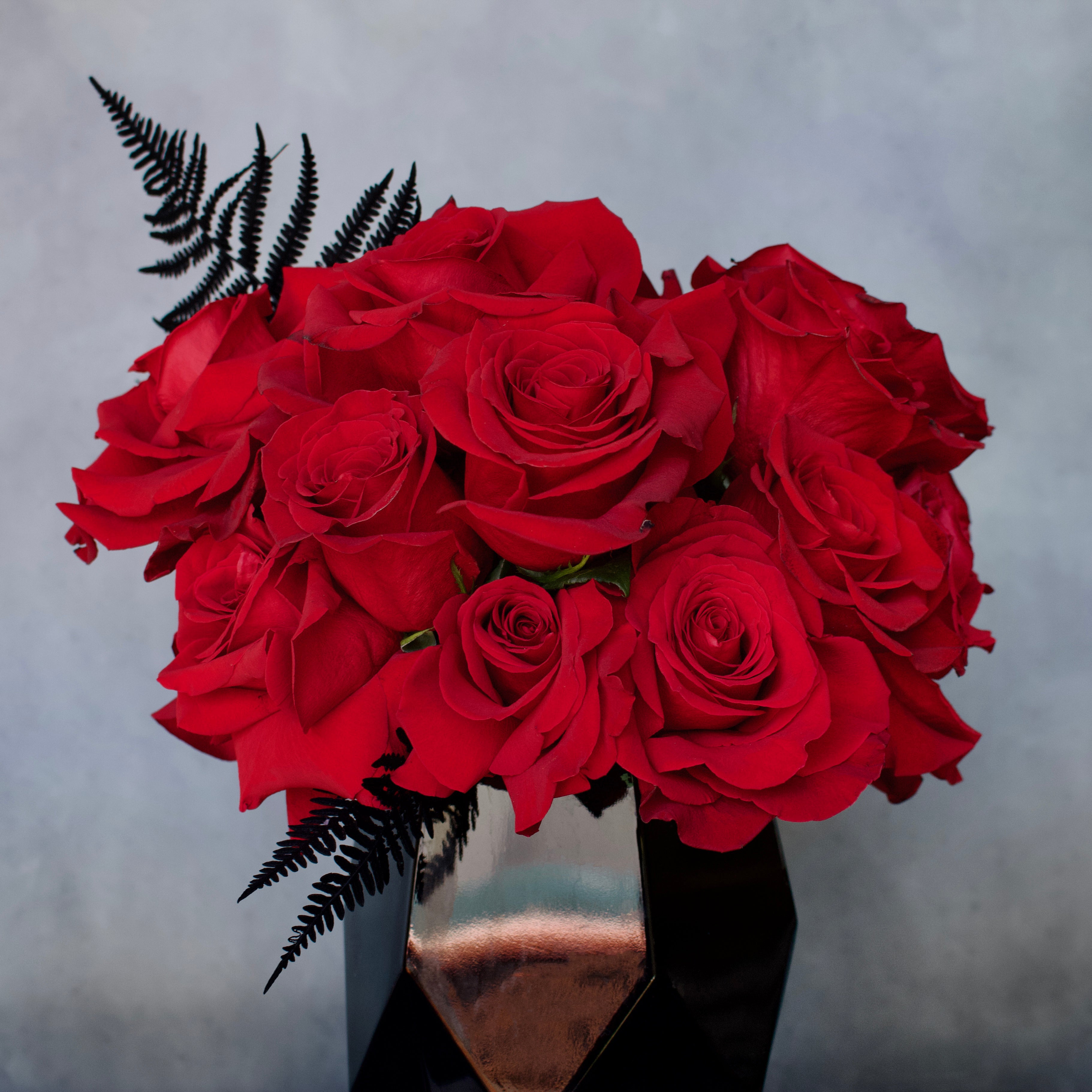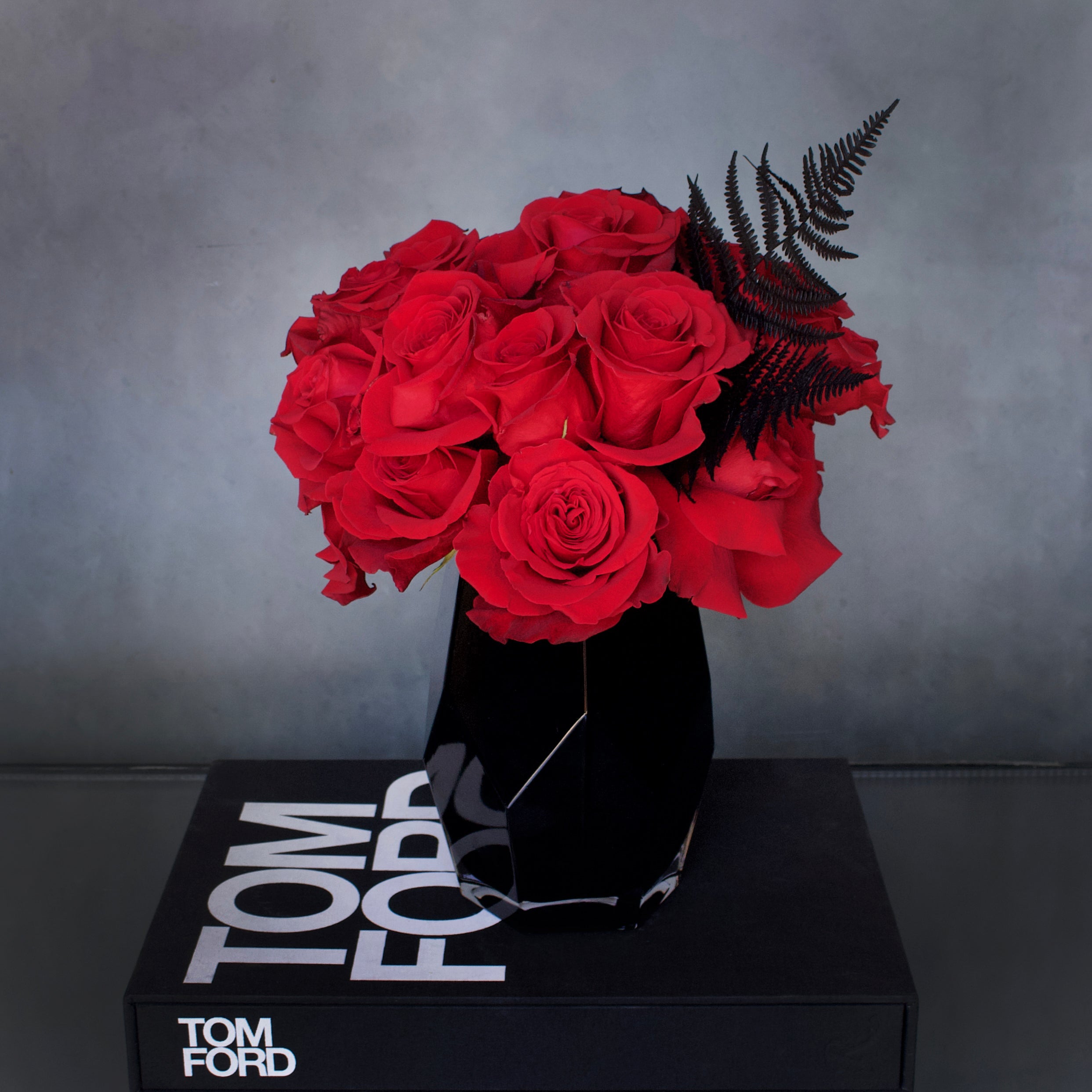 Send red roses to the one who’s always on your mind. This lovely modern arrangement nested in a black glass geometric vase will catch anyones attention.