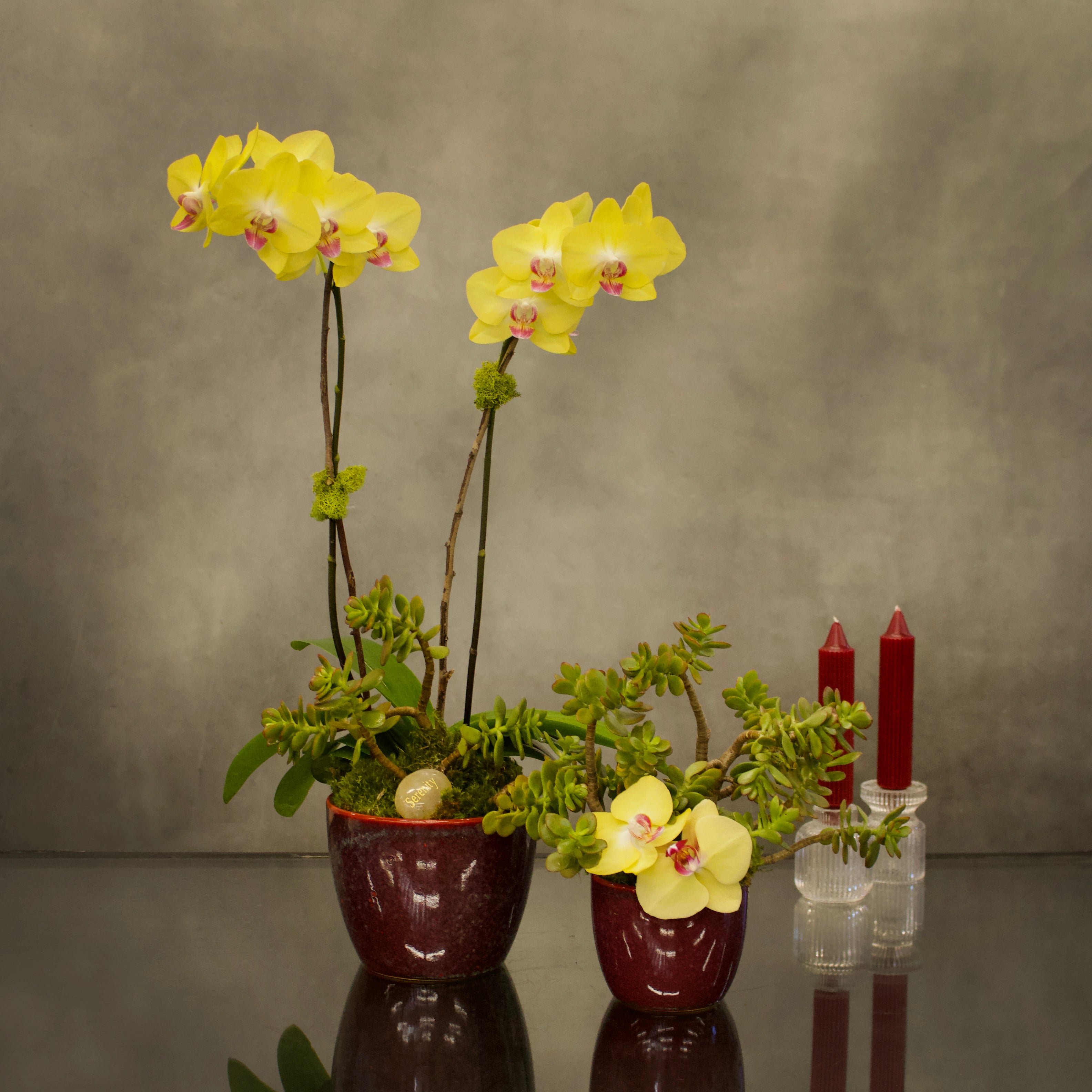 This captivating duet of yellow orchids and succulents, each arrangement approximately 16 inches tall and 10 inches wide, features vibrant yellow orchids symbolizing joy and new beginnings, alongside lush succulents representing resilience and enduring love. Perfect for adding a touch of modern sophistication to entryways, foyers, living rooms, or office spaces, this unique pairing also makes a thoughtful gift for housewarmings, birthdays, or corporate occasions. To ensure the longevity of your orchids, water every 1-2 weeks, allowing the roots to dry out between waterings, and avoid direct sunlight. For succulents, water every 2-3 weeks, allowing to dry completely, and provide bright, indirect light. Enjoy same-day delivery in Beverly Hills and surrounding areas!