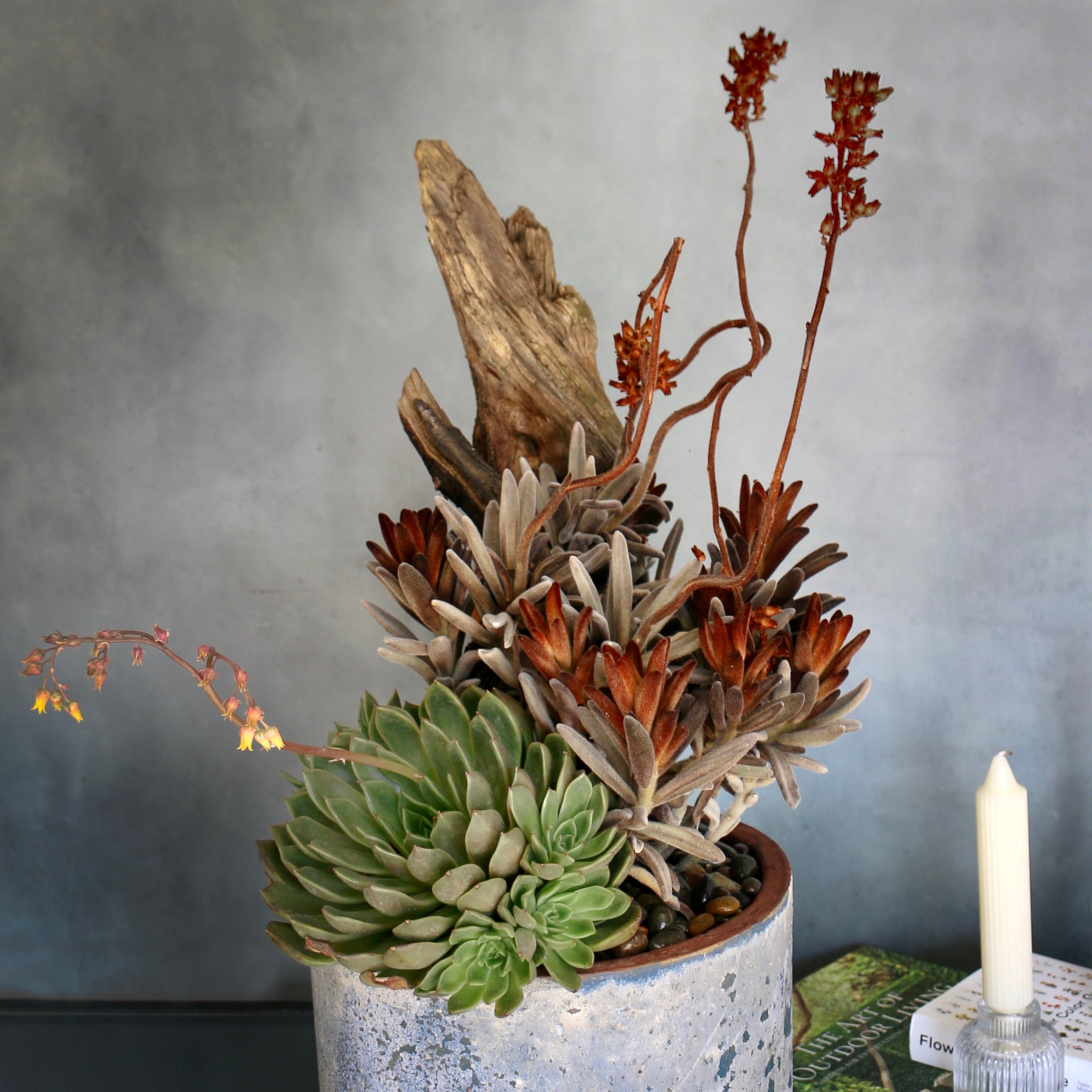 A woodsy and earthy chic arrangement. Pieced together with wooden accents and a succulent. Perfect for a plant lover !