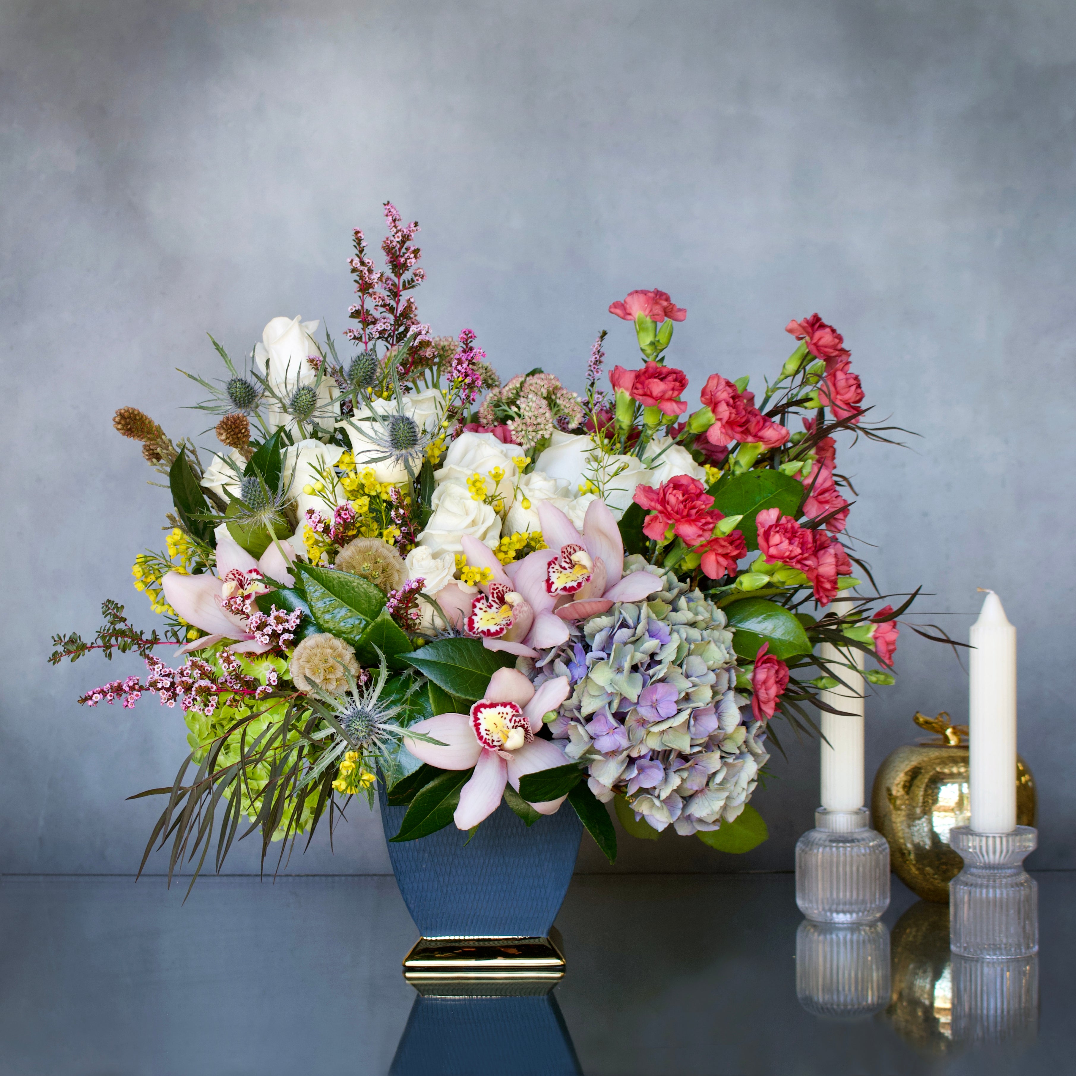 This fancy, full, fabulous arrangement is absolutely magnificent! Colorful floral in perfect harmony in a a gold and blue vase. This artistic arrangement is simply amazing and will surely deliver joy and happiness as soon as they lay eyes on this exquisite design.