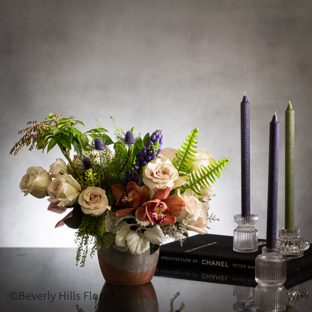 Embrace modern luxury with our same-day delivery service to these prestigious Los Angeles locales: Beverly Hills, Santa Monica, West Hollywood, Malibu, Pasadena, Bel Air, Pacific Palisades, Culver City, Brentwood, and Hollywood Hills. Our skilled floral artisans craft exquisite arrangements using the finest quicksand roses and cymbidium orchids, hand-picked daily to ensure unparalleled quality. Set in a sleek gray, cream, and beige ceramic vase, our arrangements exude timeless elegance and contemporary sophistication. Elevate your surroundings with the understated beauty of our exclusive Designer’s Choice selection, delivered straight to your doorstep for an unparalleled experience of modern luxury.