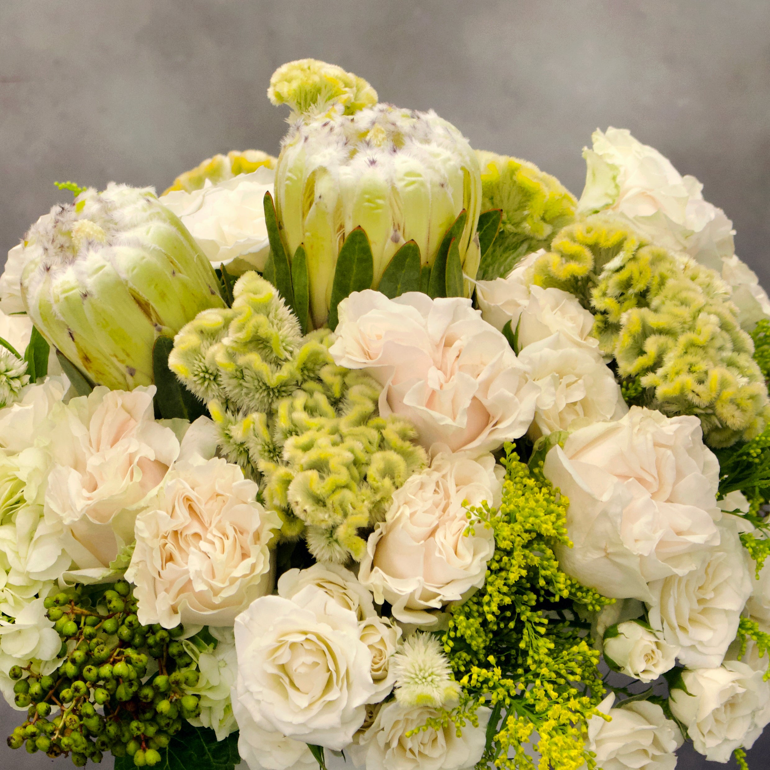 Perfectly pure. Perfectly elegant. Astonishingly gorgeous. This mixed arrangement of garden roses, spray roses, and other floral make this arrangement visually stunning while maintaining a simplicity that gives the viewer a peaceful calming feeling. Share the serenity with your loved one with this wonderful arrangement.