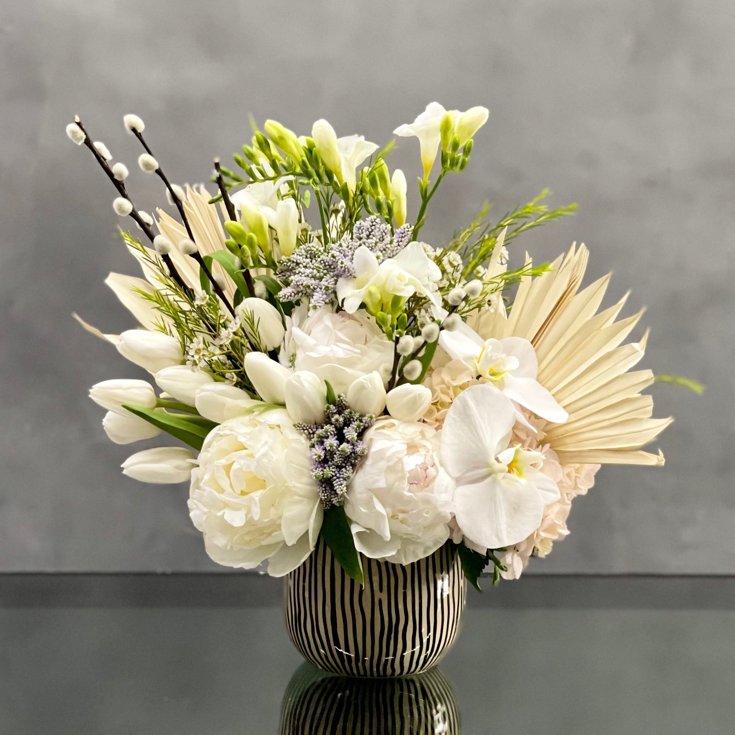 This arrangement is made with a designer’s choice array of seasonal white flowers. Floral could include Roses, Hydrangeas, Orchids, Tulips and or Peonies. These beautiful white flowers are an excellent choice for weddings, funerals and other major life events. Our team at Beverly Hills Florist offers same day delivery!