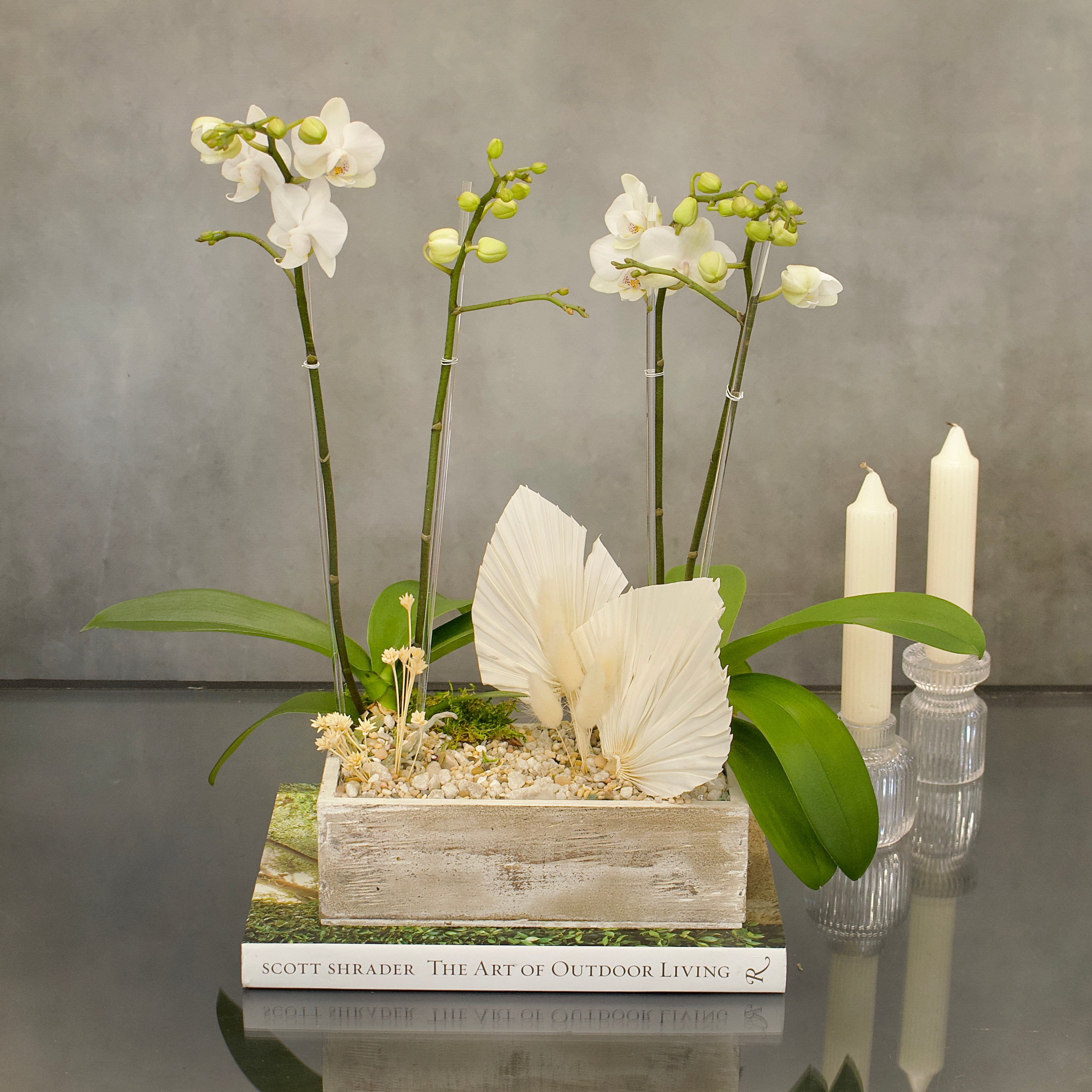 This simple yet elegant double mini orchids in white wash wood box is a perfect gift to anyone.