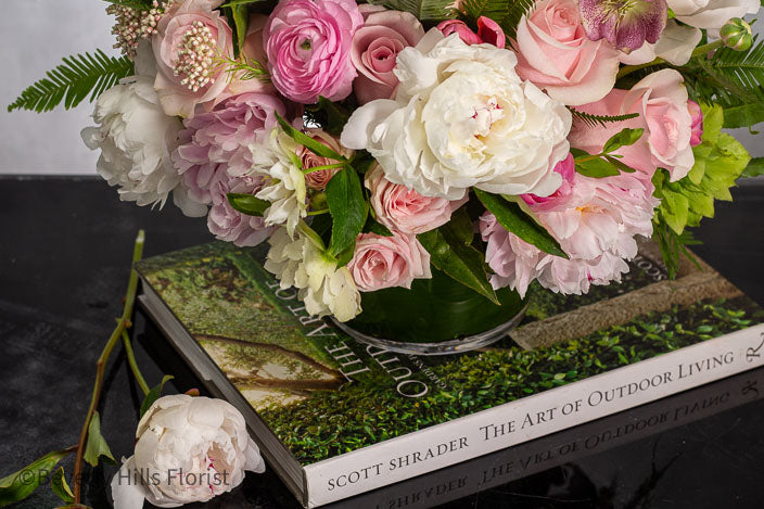 Introducing our White Peony and Pink Rose Ensemble. Set in a circular glass vase, pristine white peonies, roses, spray roses, and light pink seasonal florals create an enchanting display of elegance and charm. Perfect for adding a touch of romance to any space, this arrangement exudes timeless beauty and understated sophistication.