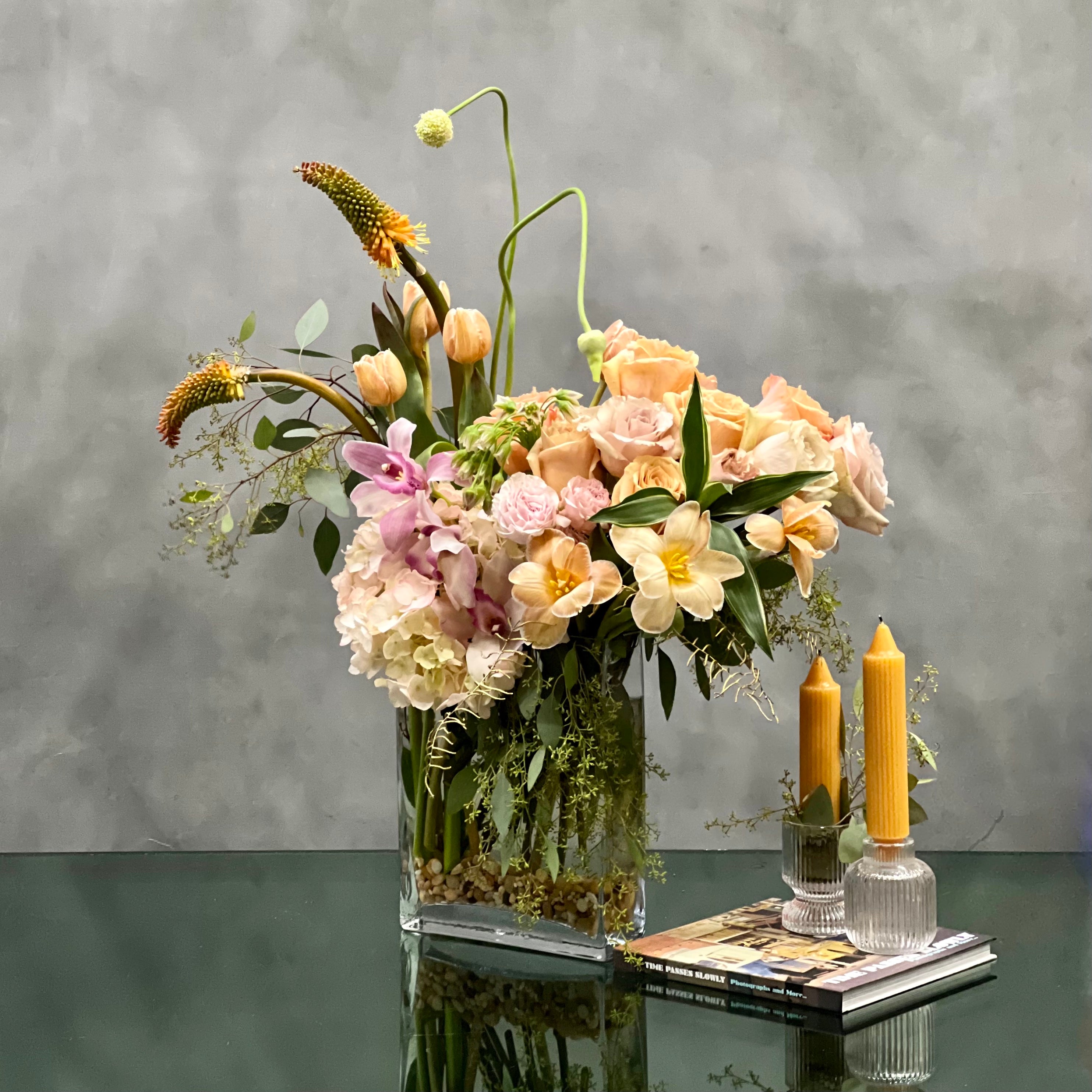 Beverly Hills Florist presents same day delivery for our “Dusk Till Dawn” arrangement ! This floral piece consists of Cream Dutch Tulips, Hydrangeas, Pink Spray Roses, Cream Ecuadorian Roses, Orchids, various greens and Eucalyptus. Wonderful for Birthdays, Thank you & Thinking of you.