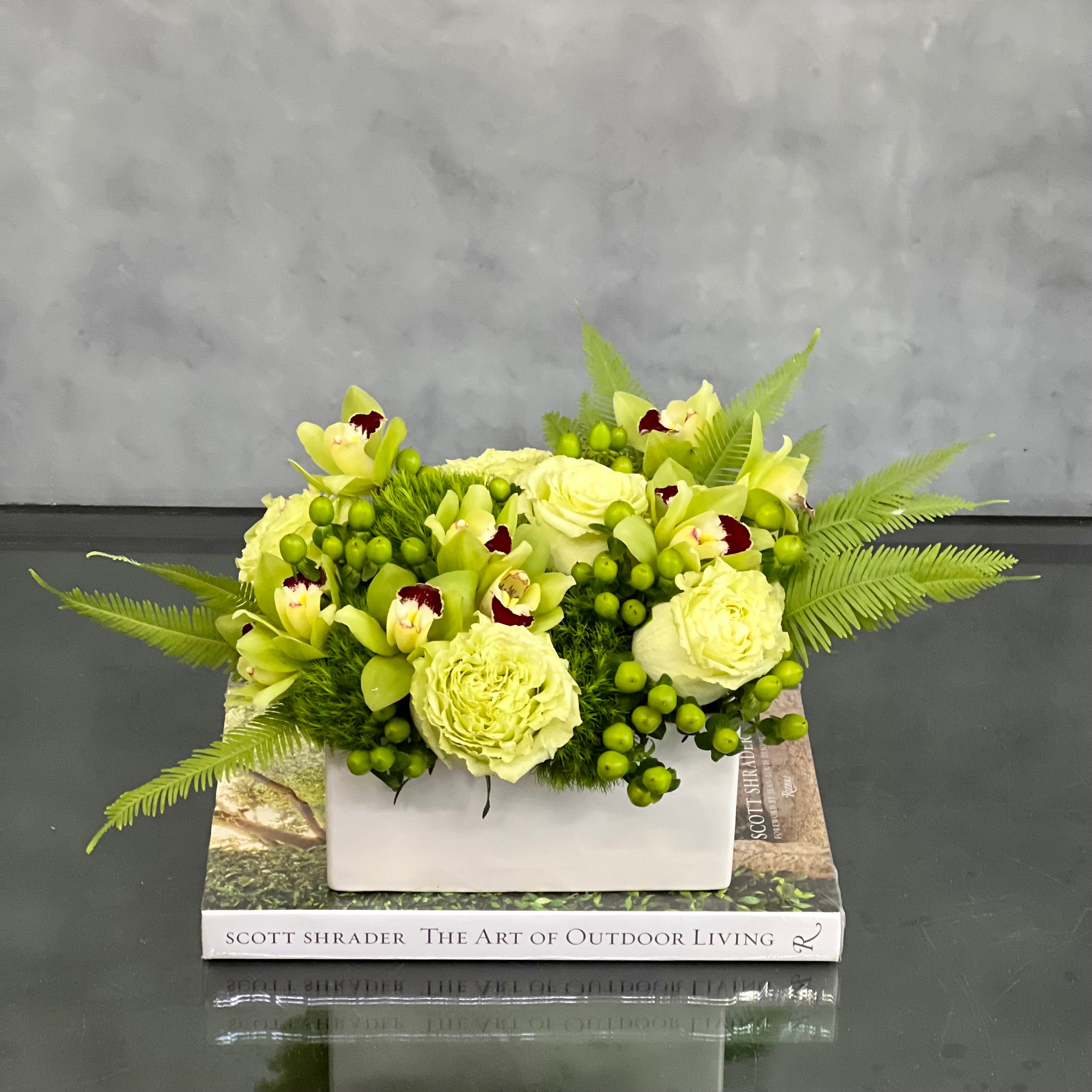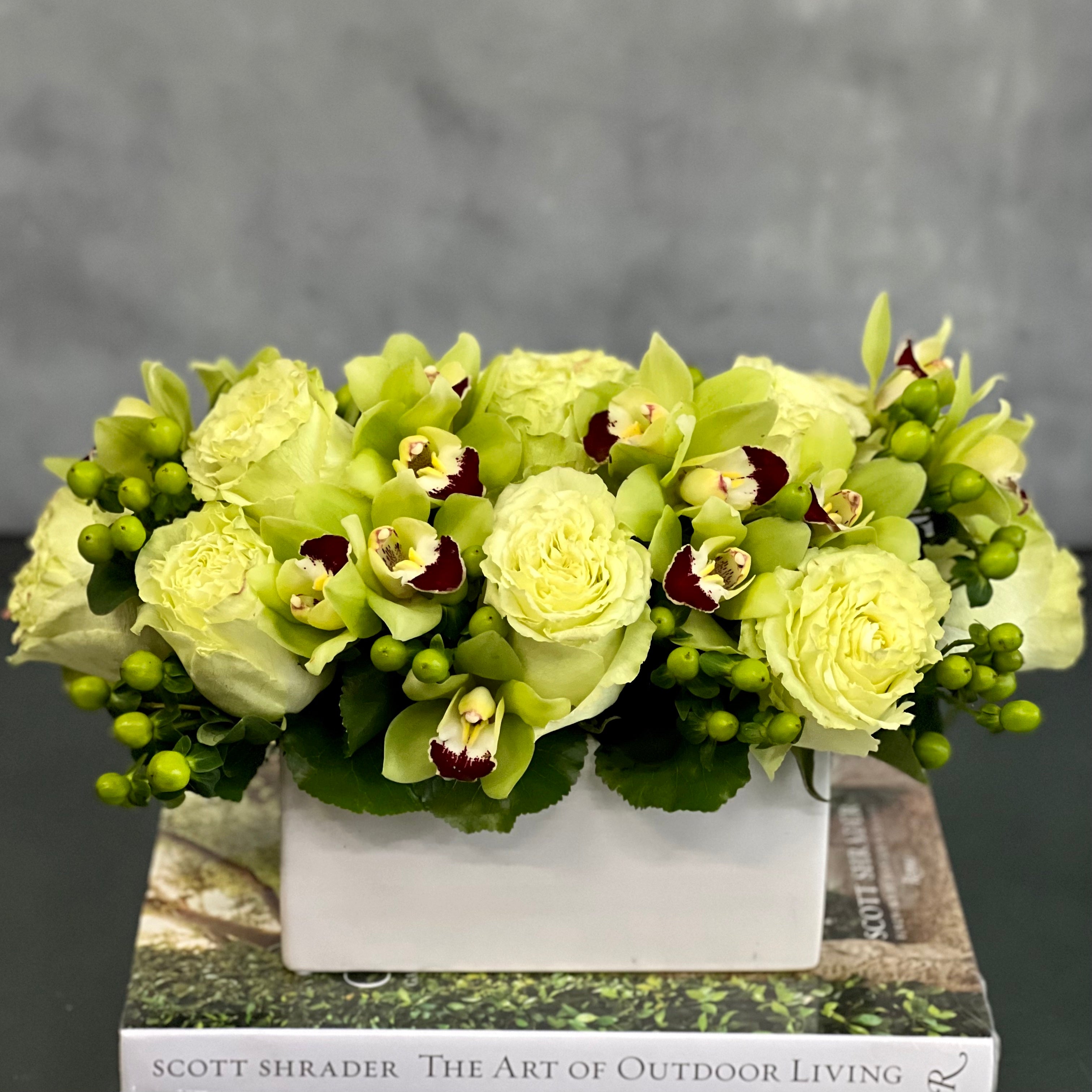 Earthy is just the right arrangement for a simplistic and chic touch to any room. A chic Thank You, Just Because or Thinking Of You. Our “Earthy” consists of Green Roses, Cymbidium Orchids and Coffee Beans.