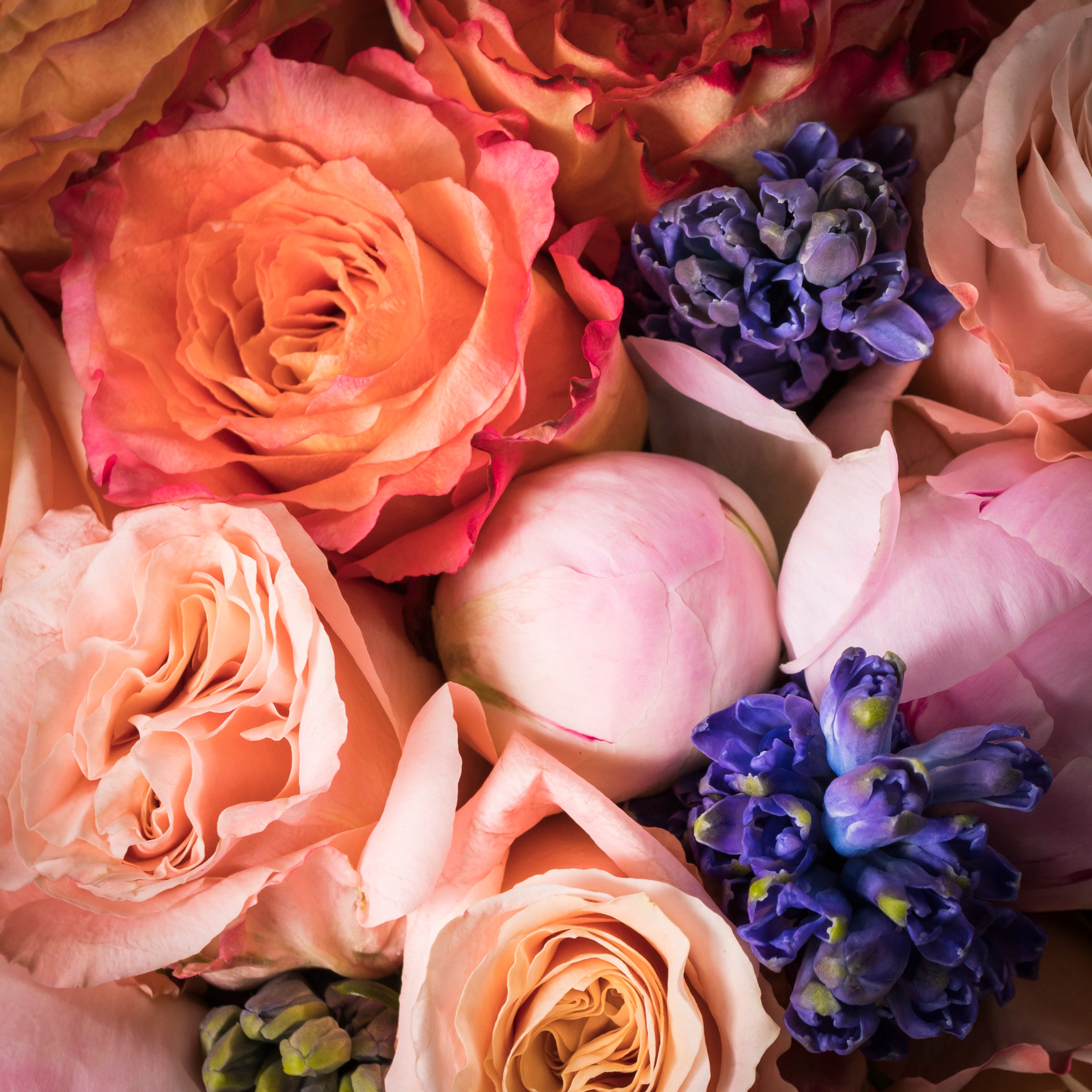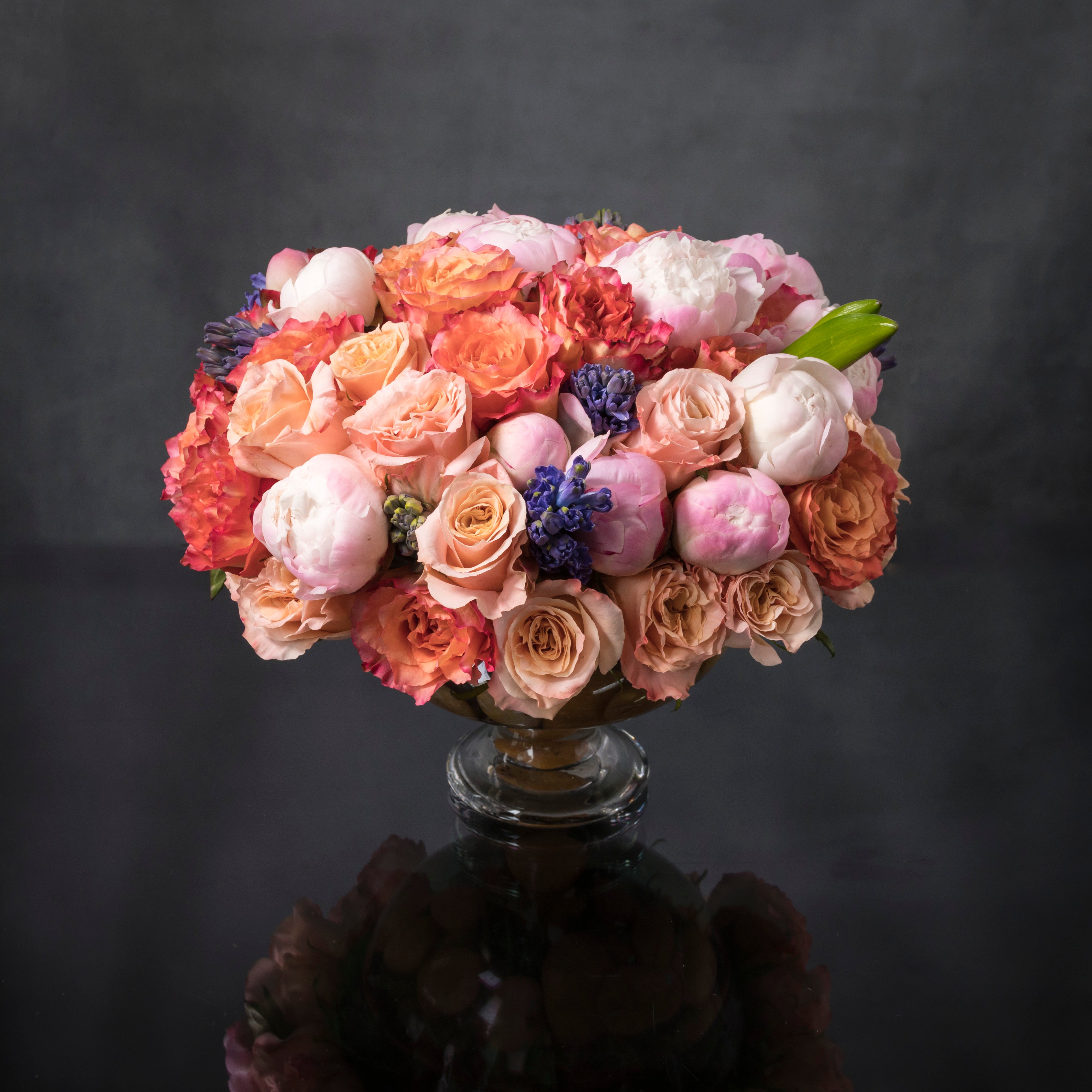 Beverly Hills Florist offers same day delivery! Luscious spring-colored blooms highlight this lovely and abundant arrangement. Gorgeous coral and peach Roses, light colored peonies, seasonal flowers in shades of pink, orange, purple combine into one special and delightful design that will touch the heart.