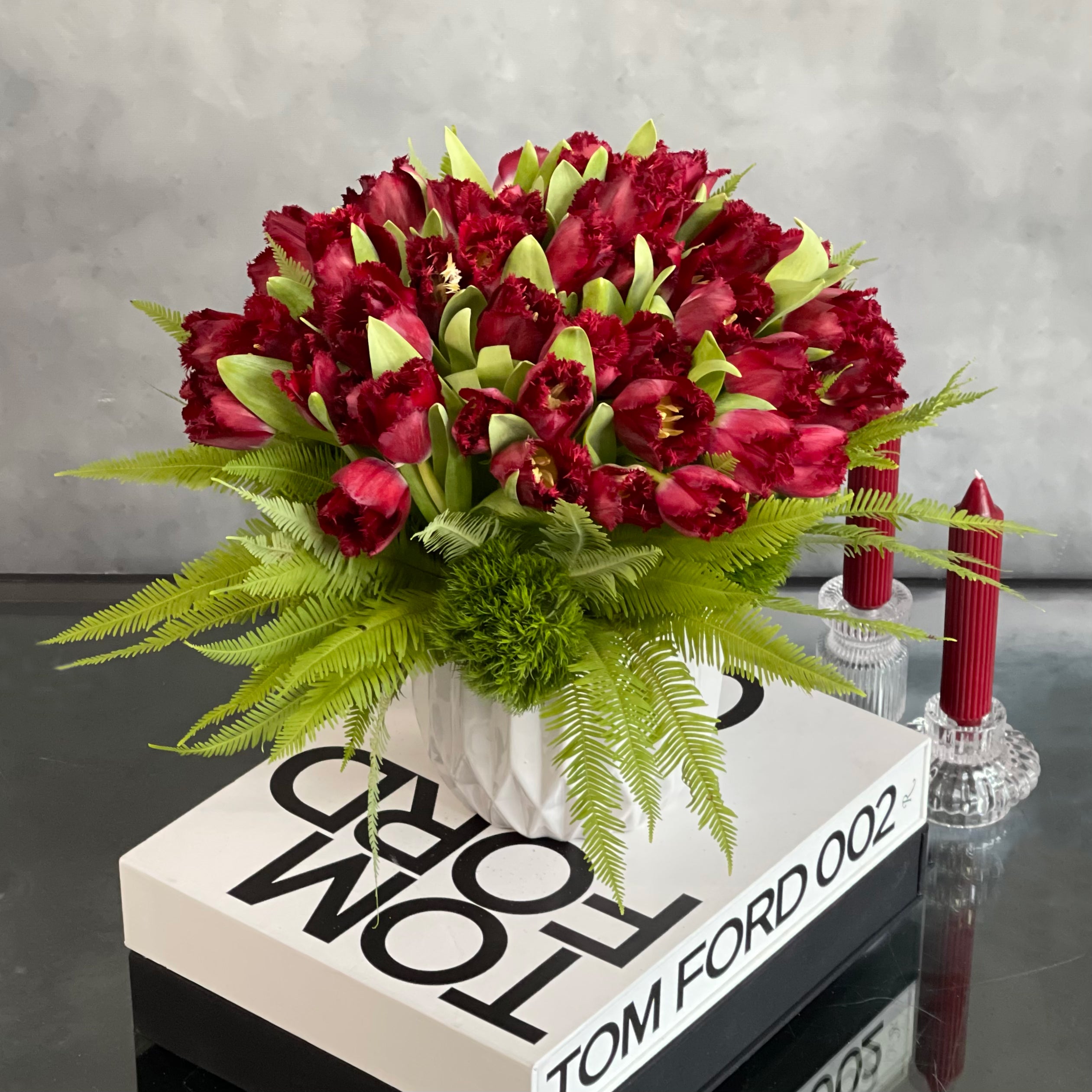 Our “Old Fashion Lover” is perfect for Love & Romance, Just Because or Thinking Of You. This arrangement consists of 50 Red Fringe Tulips. A classic touch accented with seasonal greens.