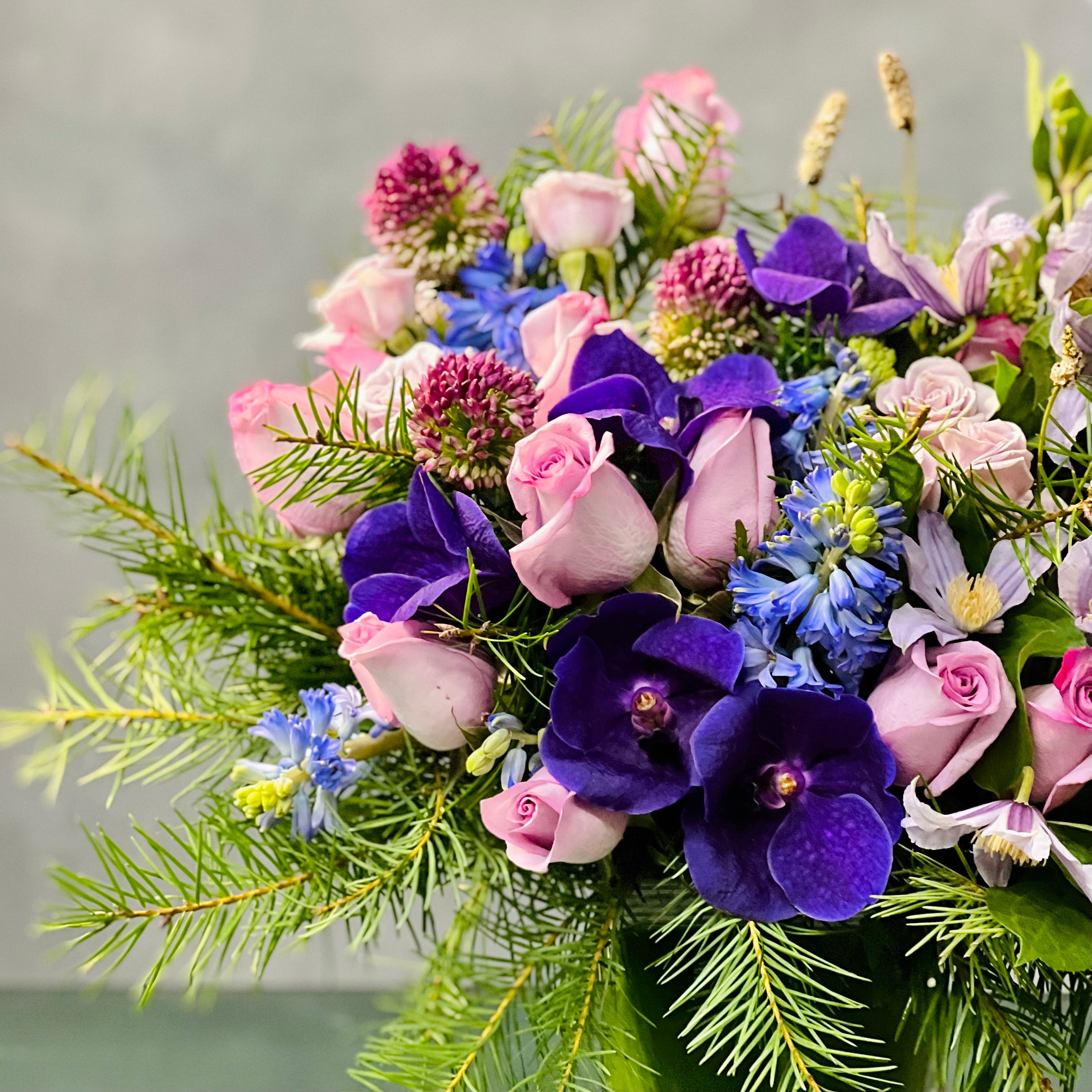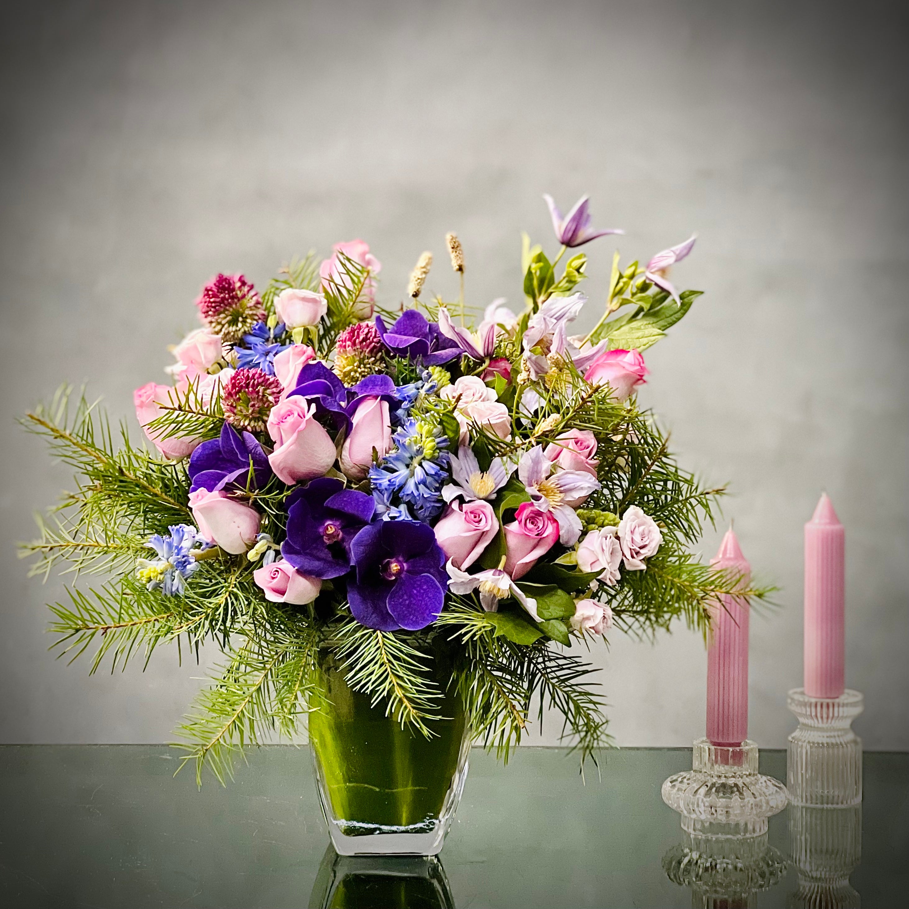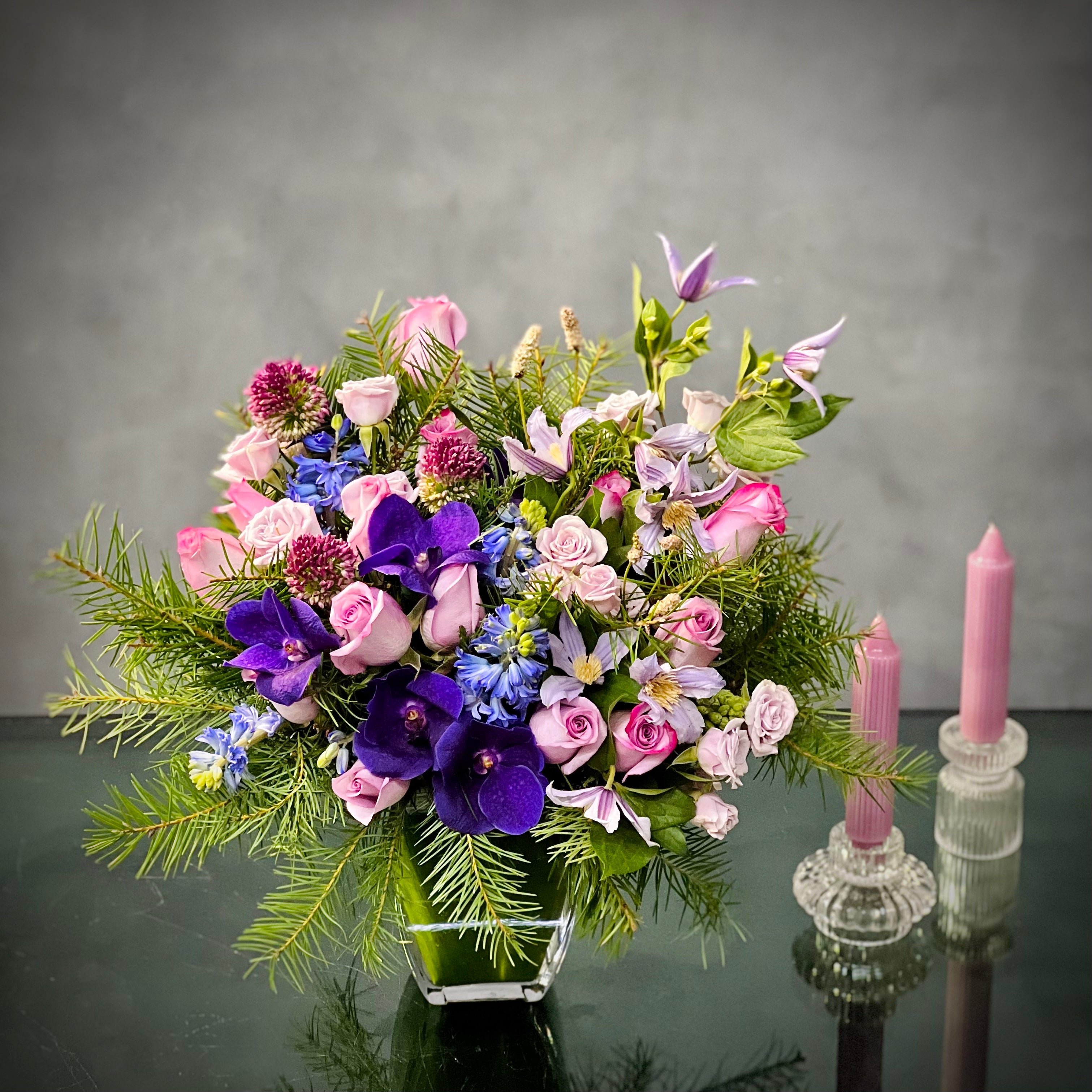 My Beverly Hills Florist offers same day delivery for this beautiful glass vase holds a stunning mix of Roses and Orchids. The accents of purple Hydrangeas make the lovely pastels stand out. Ideal for Birthdays, Thank You, Mother’s Day and more.