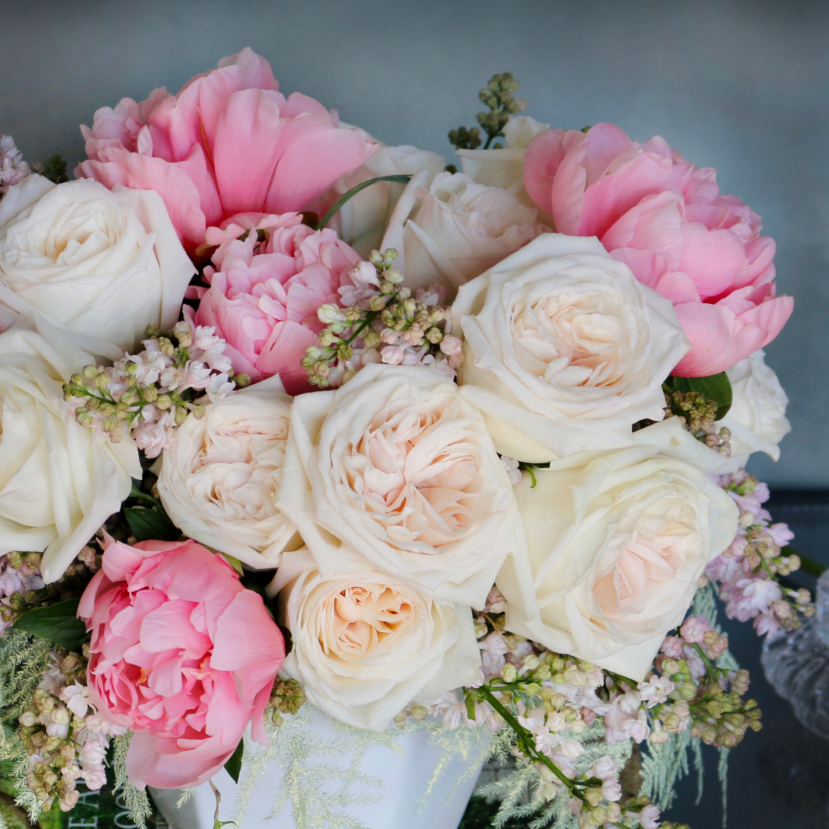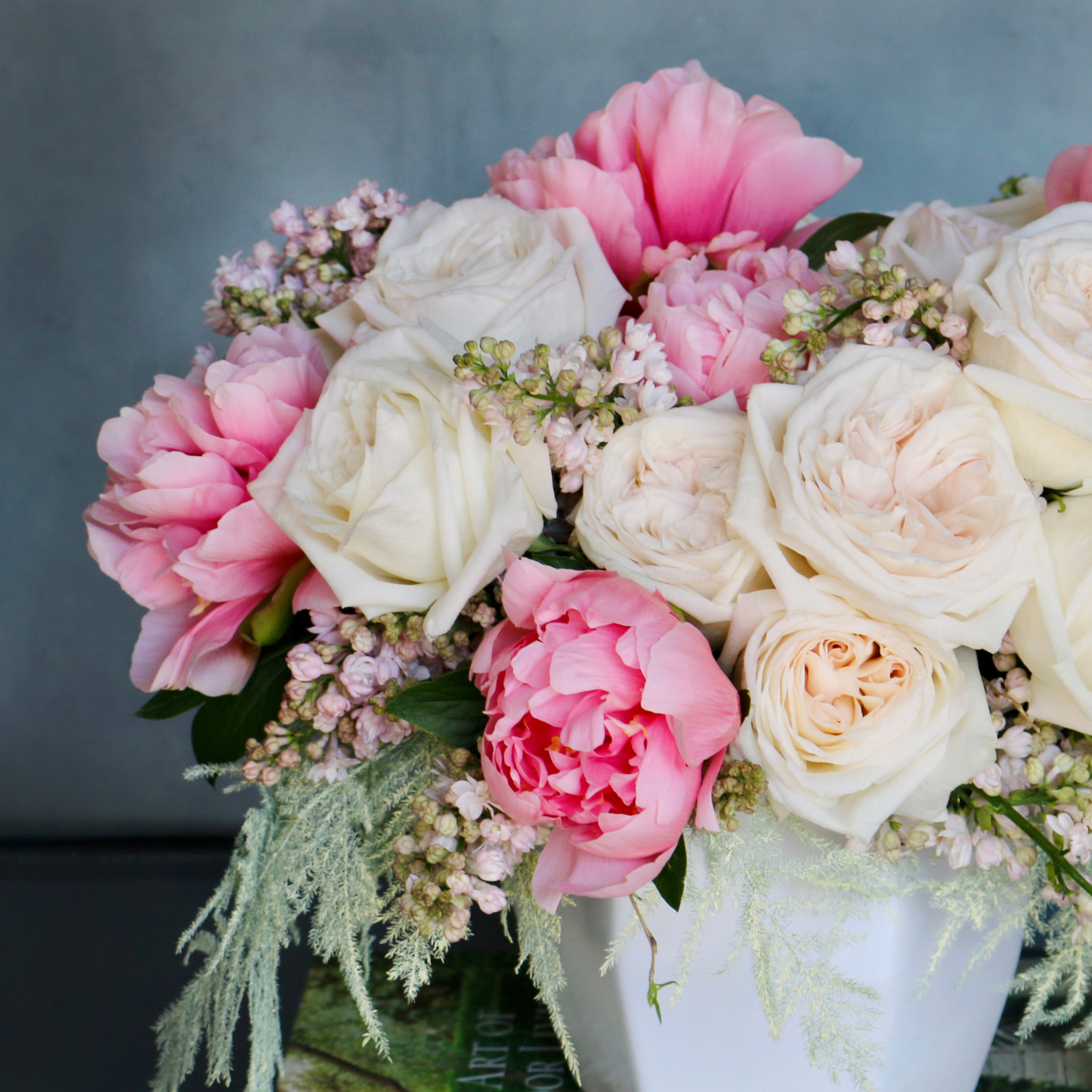 “Femme” is the definition of soft & elegant. A beautiful romantic arrangement that is made of cream/white Roses, Peonies, and Lilacs. All placed within a white geometric white vase.