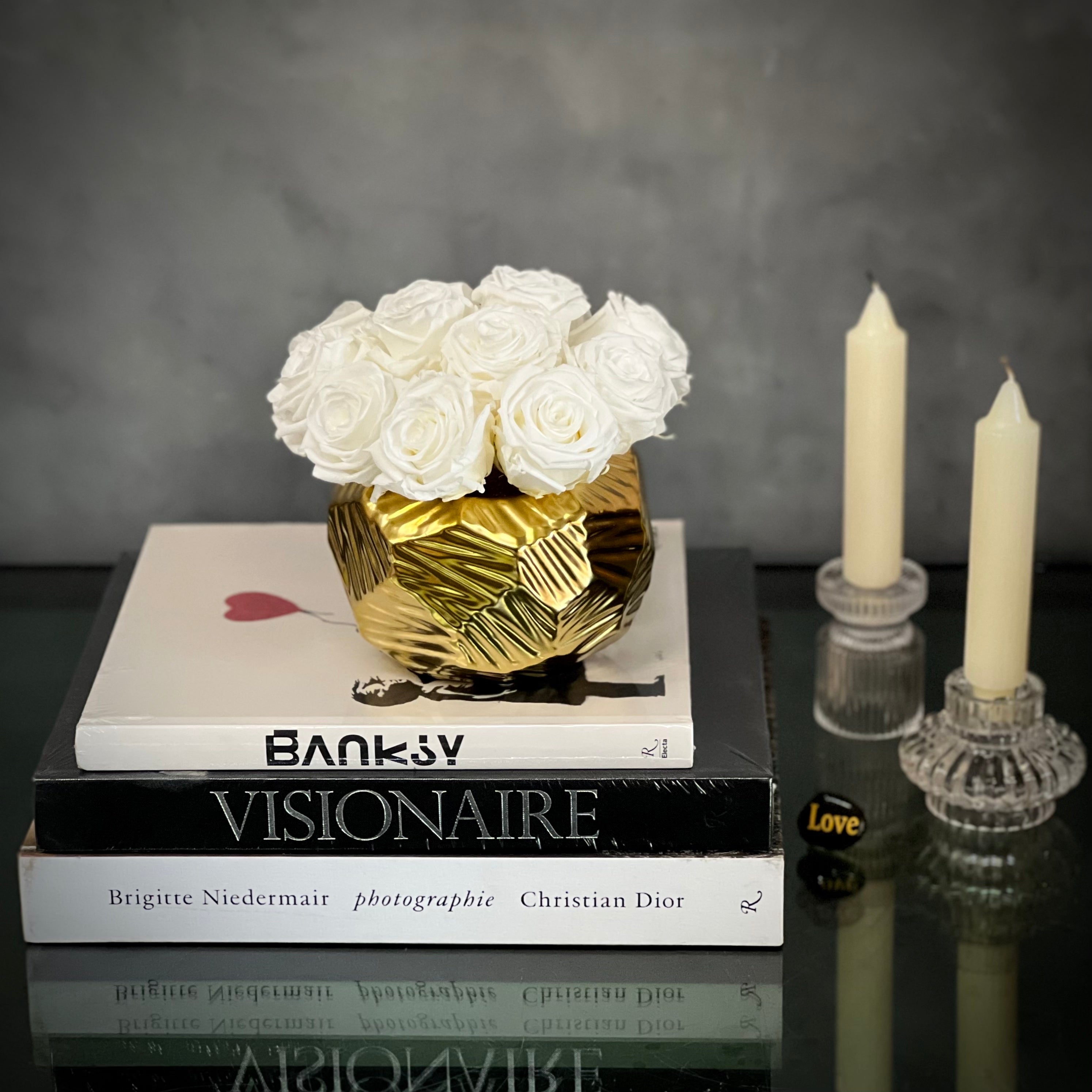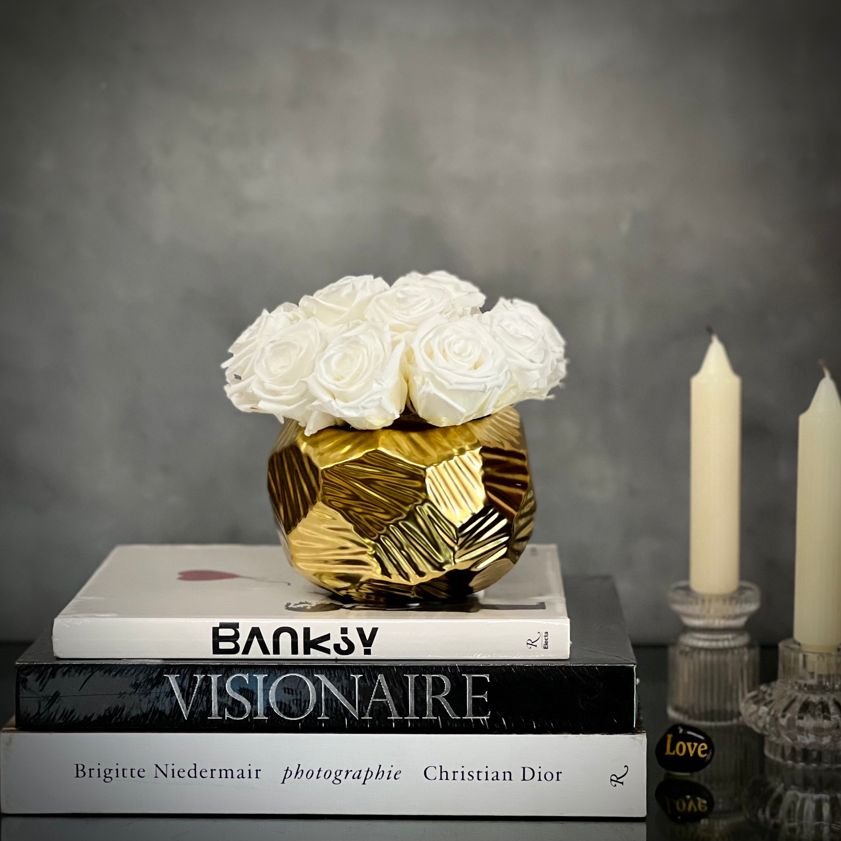 Beverly Hills Florist presents our “Chariot”, simplistic and beautiful. Our arrangement is made of 12 white Roses that are placed in a gold geometric ceramic vase. Perfect for a modern love, Valentine’s Day & simply Just Because.