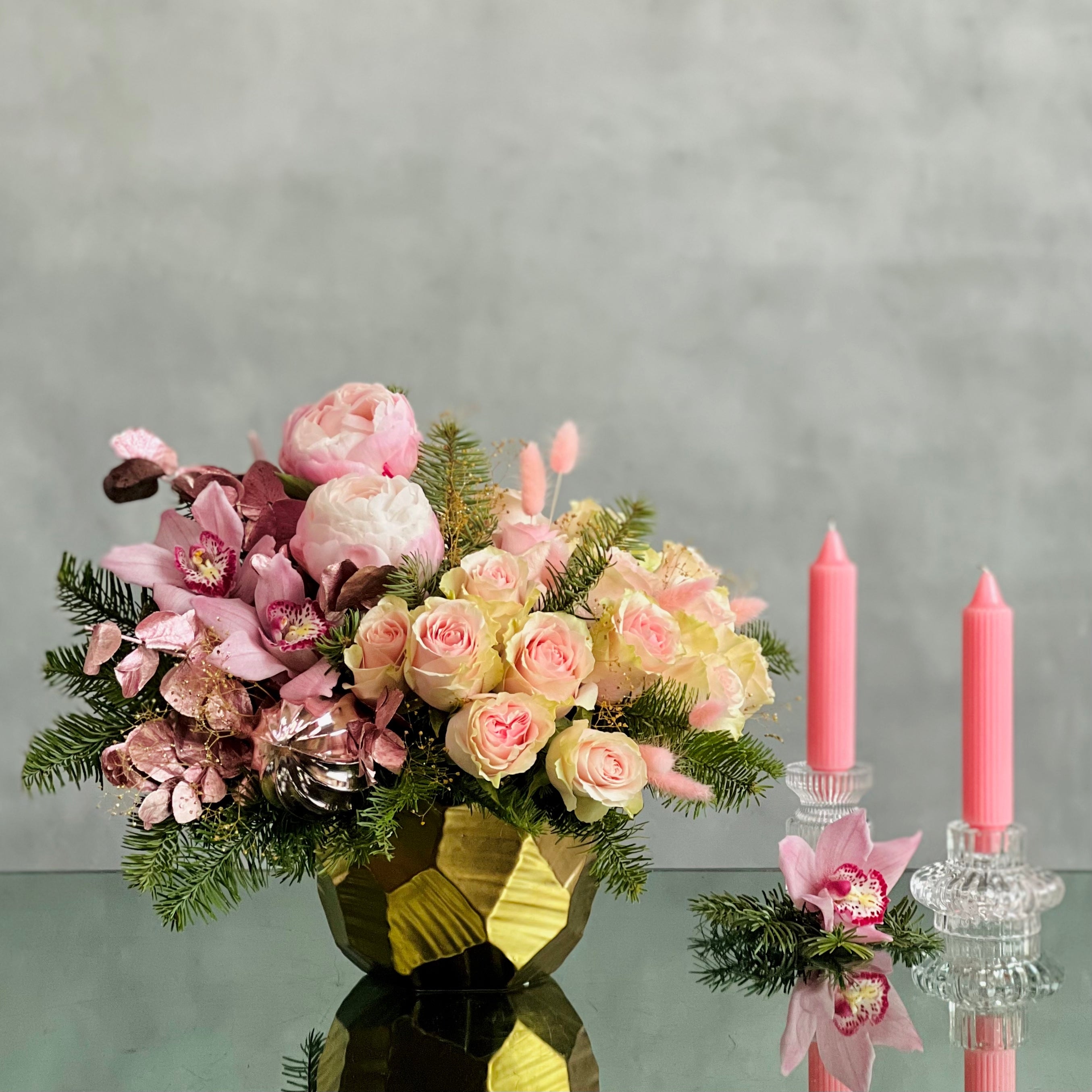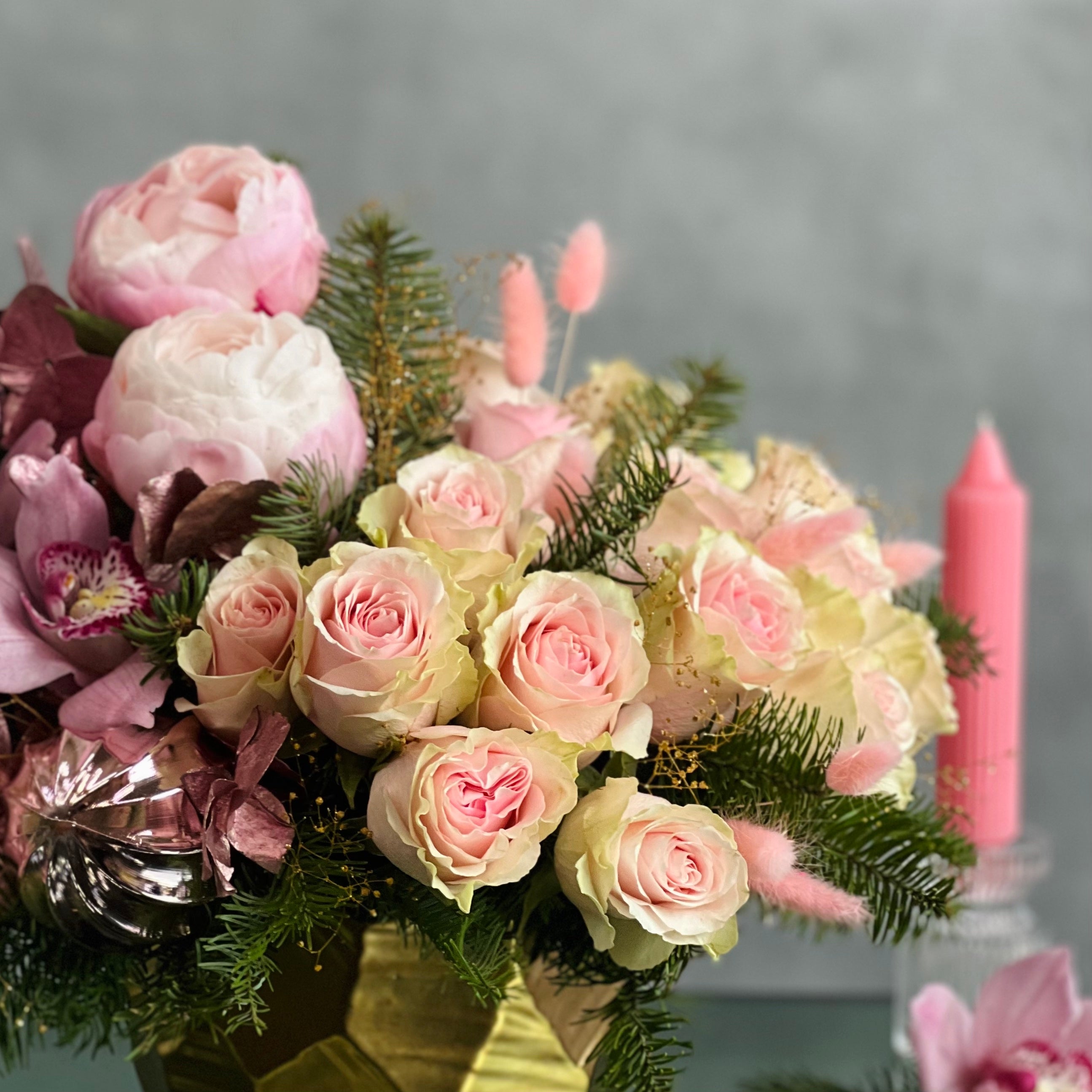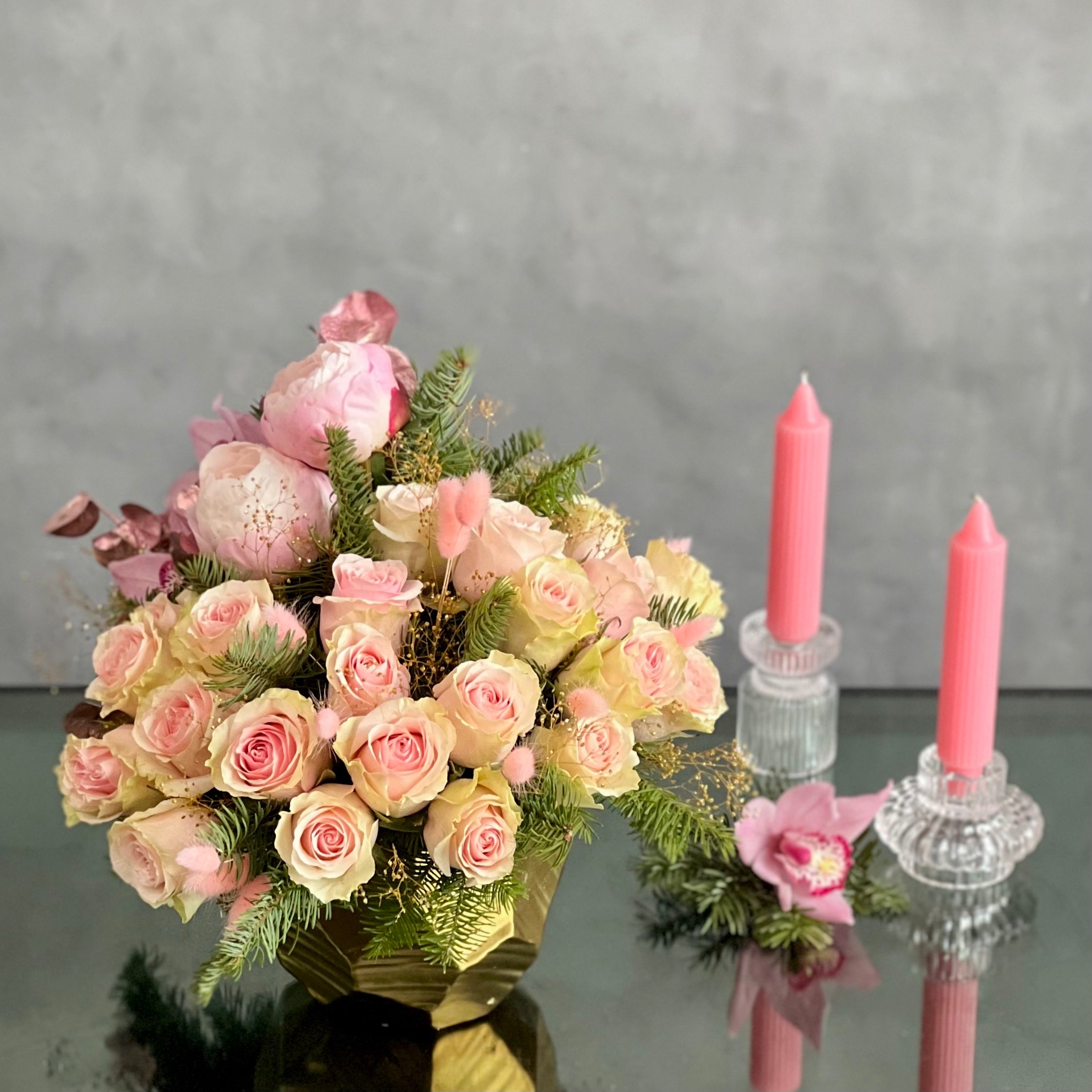 Luscious and Lovely….. this scrumptious mix of pink Blooms is simply stunning. 2 Dozen Beautiful pink Roses with green guard petals, Peonies, Orchids and Holiday Greens come together in this artistic design of full and colorful blooms with a festive flair. A great choice for any celebration or in any décor.