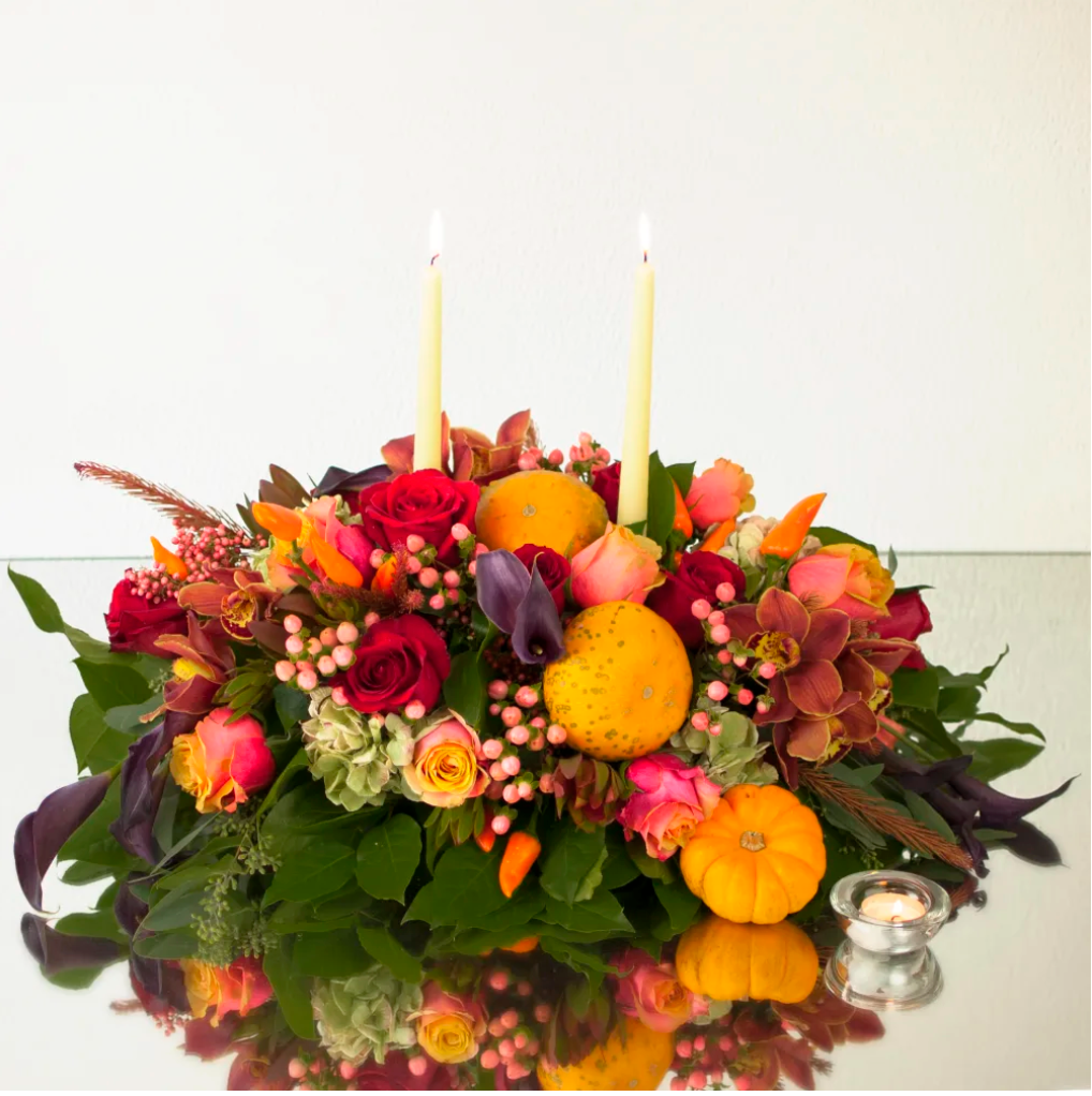 Dress up your Thanksgiving table with this exquisite centerpiece. This full, fall color mix of lovely florals includes local Orchids, Calla Lilies, Roses, Hydrangeas and other seasonal blooms. Approx: 28″ L x 16″ W