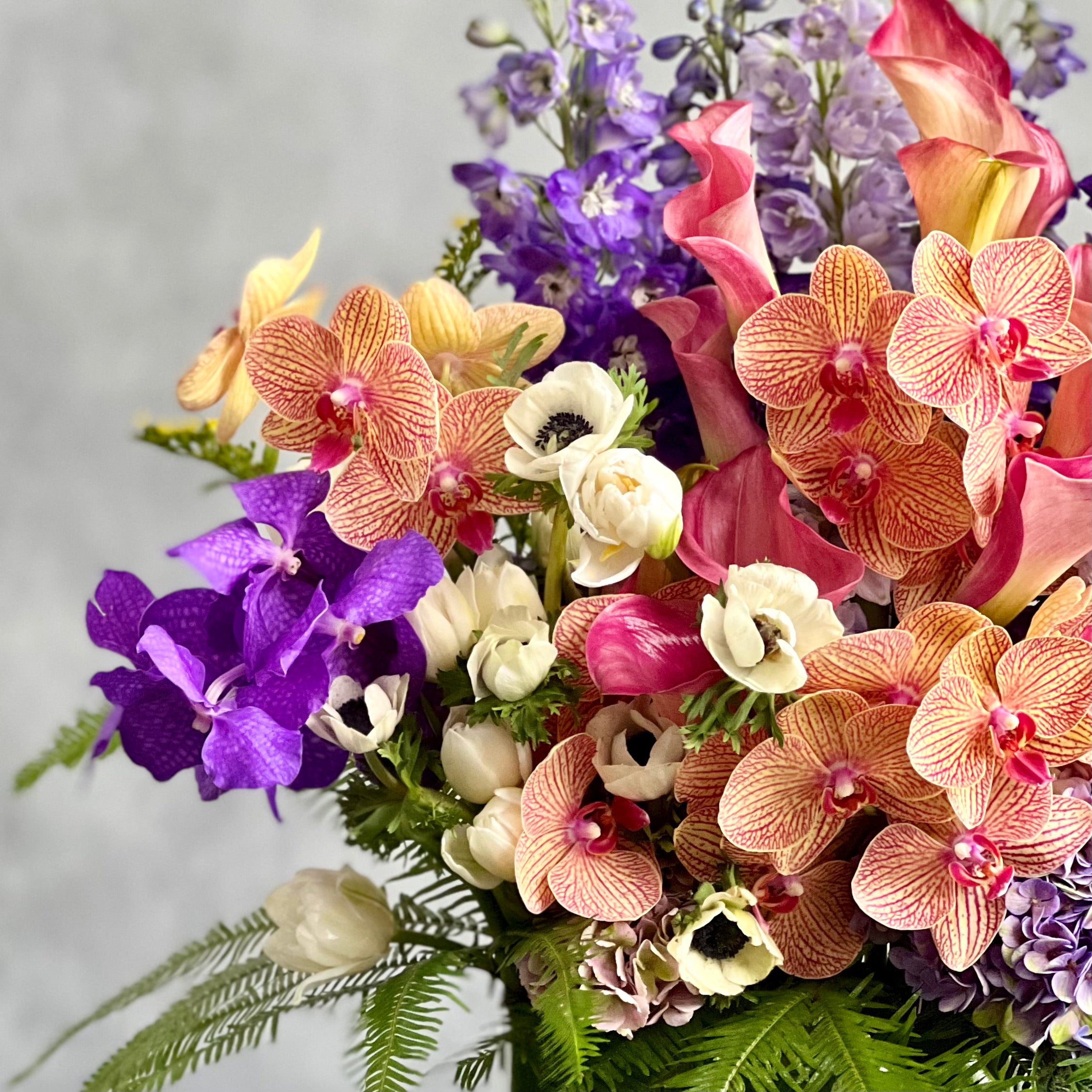 Beverly Hills Florist presents this eye catching arrangement that can bring any room to life. This beautiful piece includes gorgeous colors that work together to create something magnificent. It includes white anemone, purple hydrangeas, mini calla lilies , vanda and Phalaenopsis orchids and delphinium among other seasonal greens. The Base stands at approximately 18 inches tall. Perfect for fall, just because, birthdays, thank you.