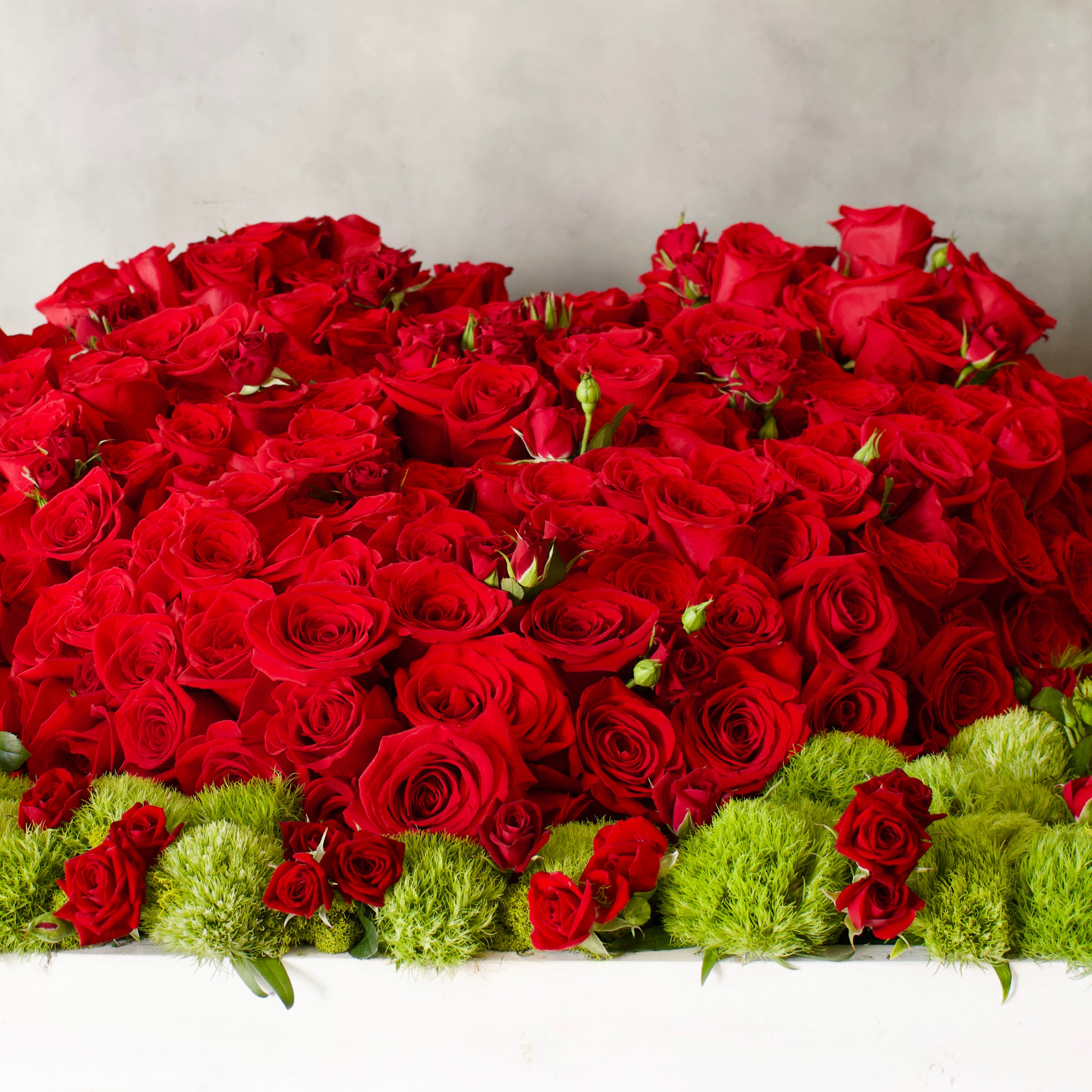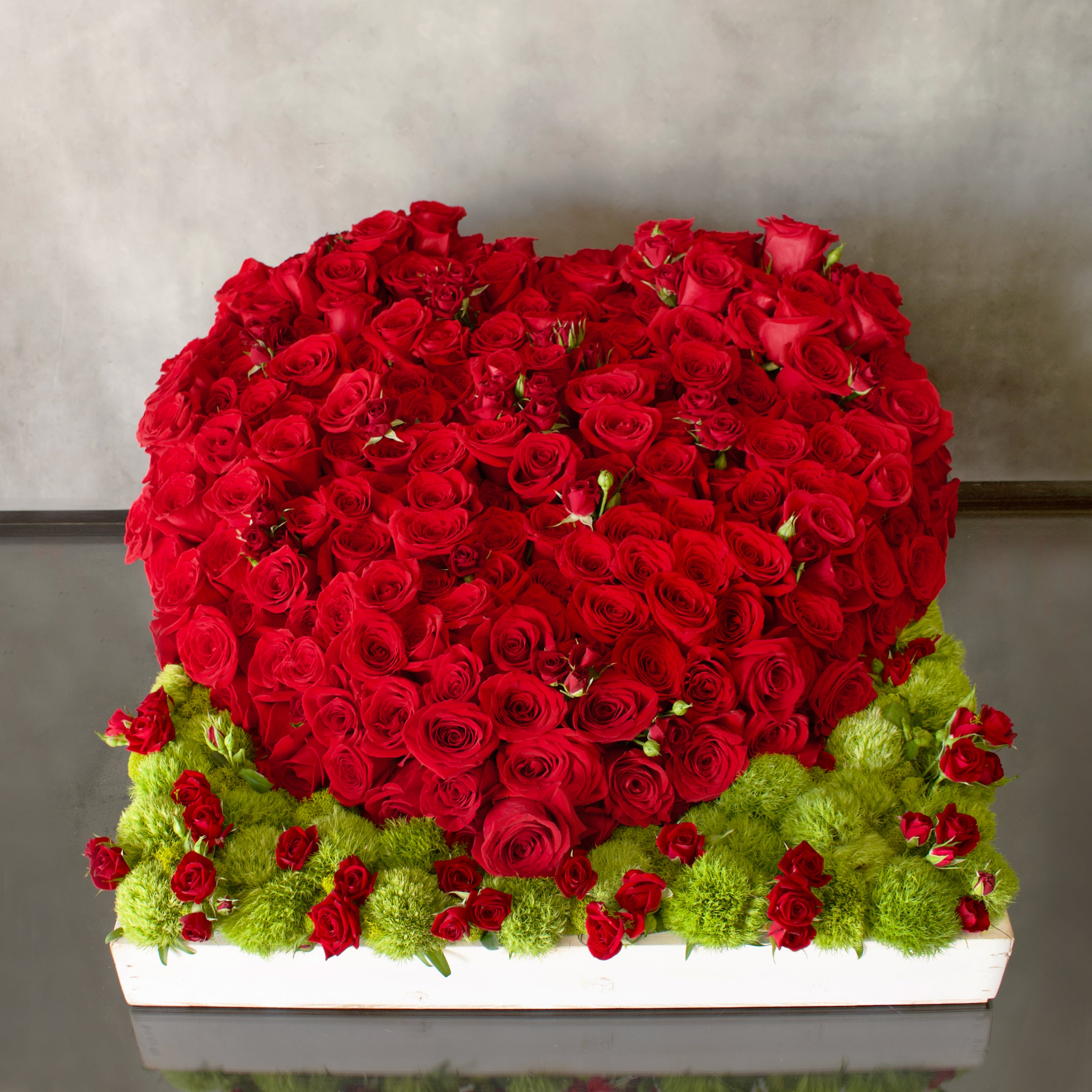 This heart desire rose arrangement will truly impress the one you love. There is about 300 roses placed on a modern white low box.