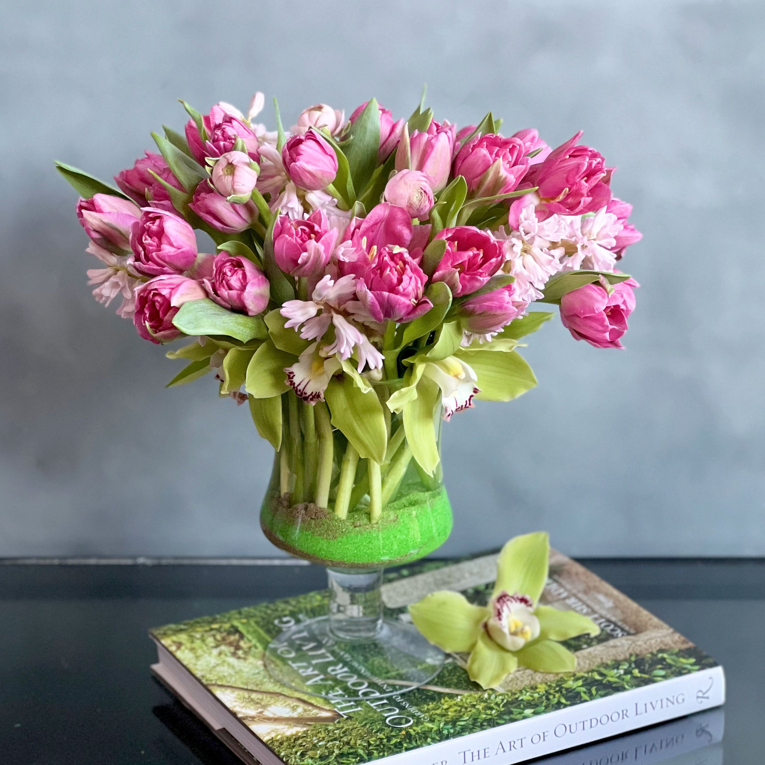 “Hello Spring” consists of a verity of pink spring flowers such as Hyacinths, 40 Dutch Multi Petal Tulips and Green Orchids, beautifully arranged for any occasion ! Just in time for the warmer seasons !
