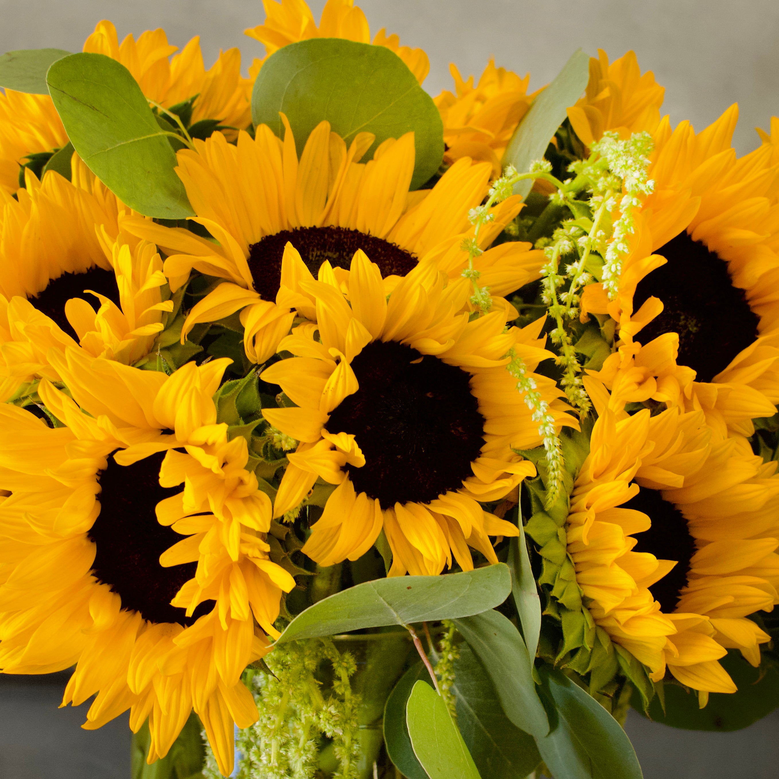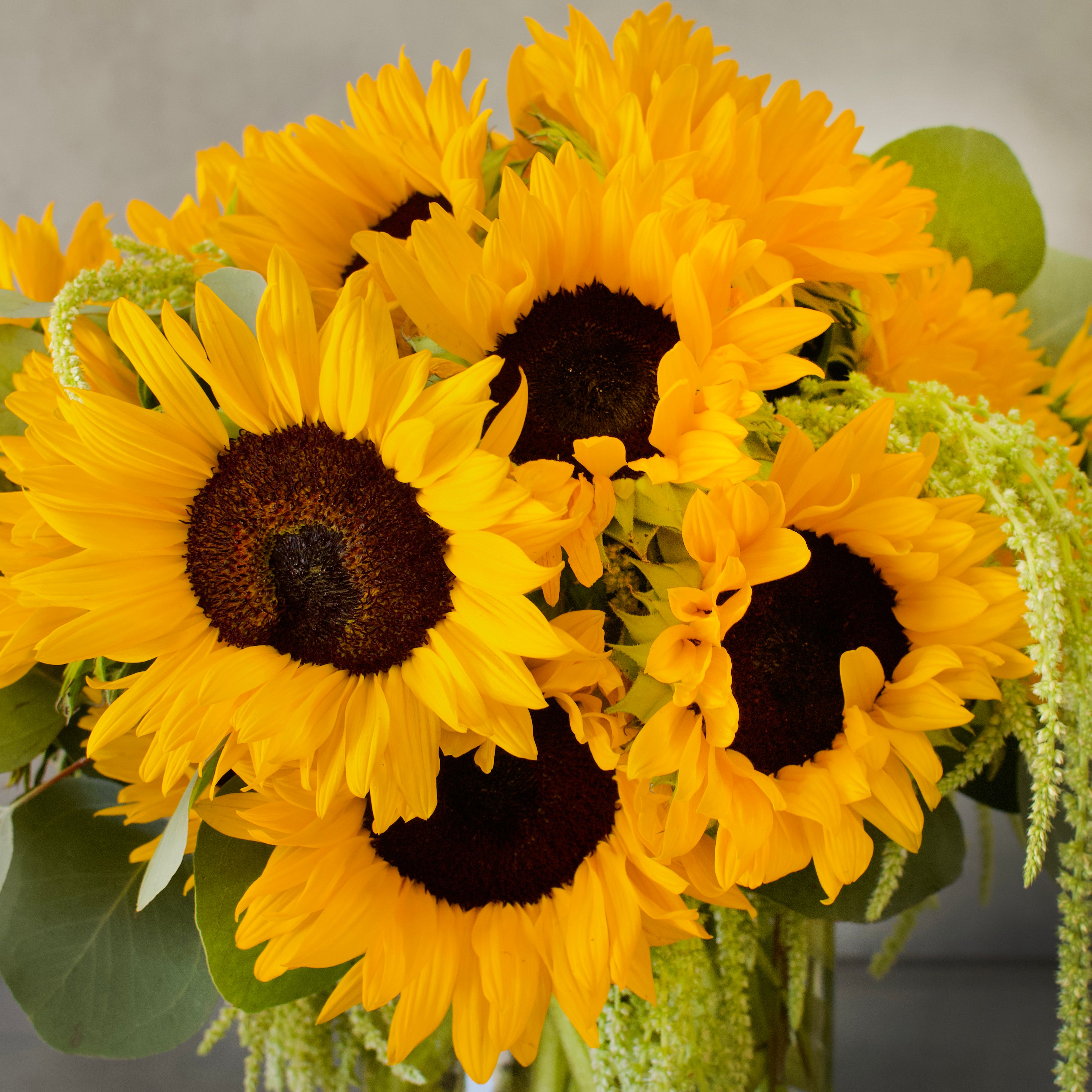 A bright arrangement of Sunflowers ! A classic with a beautiful green touch with our seasonal greens. Adding a chic touch to a sunny arrangement. Placed in a clear glass Cylinder vase.