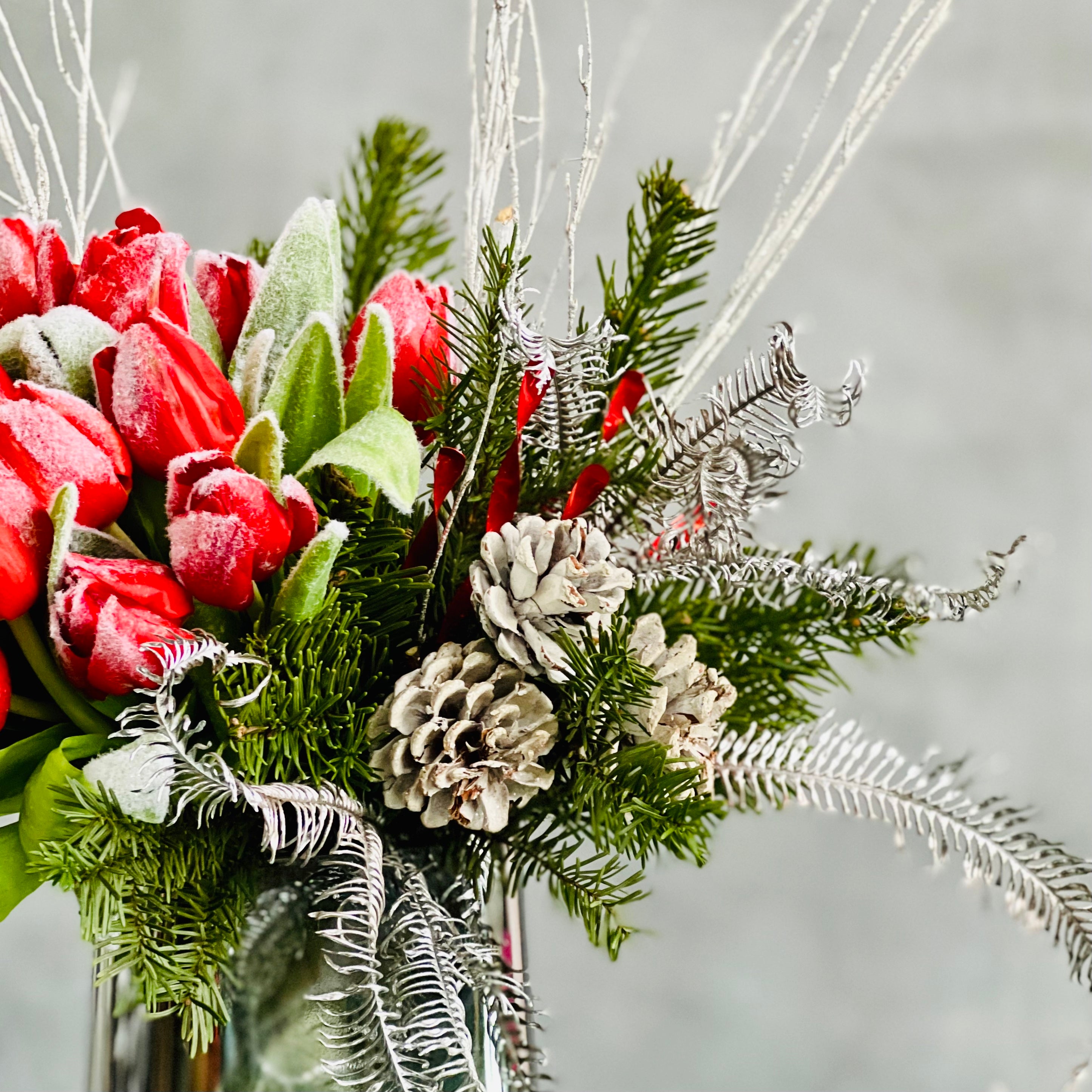 Our new Tulips are perfect for the Holiday season. An Arrangement created with red Tulips that have frosted tips and accented with Acorns and seasonal greens to create a beautiful centerpiece.