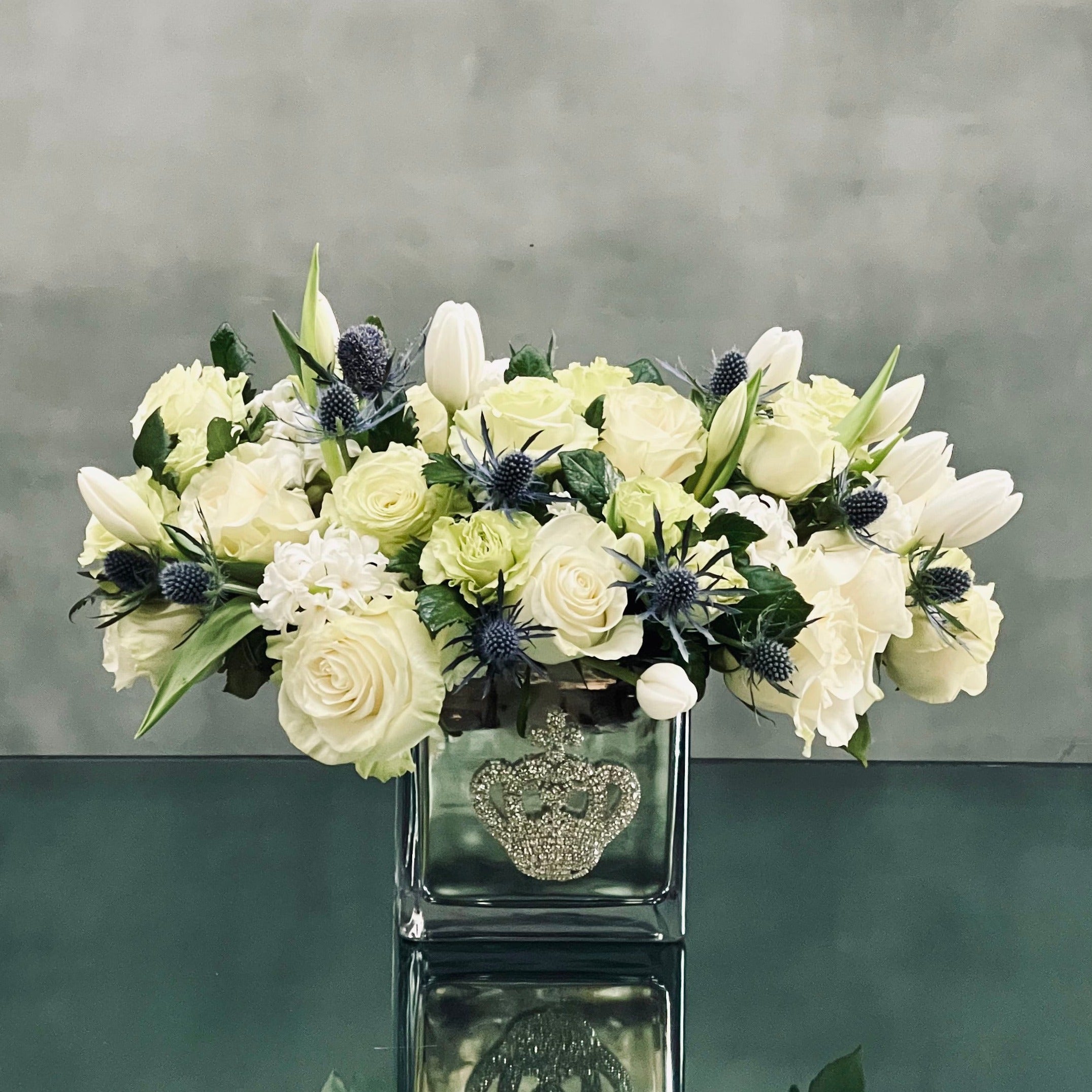 Beverly Hills Florist presents a variety of White Roses and Tulips, accented with Thistles in a silver vase. Made sure to shine with its bejeweled crown ! Available for same day delivery. Making it a perfect fit for Love and Romance, Birthday or a thank you !