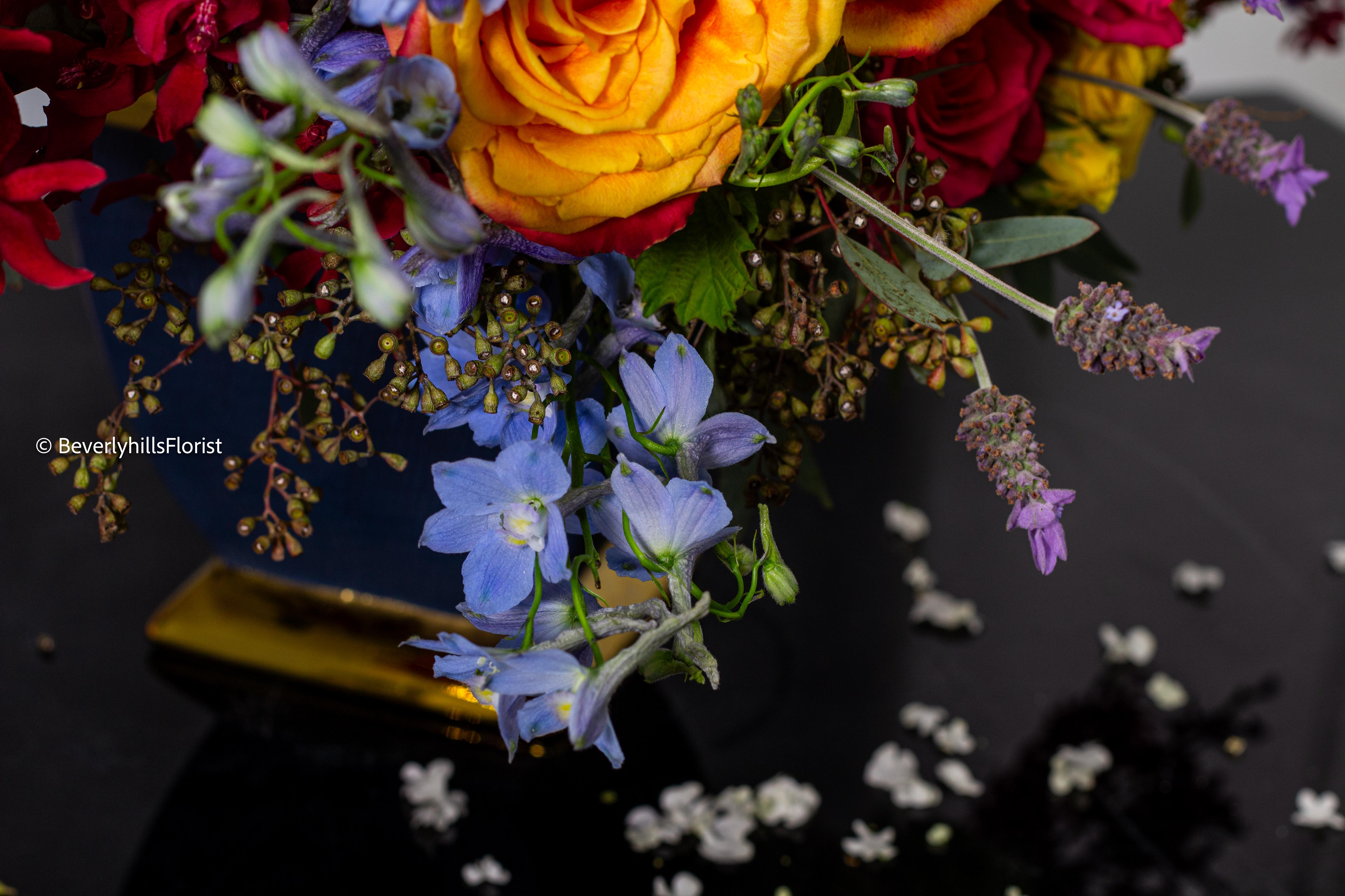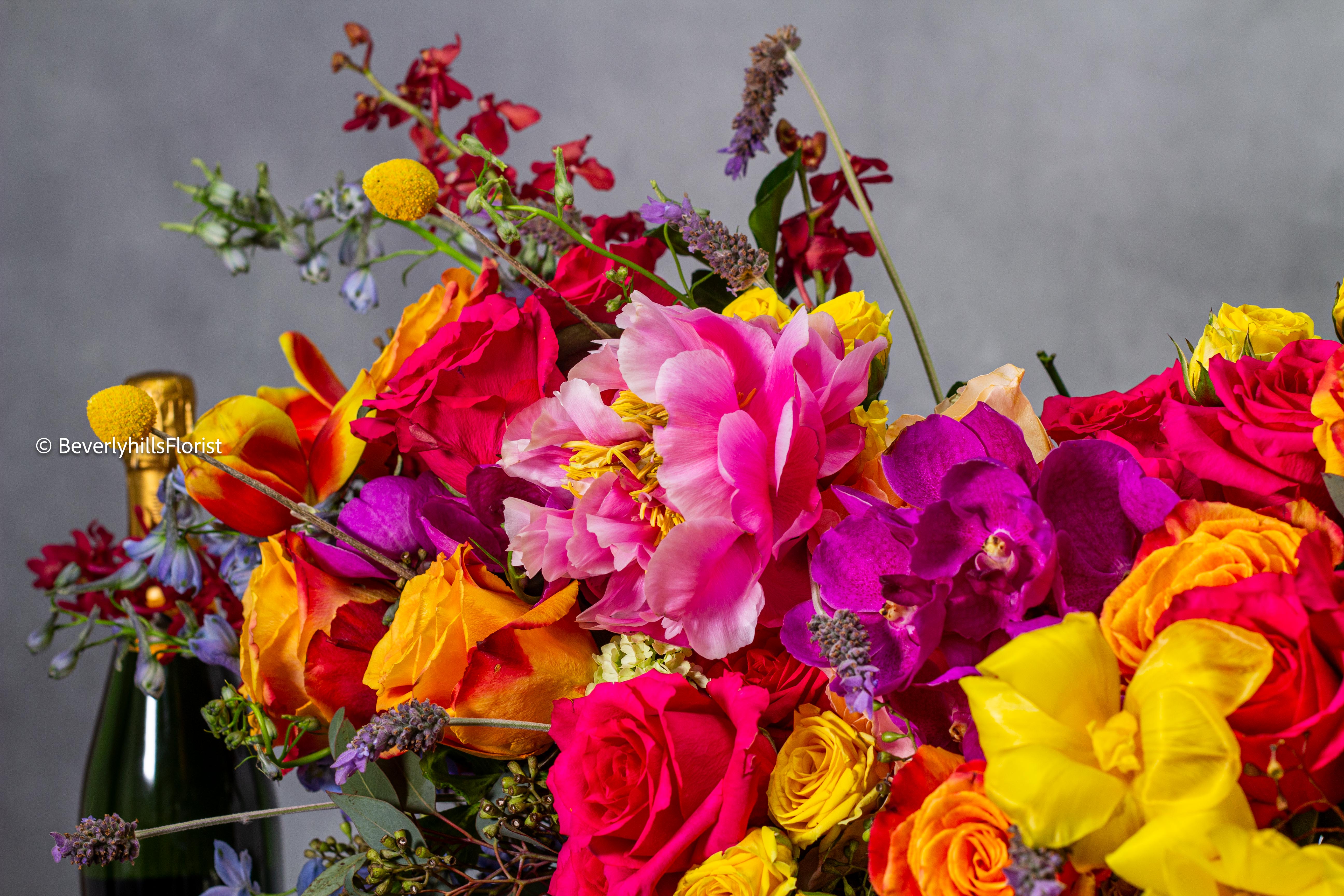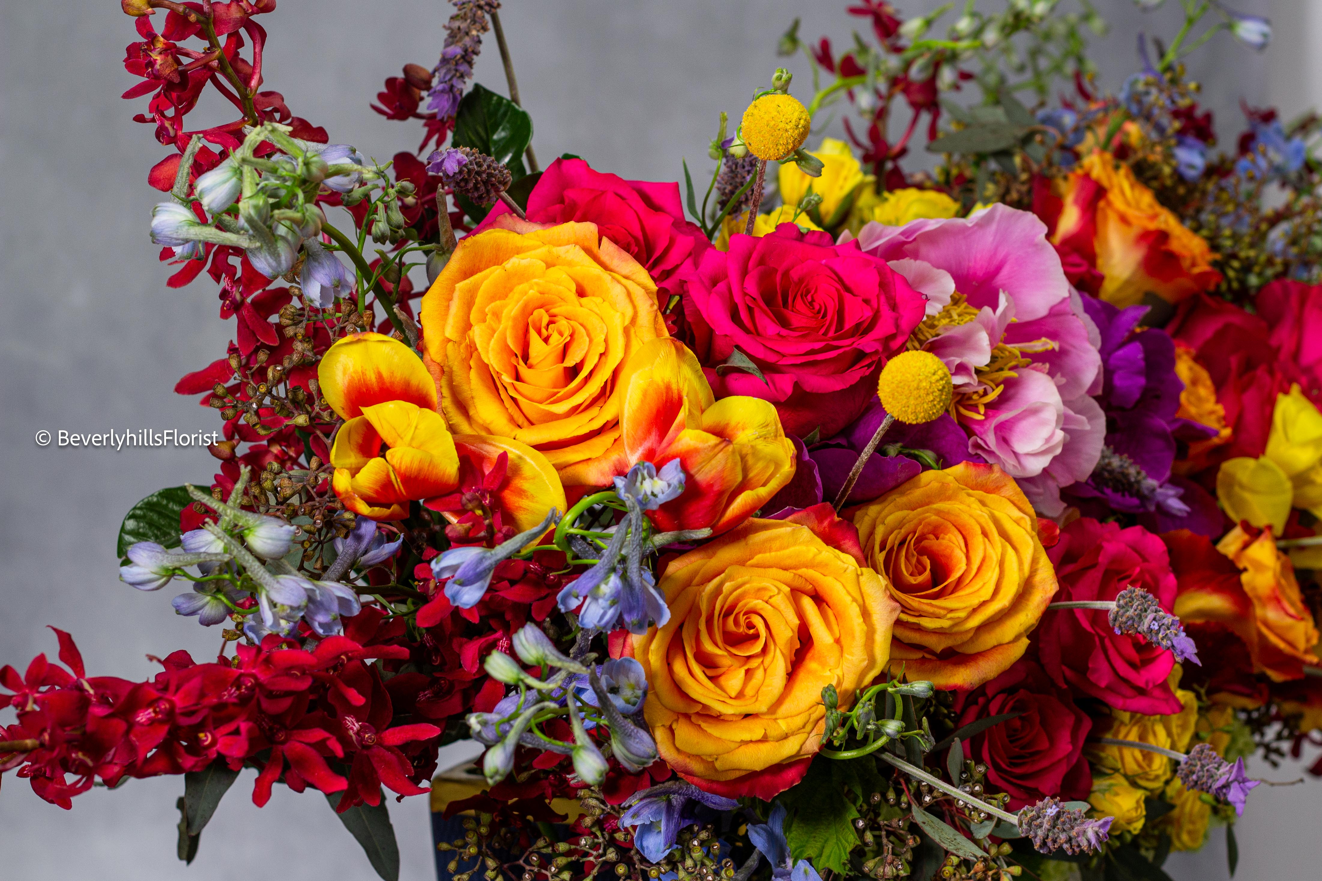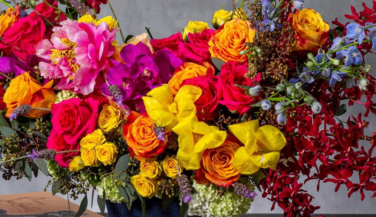 A dark ceramic vase becomes a canvas for a lively display of nature’s most vibrant hues. Bursting forth with radiant energy, vibrant yellow blooms take center stage, their golden petals gleaming with joy. Interspersed among them, pink florals add a delicate touch of femininity, while seasonal orchids lend an air of exotic allure. This enchanting arrangement is a symphony of color and contrast, creating a captivating focal point that exudes elegance and charm.