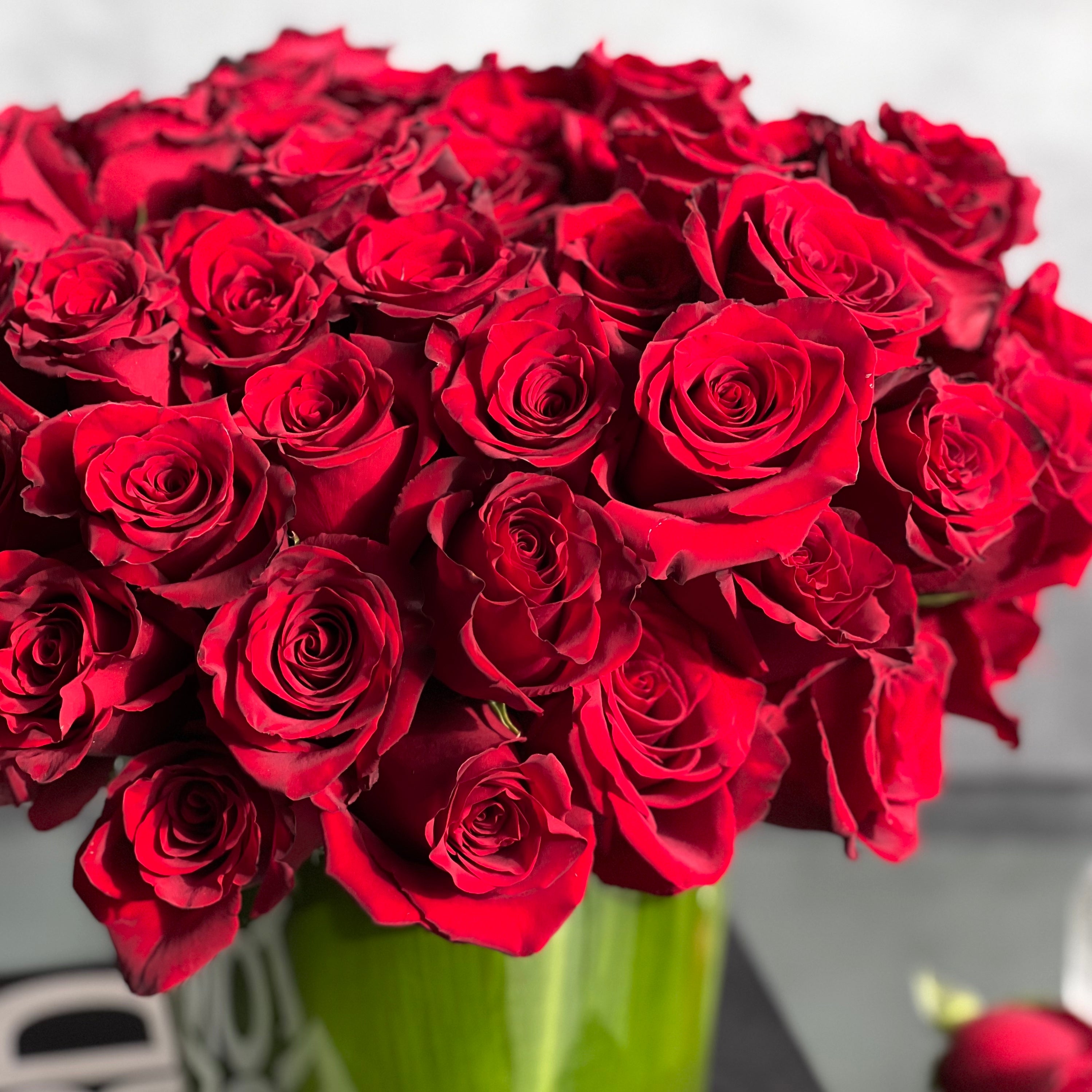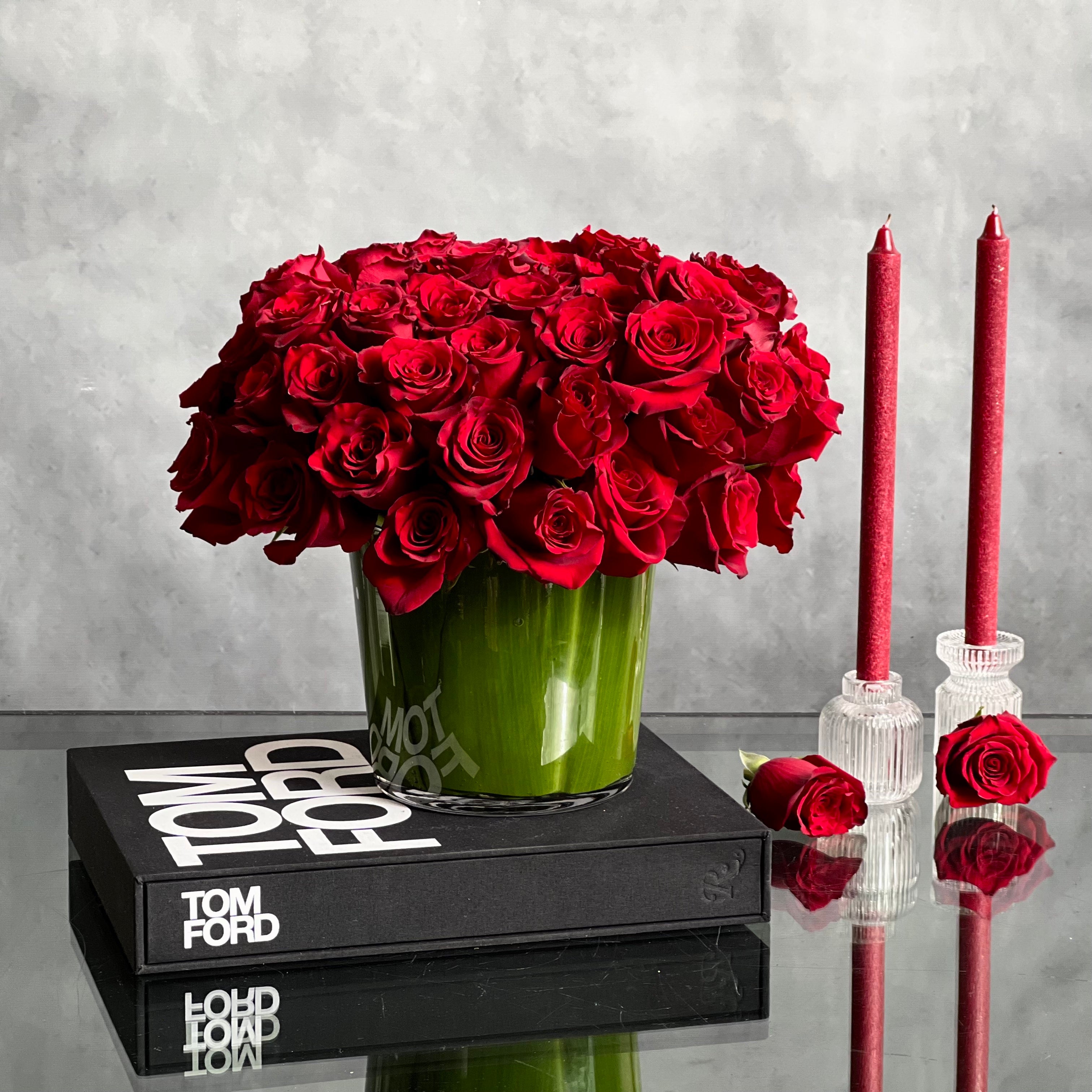 Celebrate the timeless beauty of roses with our Kiss from a Rose arrangement. Featuring up to 75 luscious, fresh roses, this minimalist design is showcased in a 7″ glass vase elegantly lined with leaves. A perfect gift or centerpiece to highlight any occasion. Measurements: 14″ tall and 15″ wide.