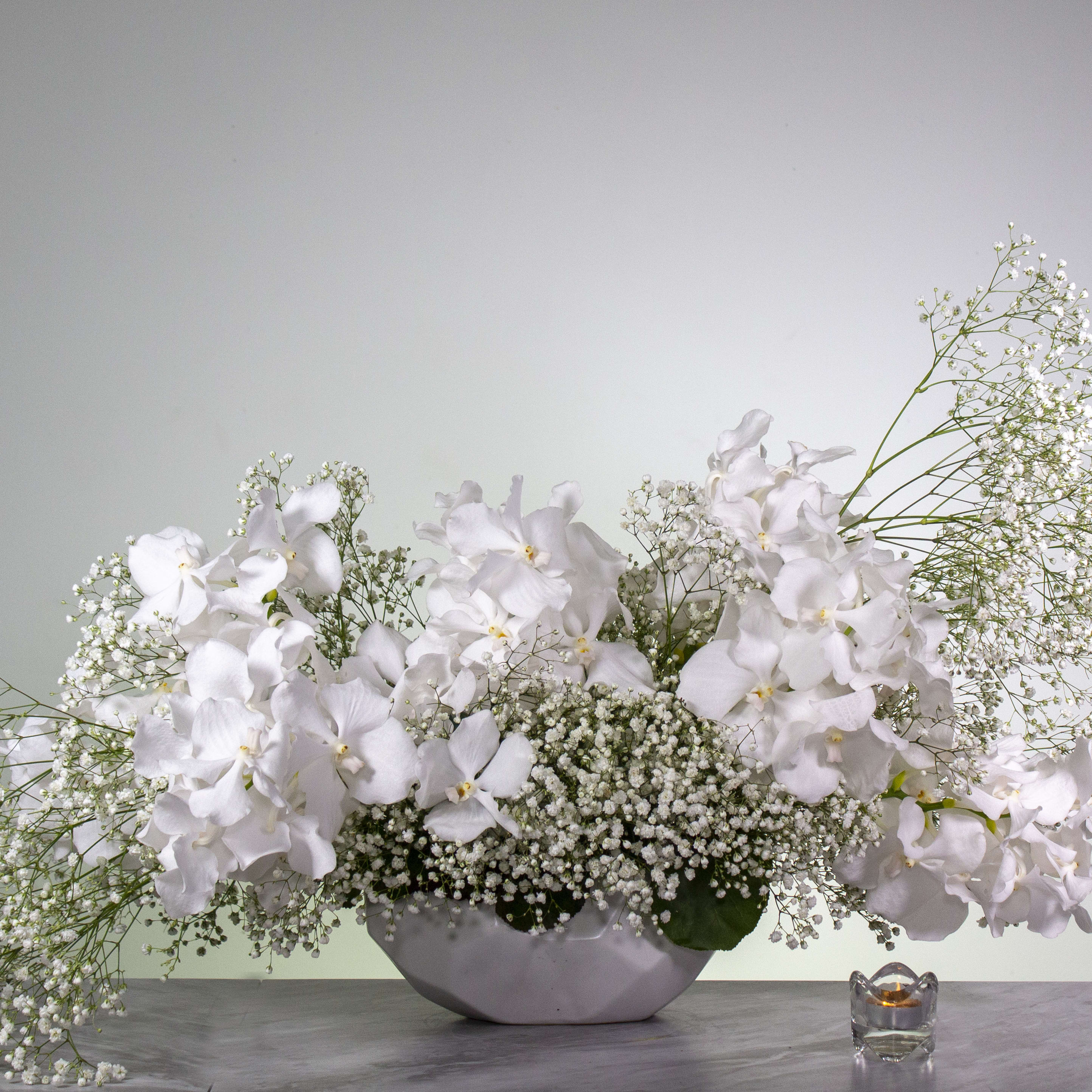 A stunning gift from any angle! Add style to any room with this beautiful arrangement of Regal White Vanda Orchids accented by ethereal baby’s breath arranged in a ceramic white planter with a unique geometric motif. An arrangement that makes a lasting impression.