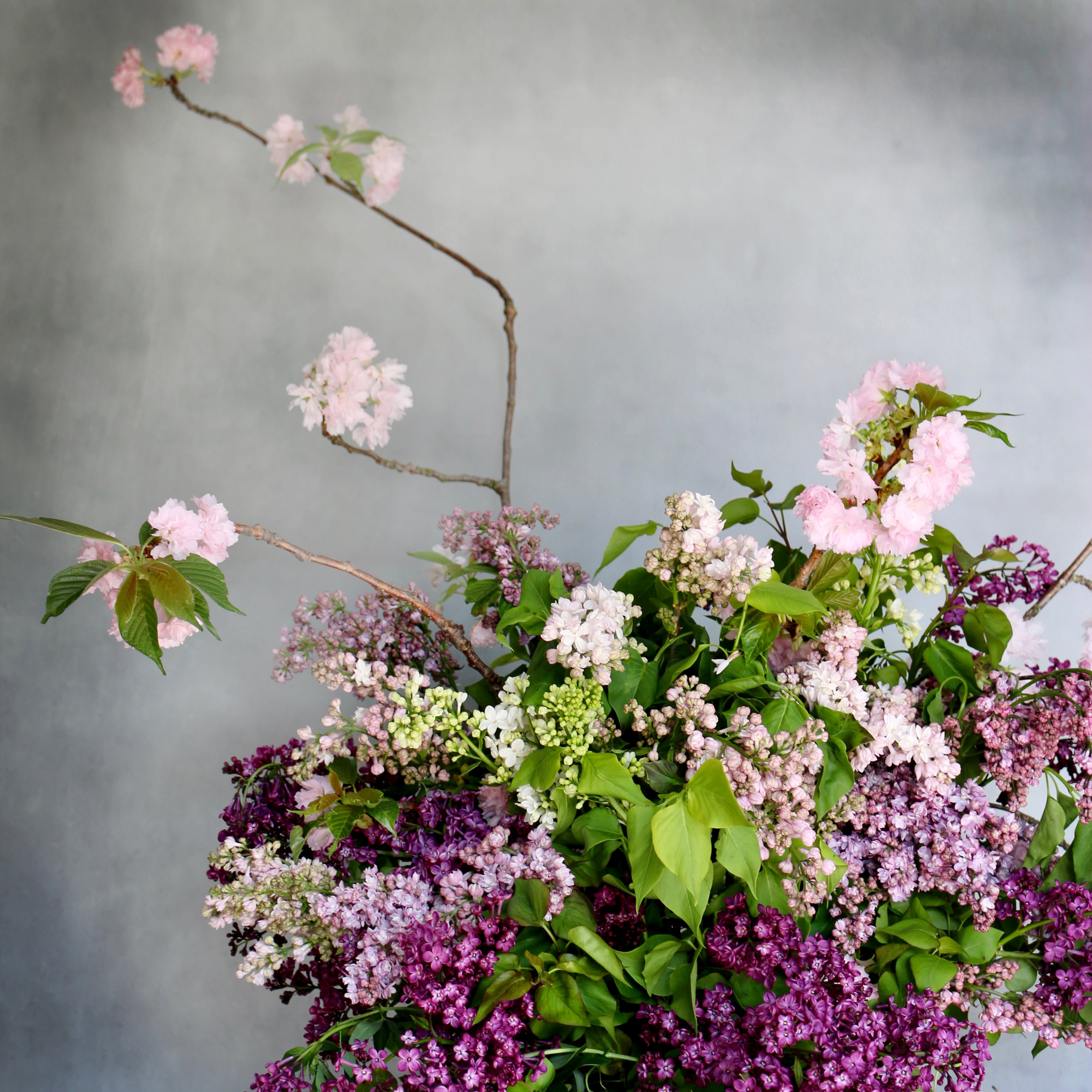 Purple shades of lilac paired with cherry blossom makes this arrangement eye catching. It is wonderful on any room setting.