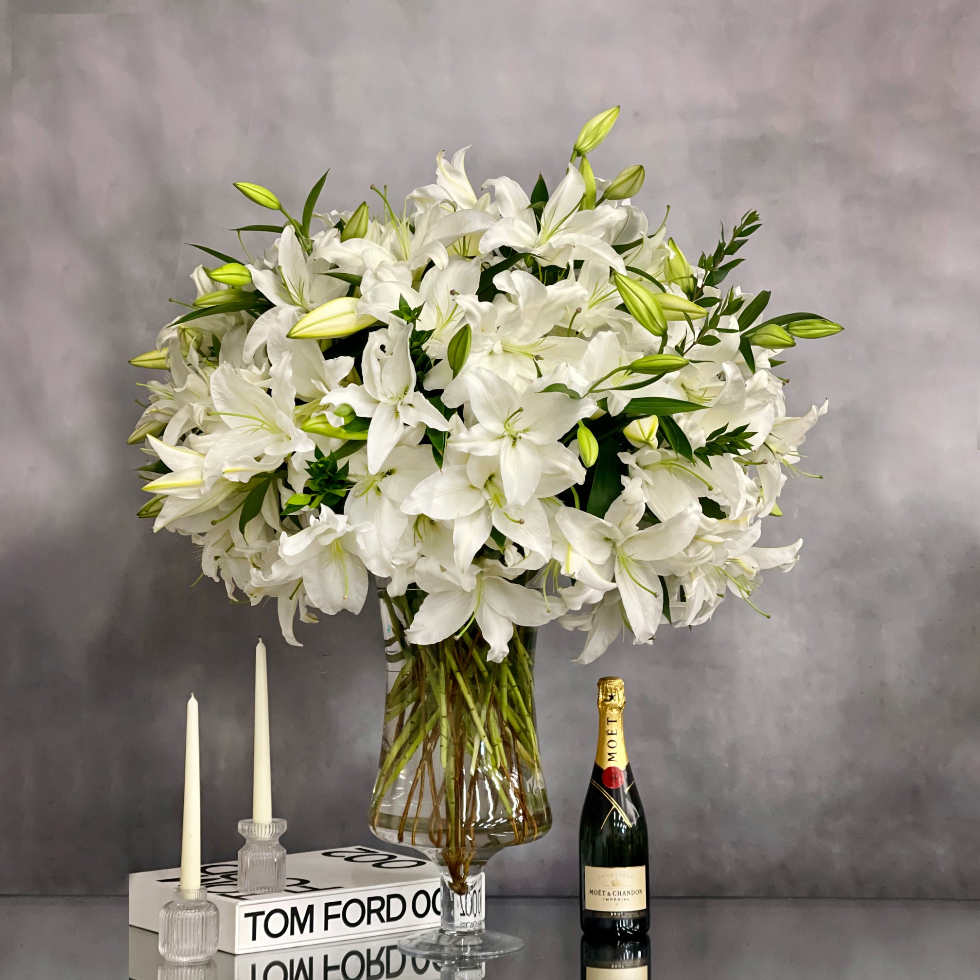 An arrangement that is made with 50 stems of Casablanca Lillies. A glorious and simplistic chic arrangement which is sure to make a statement. All arranged within a tall standing glass vase.