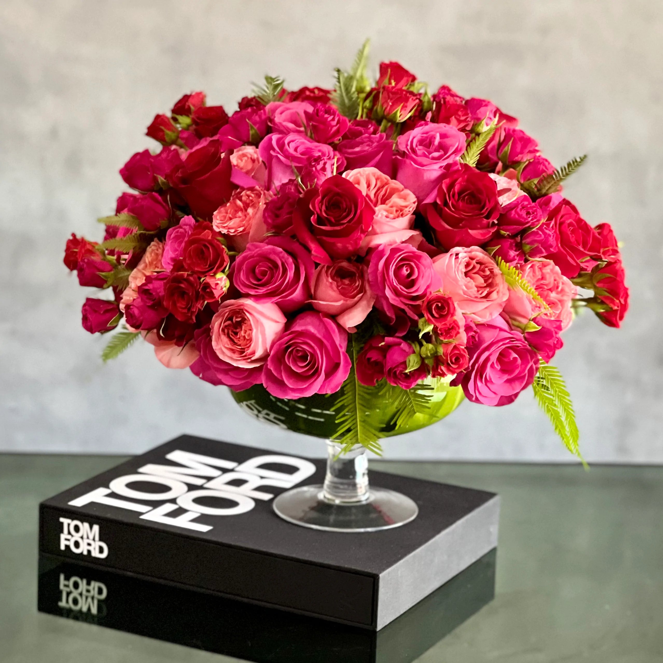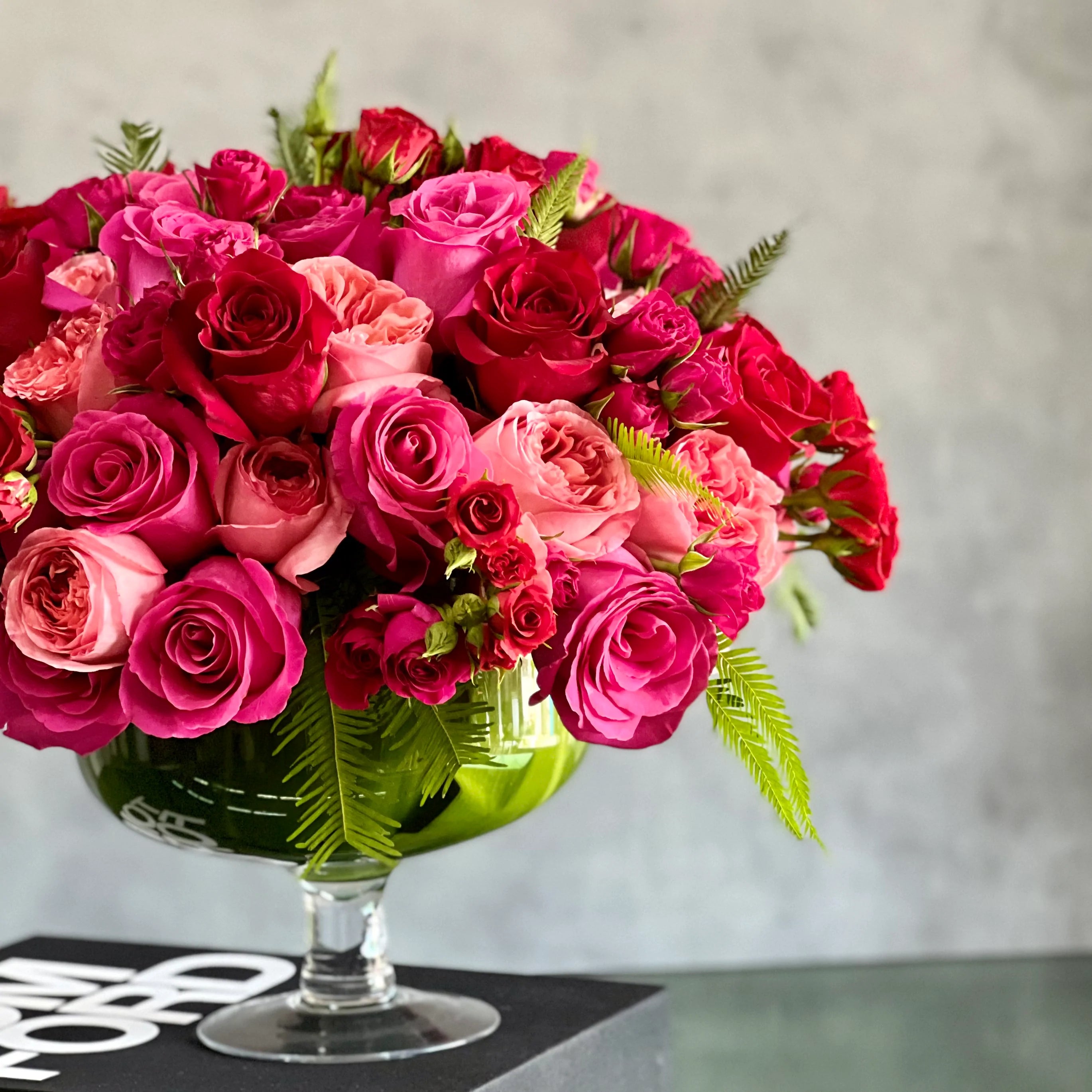 The Love arrangement is a bold and elegant display of deep red and hot pink roses, designed to make a grand impression. With a head measuring 15″ round, this luxurious arrangement is perfect for expressing love, admiration, or celebrating a special occasion. The Standard version features 100 roses, while the Deluxe size includes 150 roses, Premium offers 250 roses, and the Grand boasts a stunning 500 roses for an even more extravagant presentation. Available for same-day delivery by Beverly Hills Florist, it’s the ultimate statement of affection for anniversaries, romantic gestures, or special occasions.