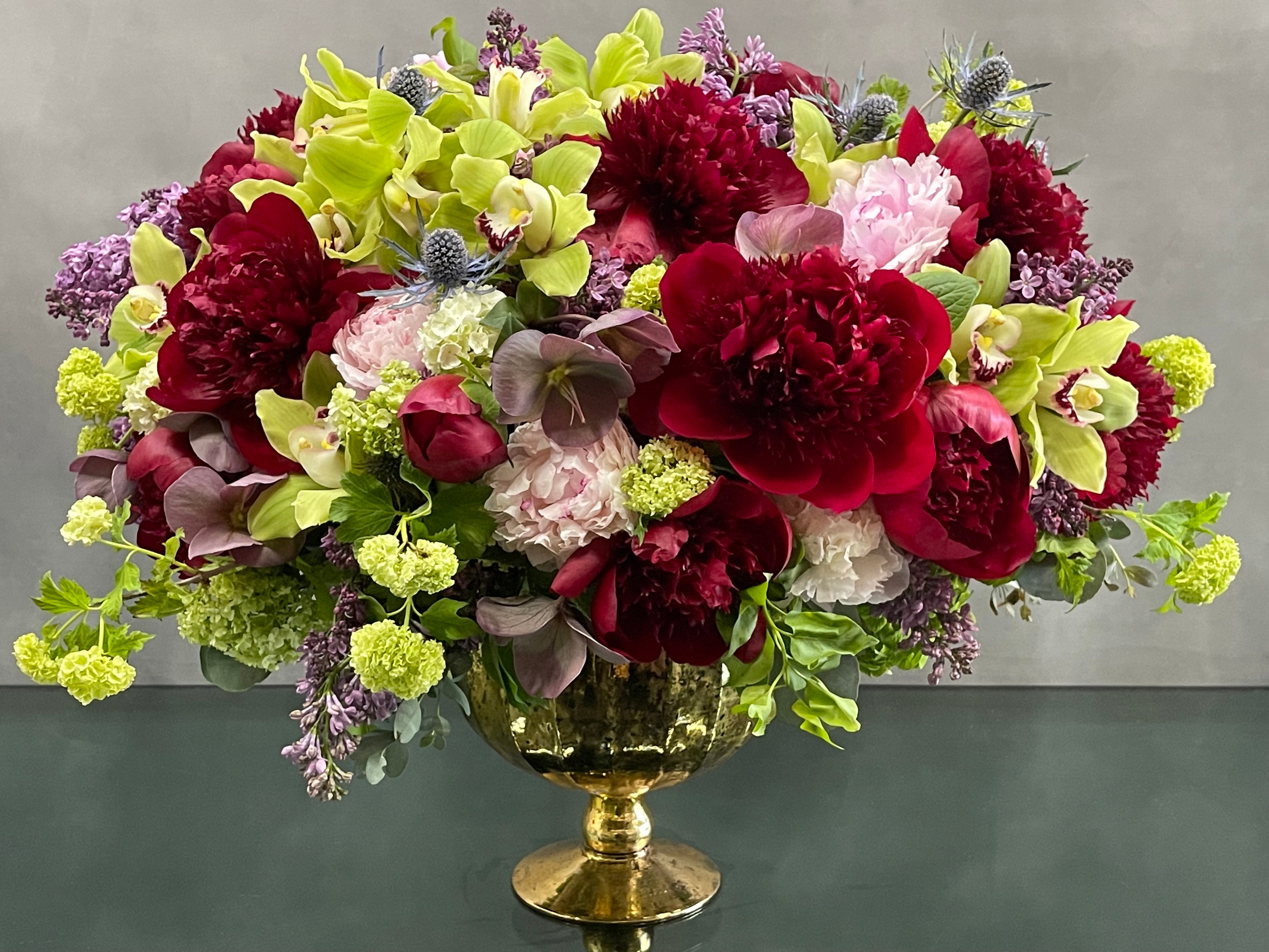Our Lovely Together arrangement is available for same day delivery! This is a double sided arrangement on a gold pedestal bowl. Floral includes burgundy and pink peonies, cymbidium orchids, thistle, and Lilac. Flowers may vary depending on the season. An absolute gesture of love and romance, perfect for anniversary, birthday and I’m sorry.
