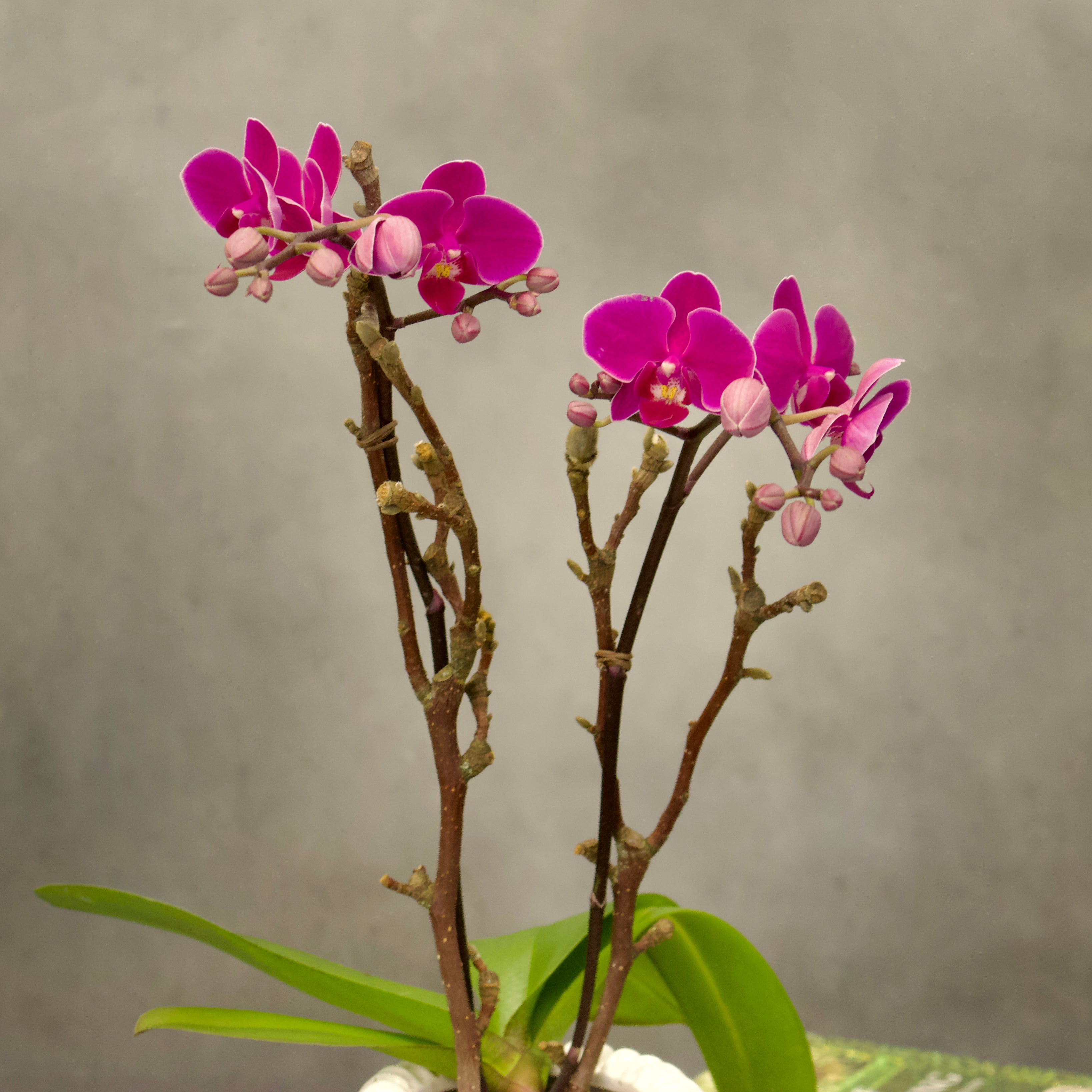 Double stem purple orchids in a white modern vase. Perfect gift for saying Thank you, get well, house warming, and new beginnings.