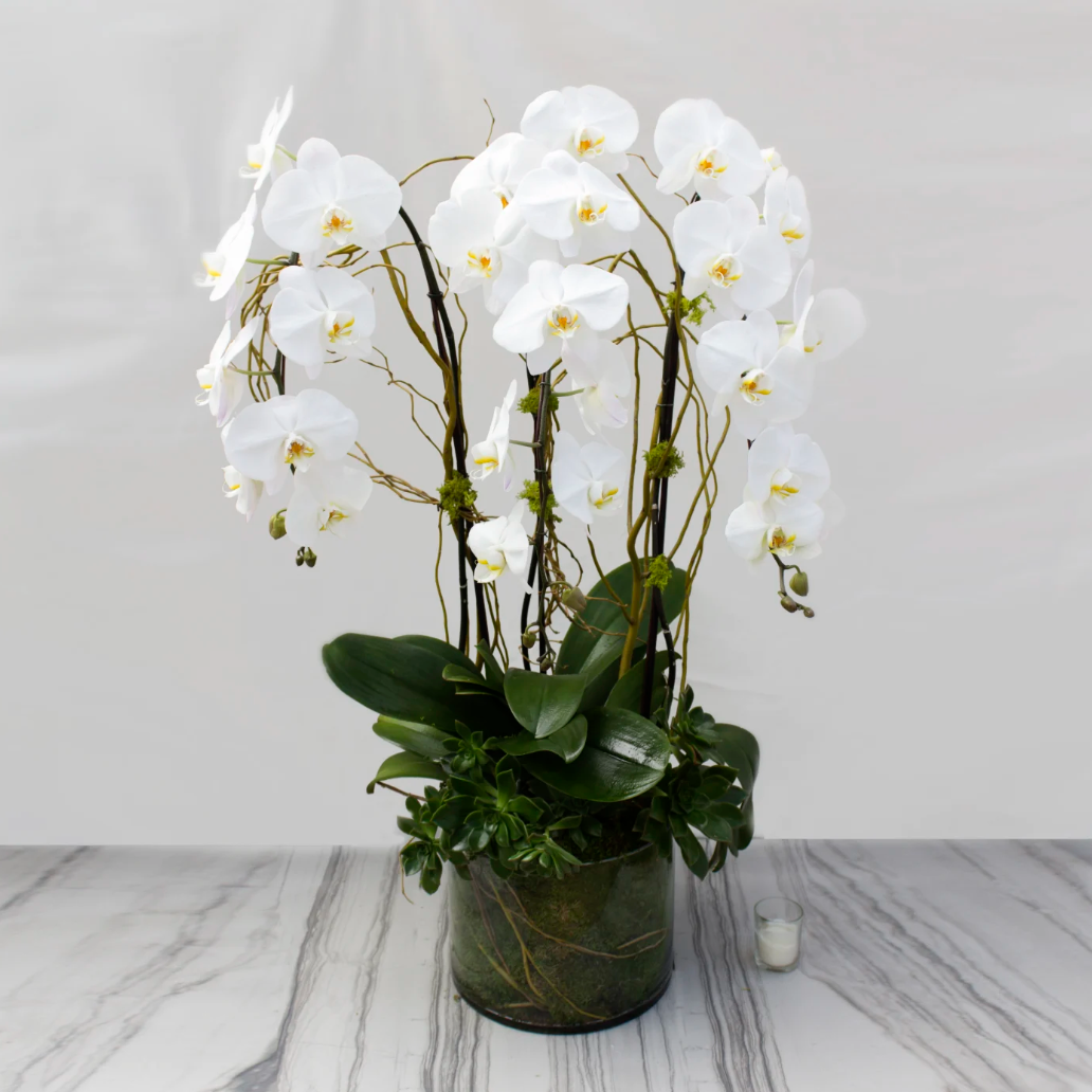 A cascade of 3 Orchids emerge from a cluster of greens atop a glass vase. Pure and simple elegance.