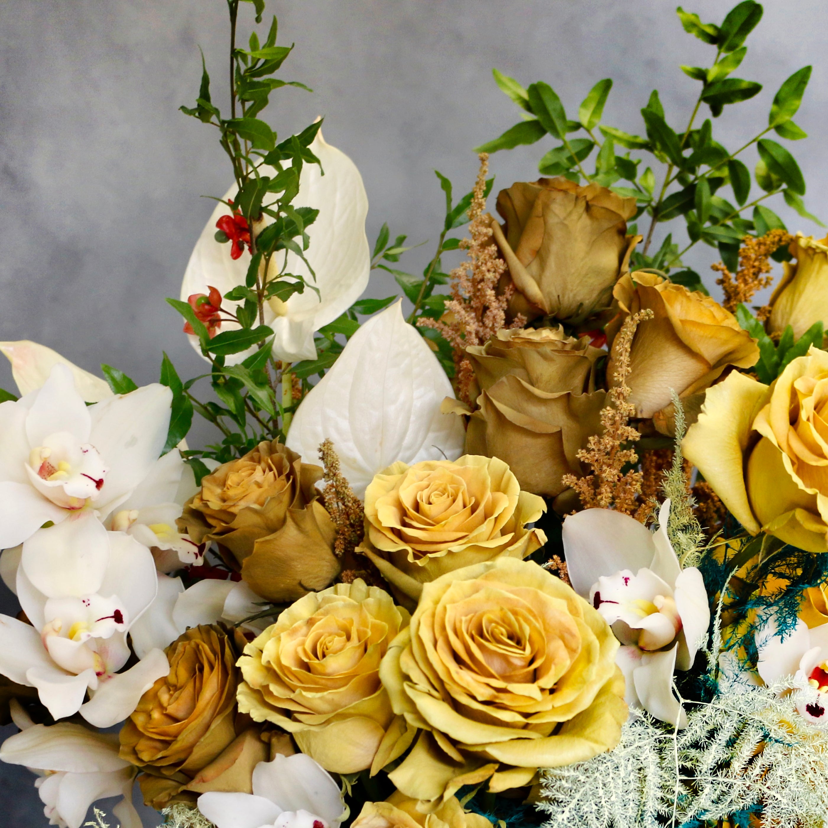 A unique mix of large mustard Roses, accented by white cymbidium orchids, and teal and cream dry elements in a cool cylindrical vase. This combination of soft colors with fall colored roses offers a distinct palette of floral beauty.
