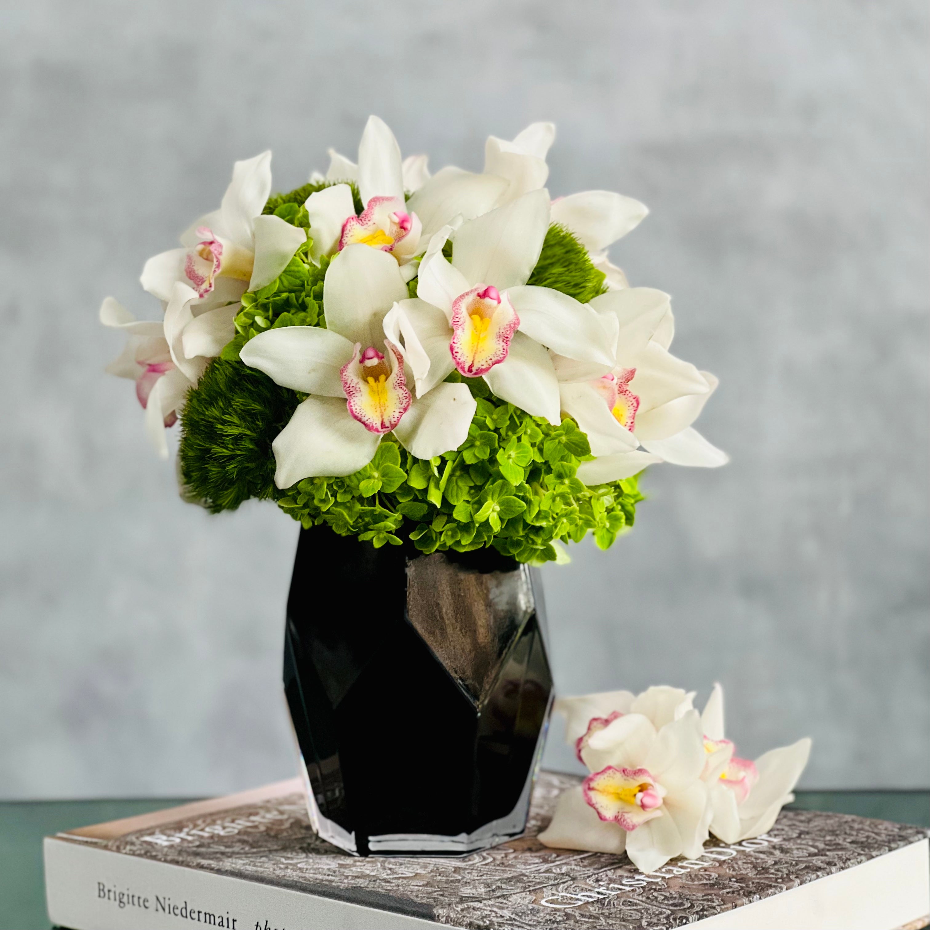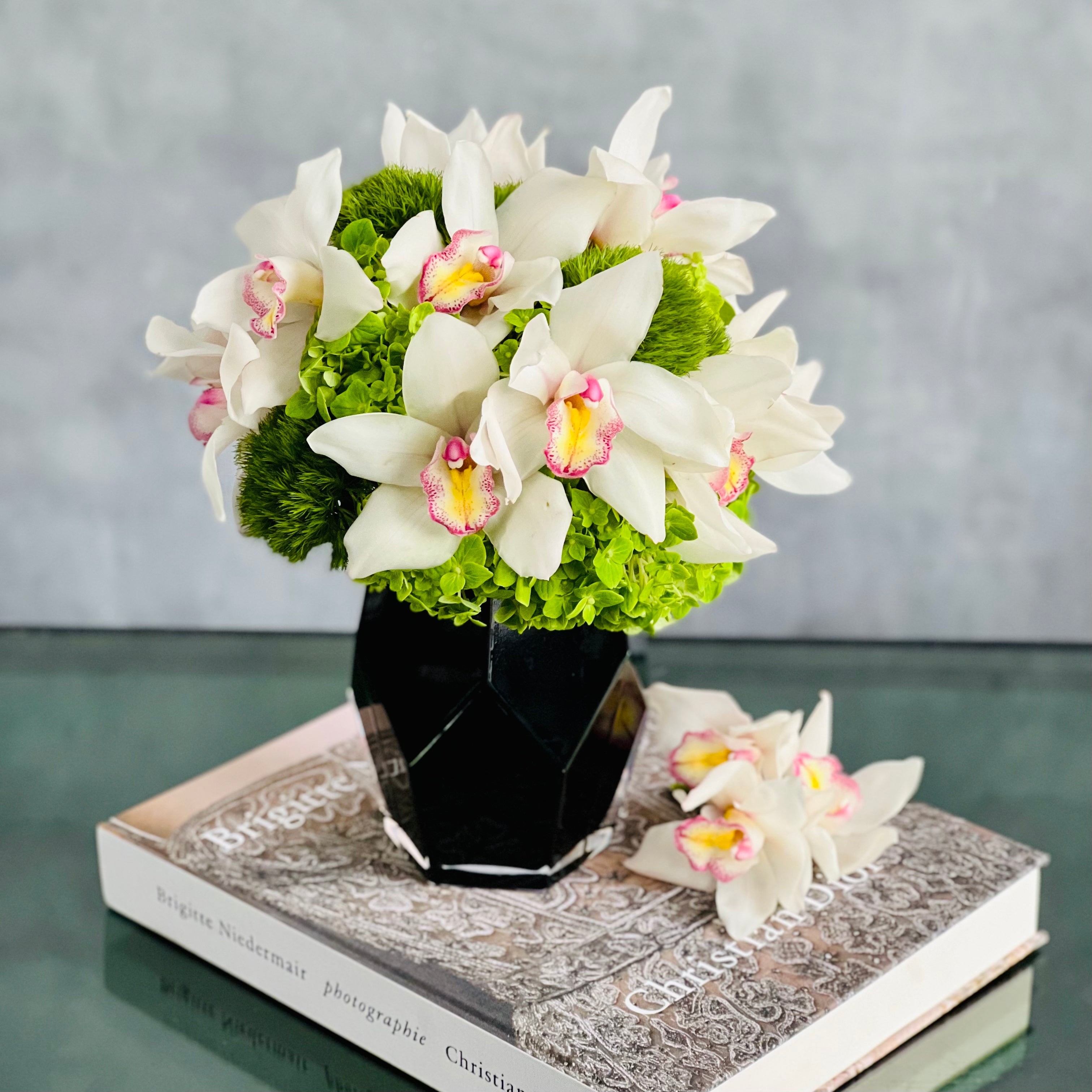 My Beverly Hills Florist offers Opulent Orchids in a distinctive snow white Cymbidium Orchids and are amidst stark Green Moss Spheres in this perfect blend of simple meets sophisticated. This arrangement is sure to make a lasting impression! This floral piece is approximately 10 inches in height.