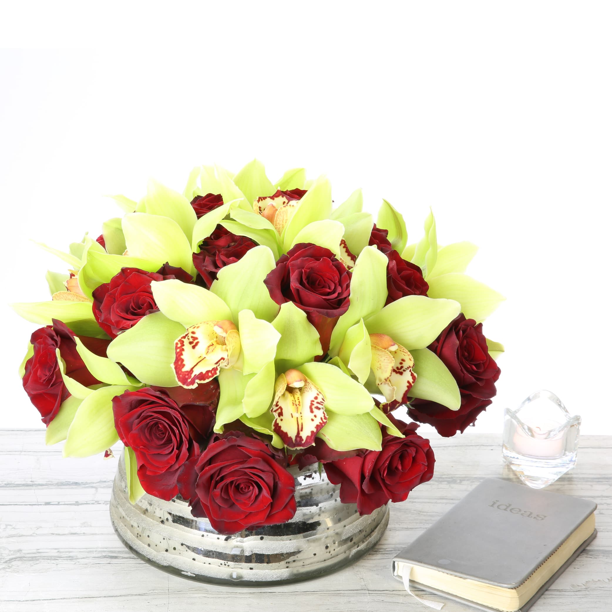 A modern touch to a low rounded arrangement featuring two elegant varieties. Low Red South American Roses are paved with waves of Green Asian Cymbidium Orchids to create a unique look in this contemporary glass container. Its vibrancy and elegance will grace any room or décor.
