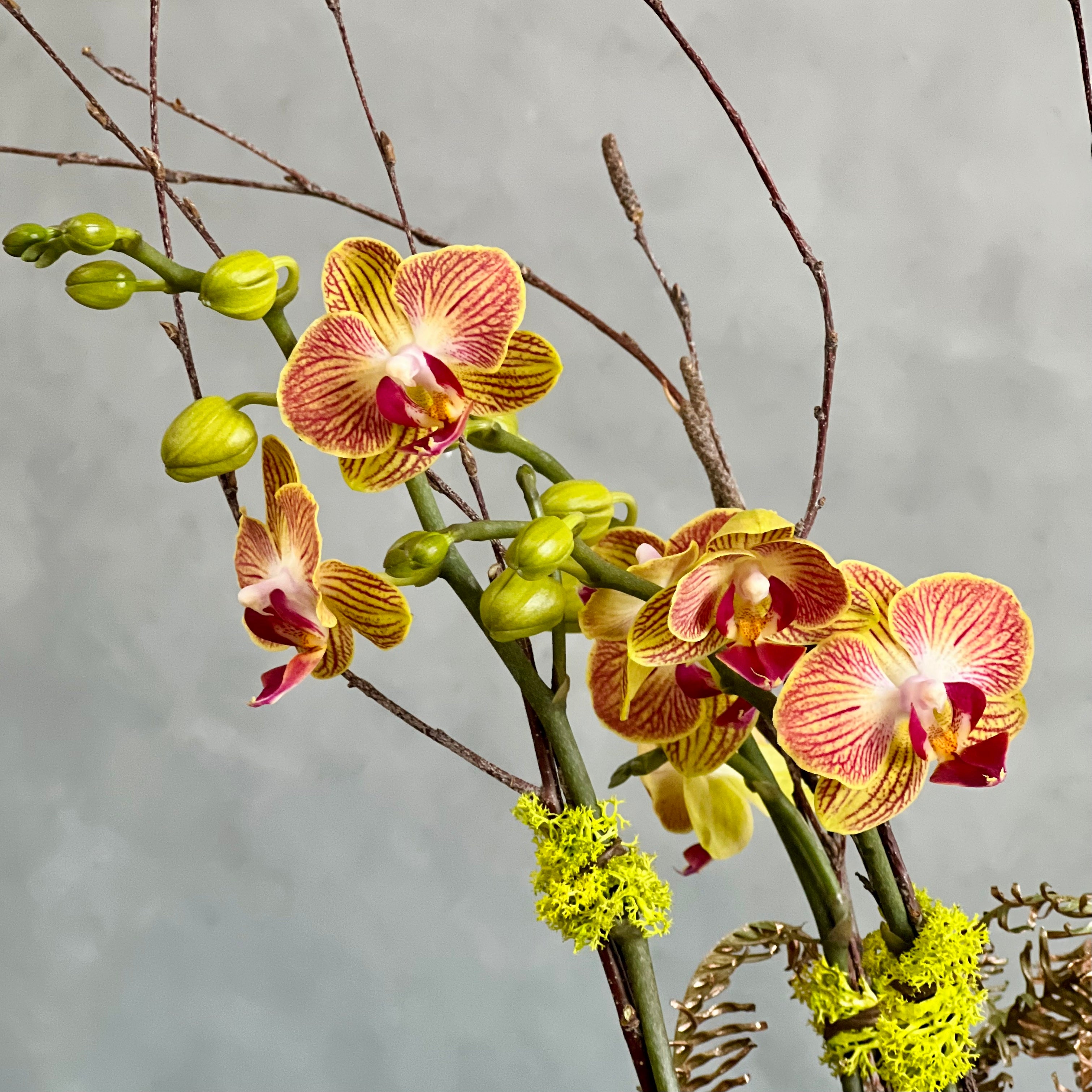 Like the warm, glowing shades of a beautiful sunset, our unique orange and yellow Phalaenopsis Orchids were meant to be put on display! Beautifully rising from a classy black ceramic planter potted with a succulent, it’s a charming gift that’s just the right size for any spot in your home or theirs.