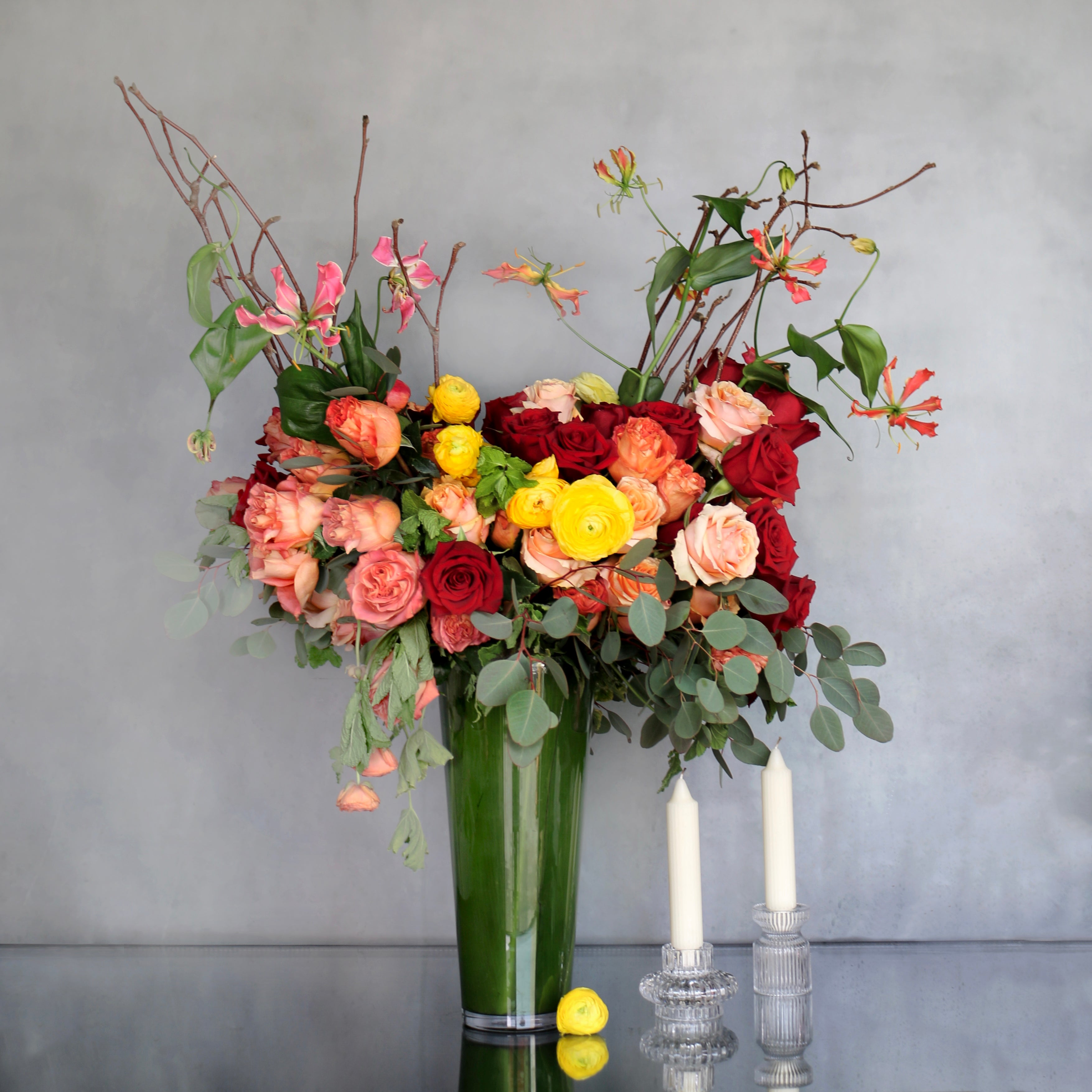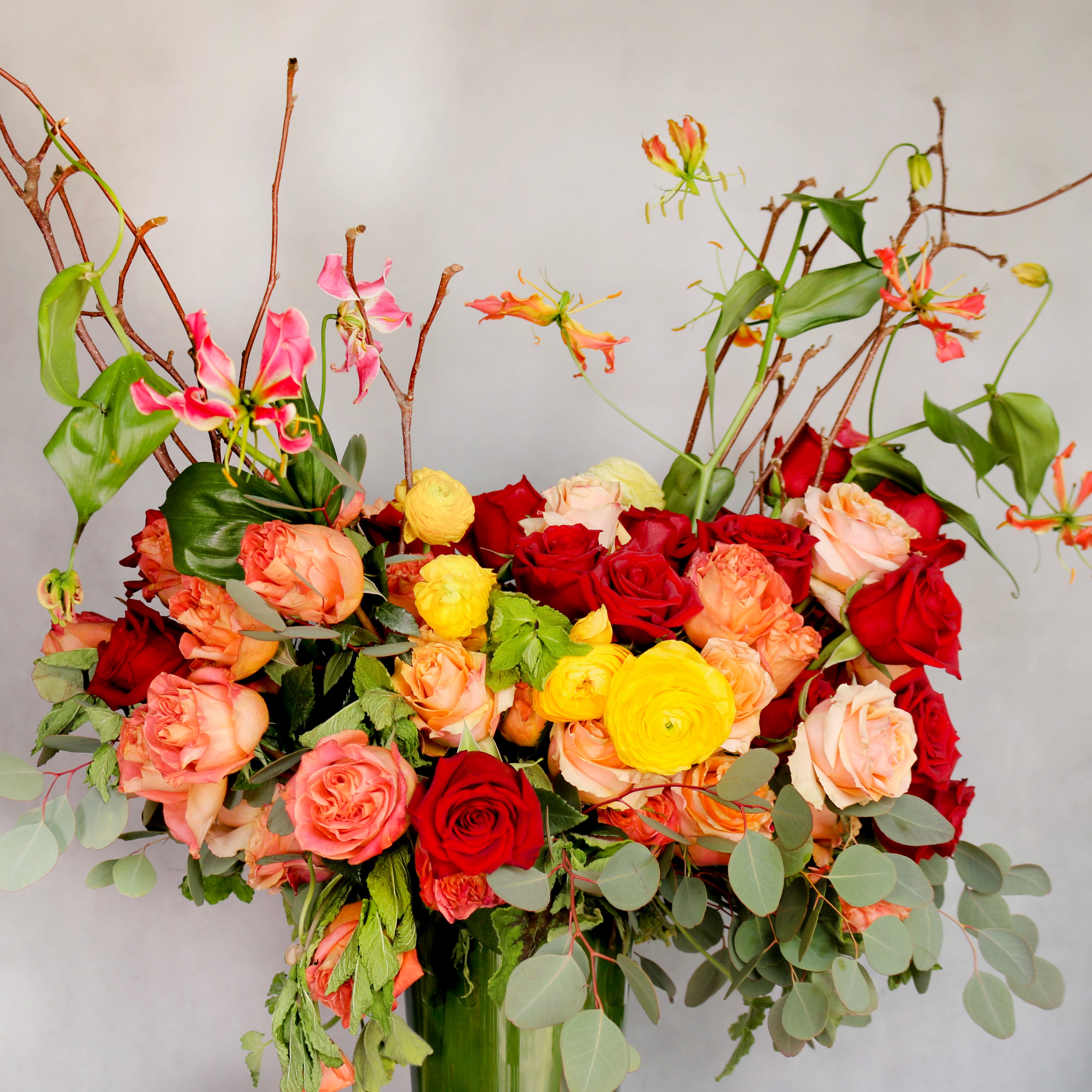 “Passion” is our statement piece ! This arrangement is placed in a long glass vase that is leaf-lined. Within this piece, there are Eucalyptus, yellow Ranunculus, peach and red Roses and various intricate spring florals.