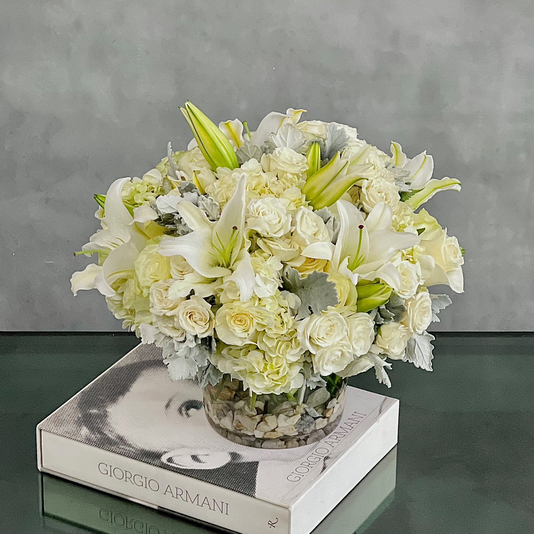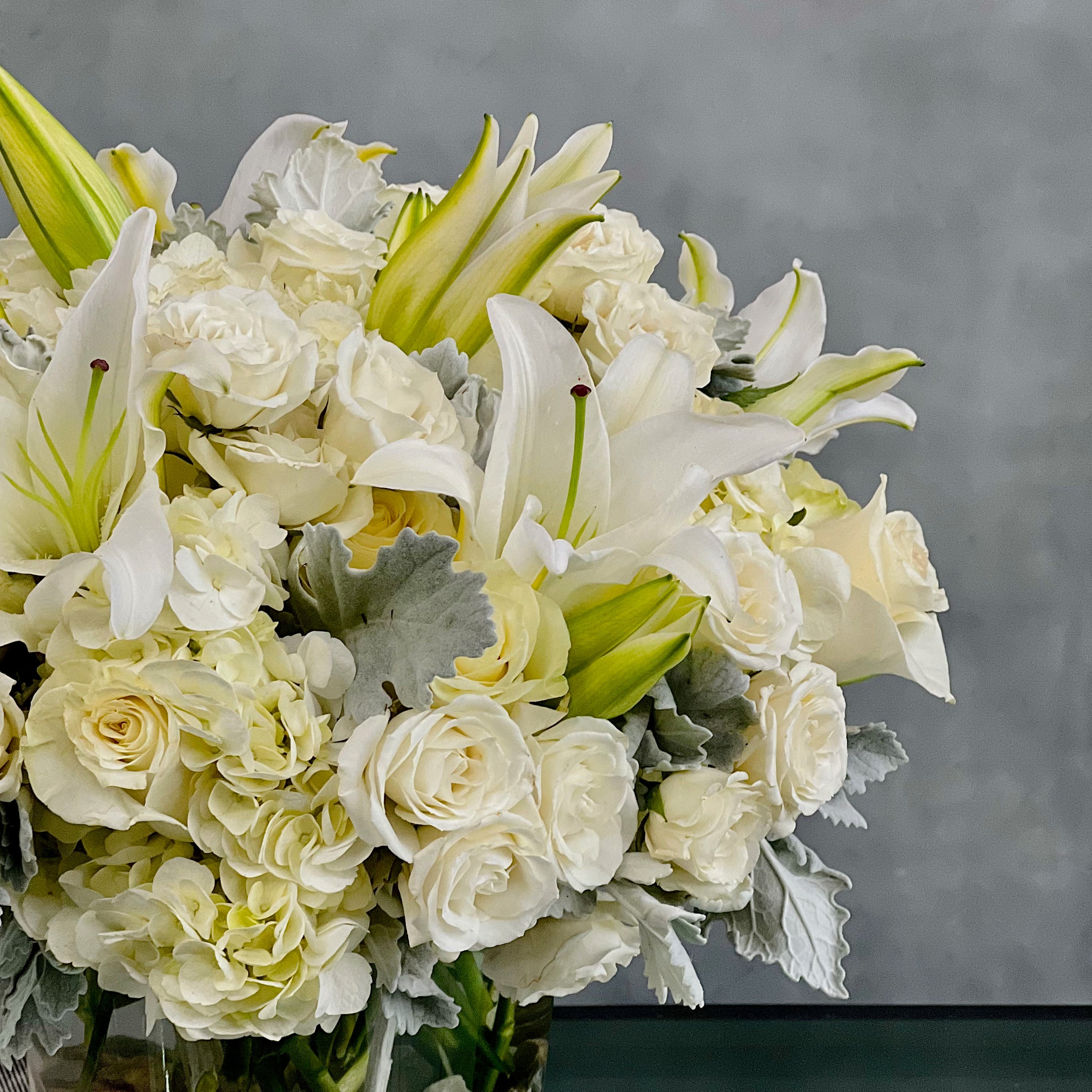 This dreamy white floral mix is heavenly. The cylinder glass vase holds an abundant cluster of stunning Roses, Casablanca Lilies and gorgeous Hydrangeas all in pure white.