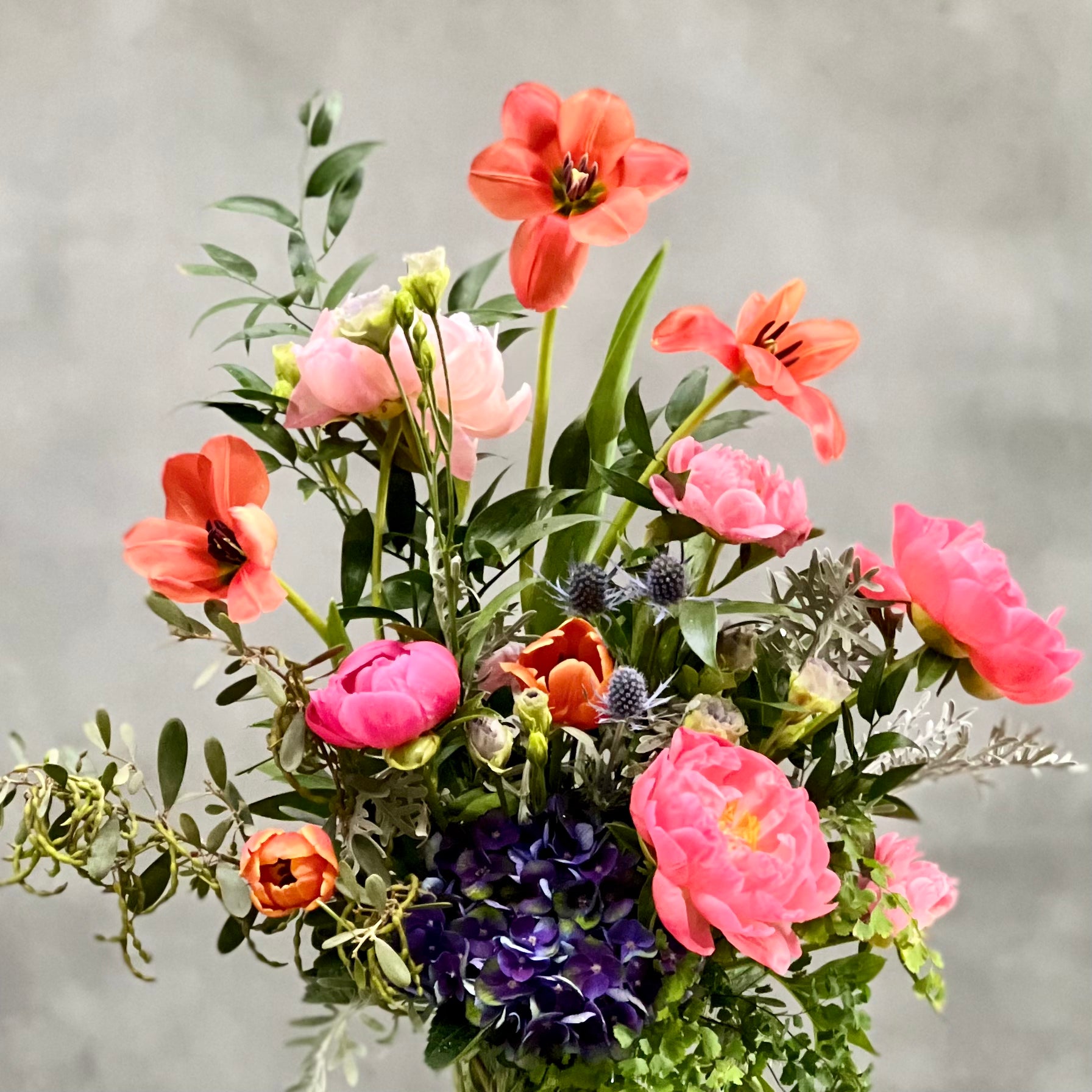 Picture the allure of coral peonies gracefully intertwined with the slender stems of tulips, creating a mesmerizing display of colors and textures. Each bloom is carefully selected and expertly arranged to ensure a harmonious composition that exudes sophistication and charm.