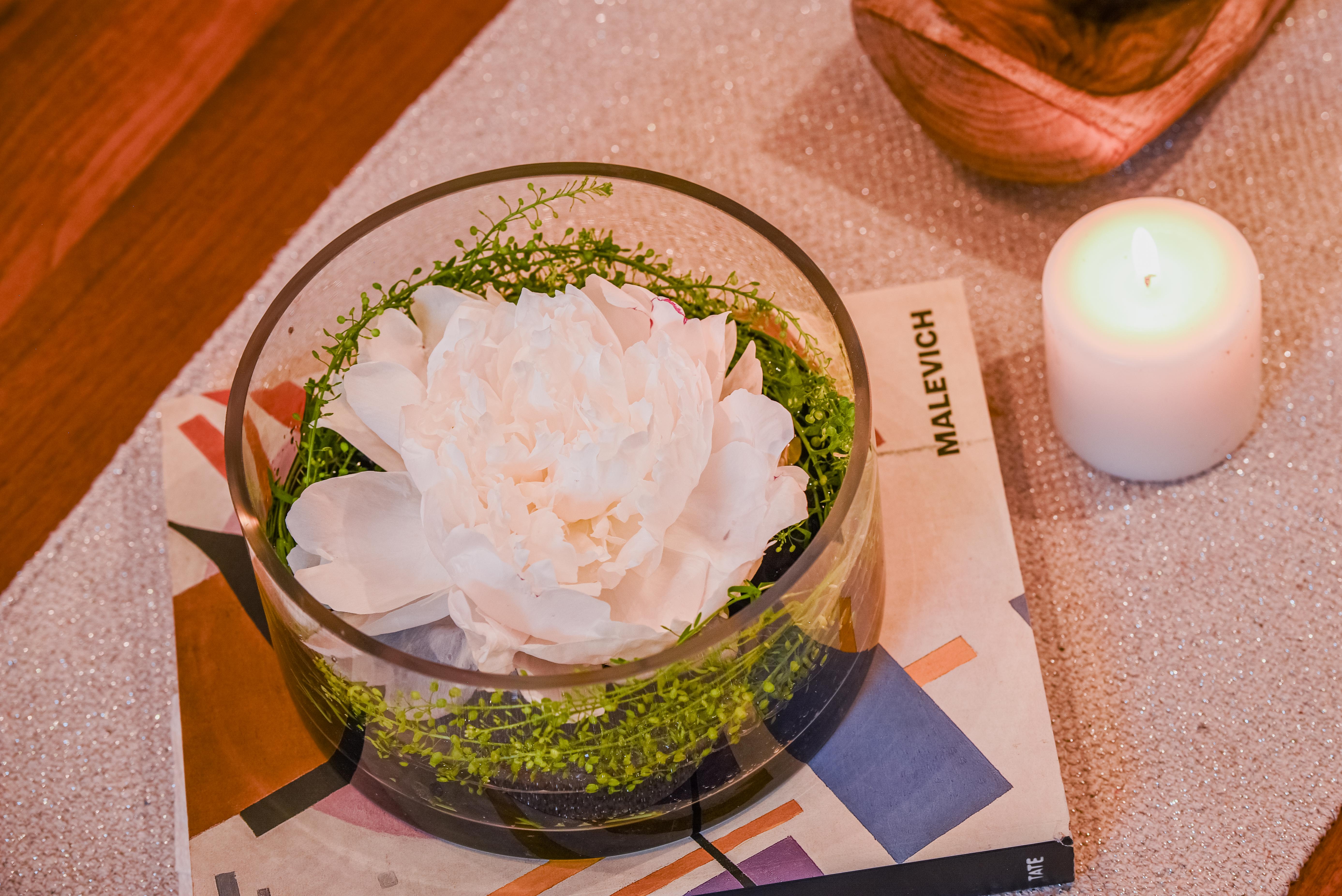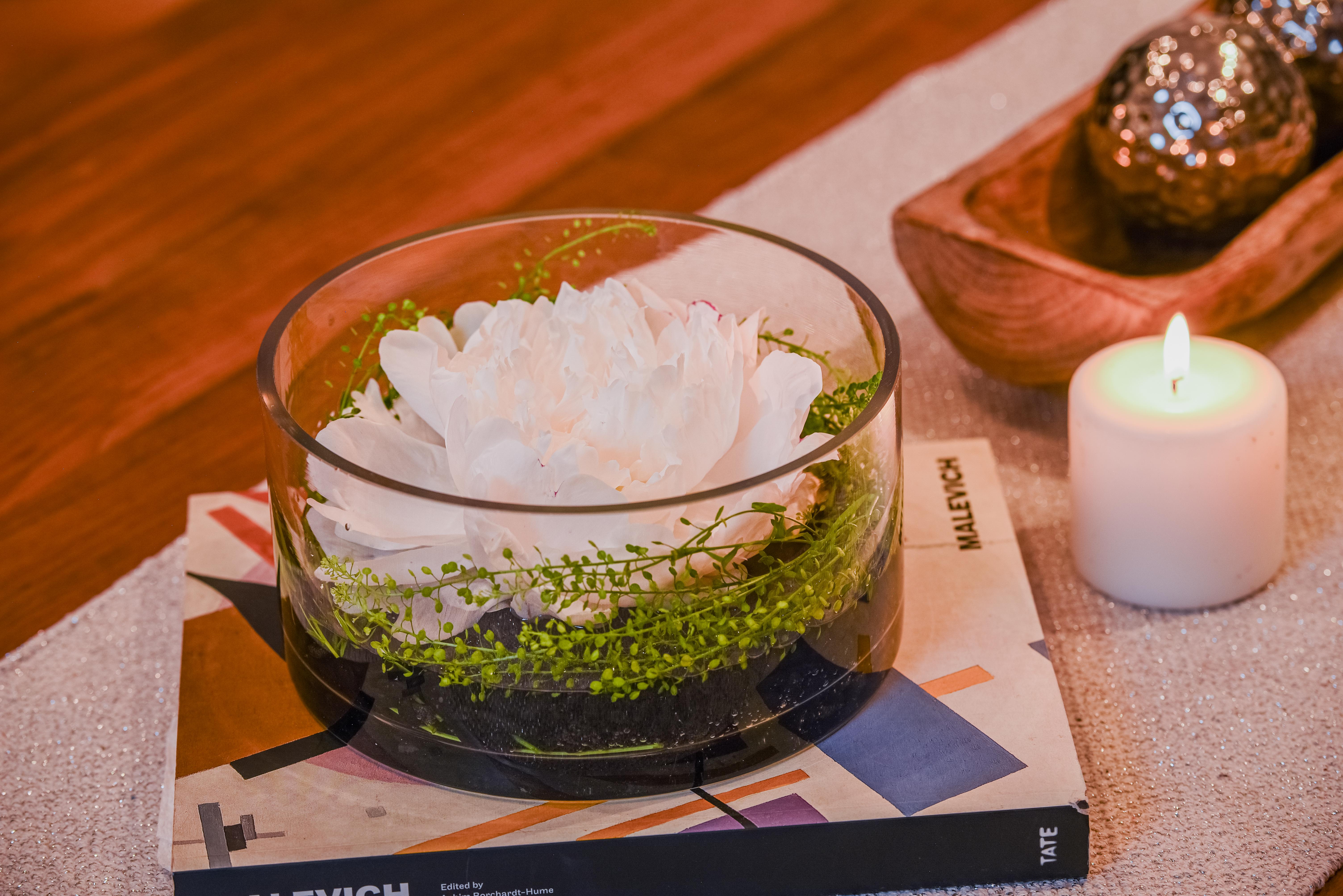 Behold the simple elegance of our “Peony Solace” arrangement, showcasing a single pristine white peony nestled in a circular glass vase. Surrounded by verdant greens and polished rocks, this minimalist design brings a sense of tranquility and beauty to any desktop or tabletop. Perfect for creating a serene ambiance, this arrangement is available for same-day delivery from Beverly Hills Florist.
